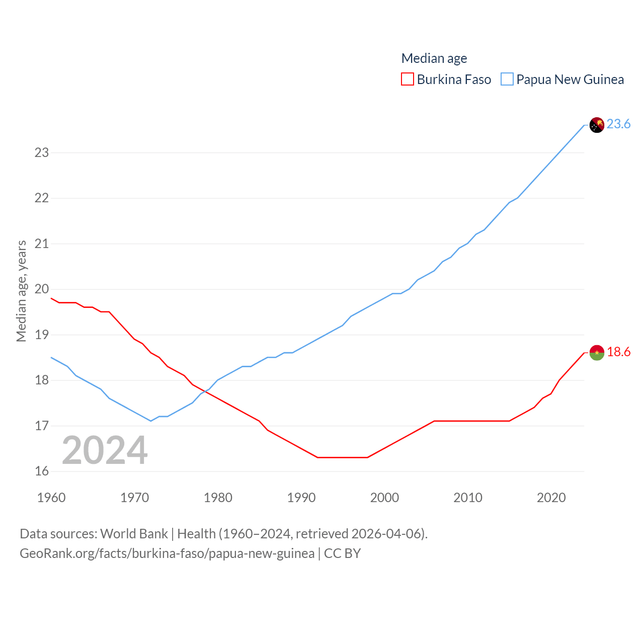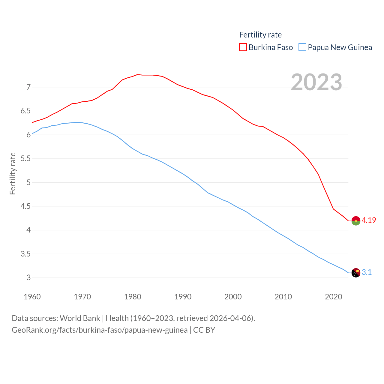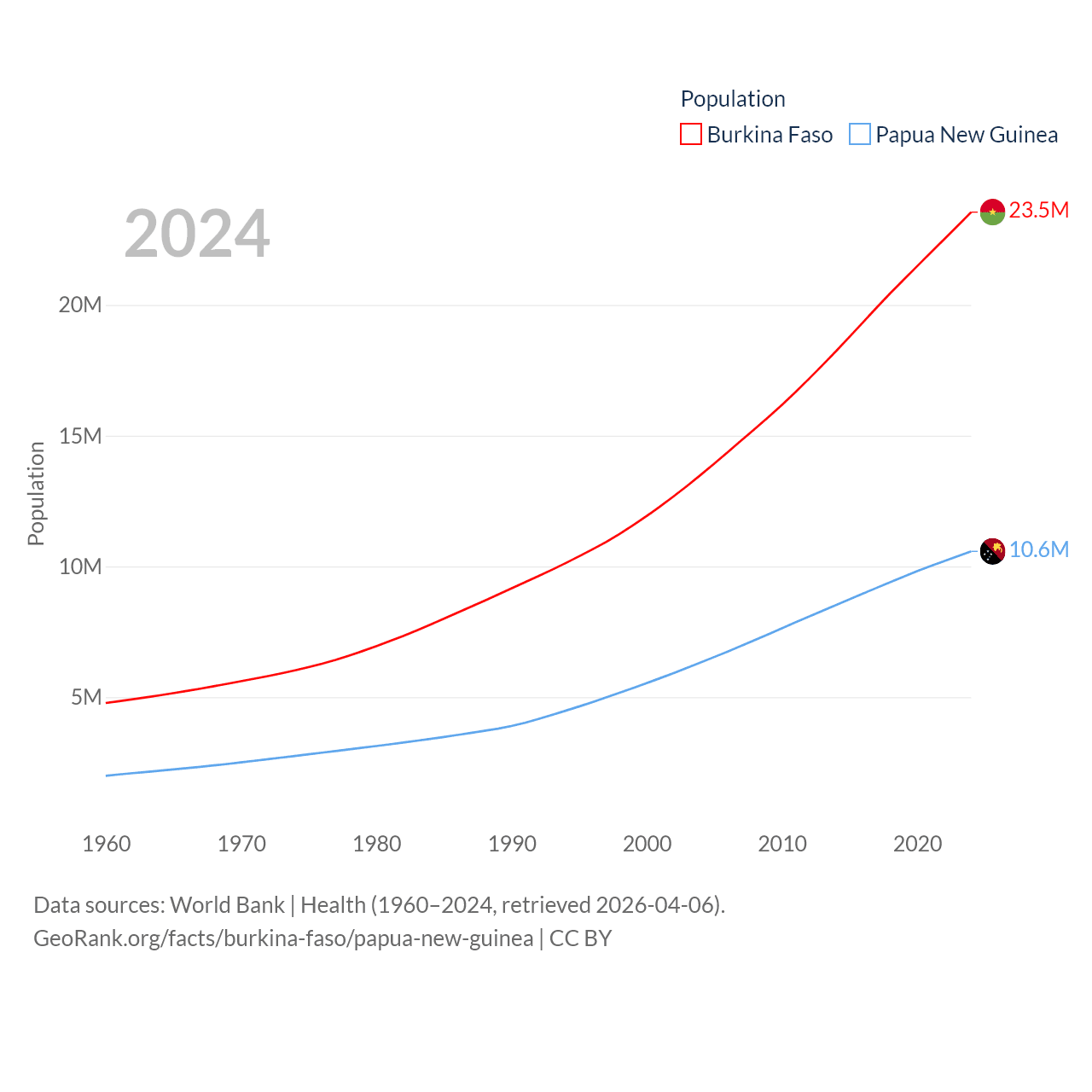 Burkina Faso has a population of 23.5M (ranked 59/197), compared with 10.6M in Papua New Guinea (ranked 92/197). Burkina Faso's land area is 105,638 sq mi versus 174,850 sq mi for Papua New Guinea (ranked 73rd vs. 54th).