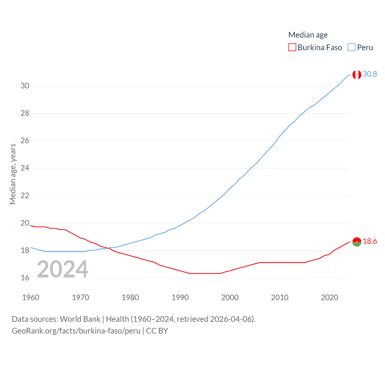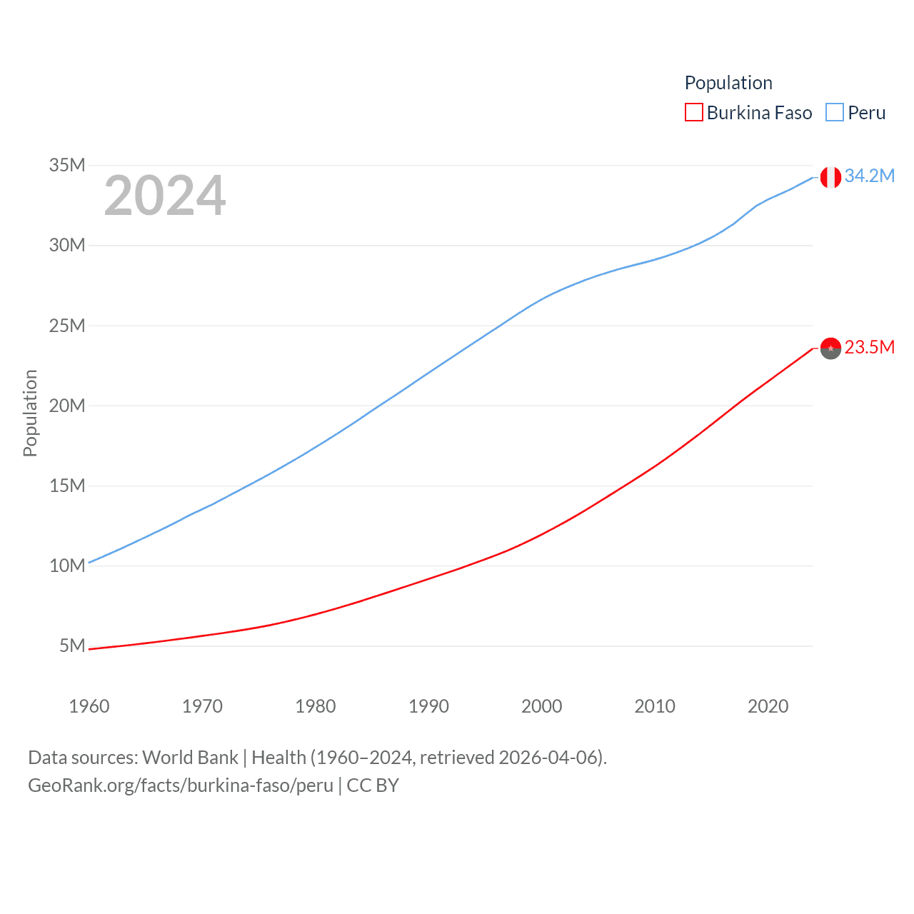 Burkina Faso has a population of 23.5M (ranked 59/197), compared with 34.2M in Peru (ranked 48/197). Burkina Faso's land area is 105,638 sq mi versus 494,211 sq mi for Peru (ranked 73rd vs. 19th).