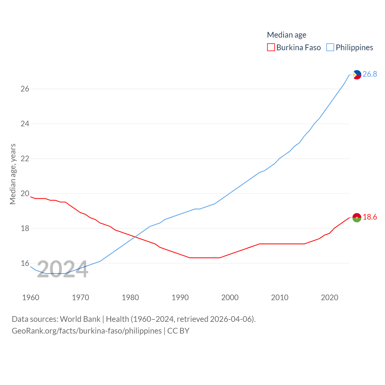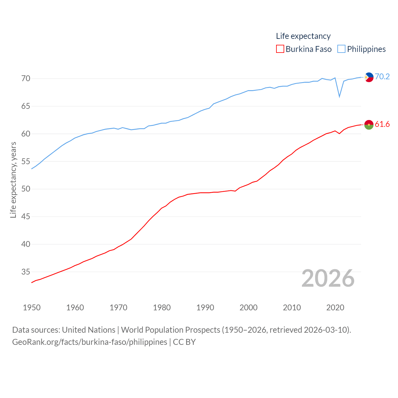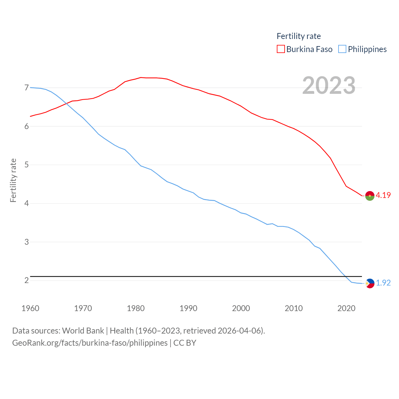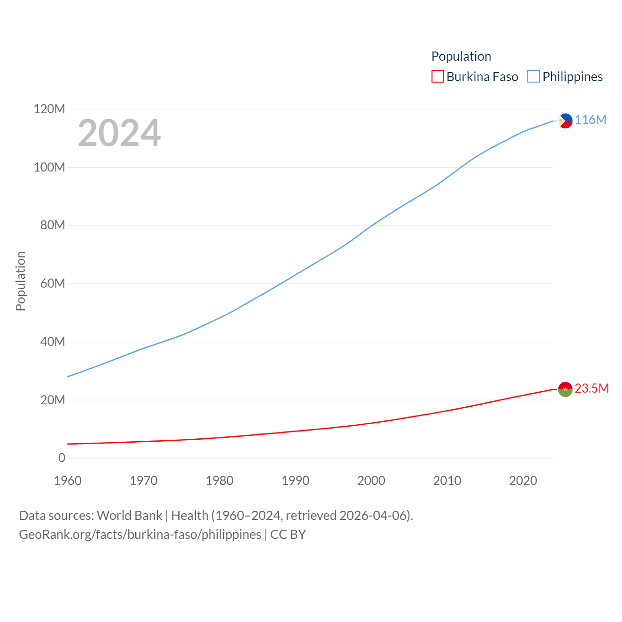 Burkina Faso has a population of 23.5M (ranked 59/197), compared with 116M in The Philippines (ranked 14/197). Burkina Faso's land area is 105,638 sq mi versus 115,124 sq mi for The Philippines (ranked 73rd vs. 71st).