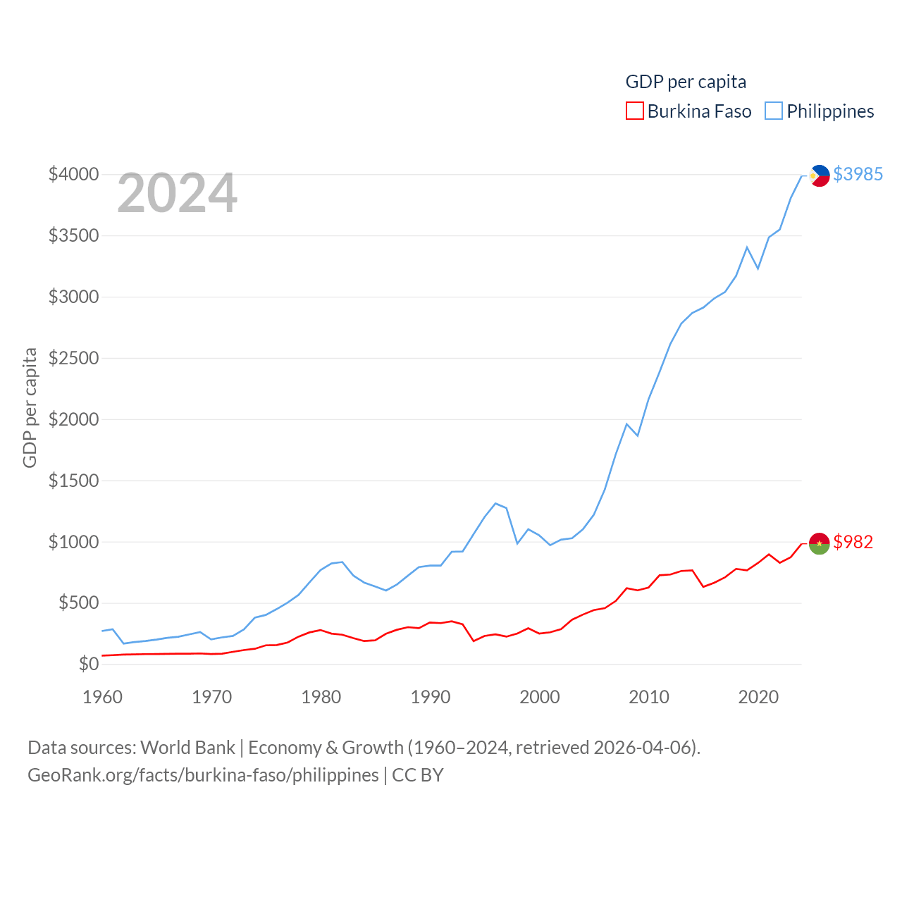 By GDP, Burkina Faso ranks 122/197 ($23.1B) and The Philippines ranks 35/197 ($462B). By GDP per capita, Burkina Faso ranks 180/197 ($982), while The Philippines ranks 130/197 ($3,985).