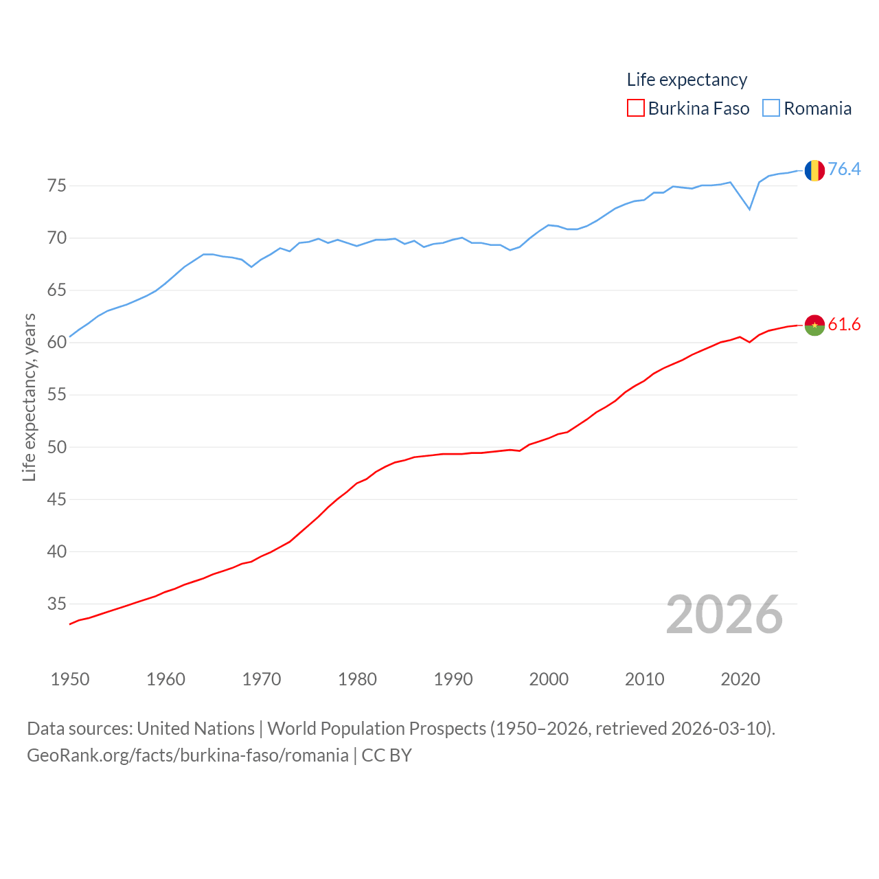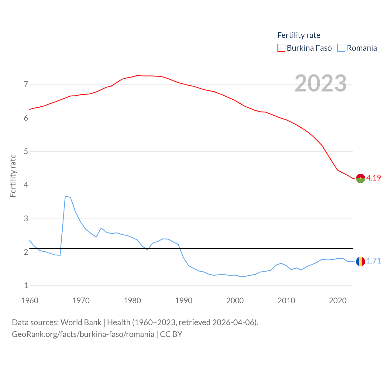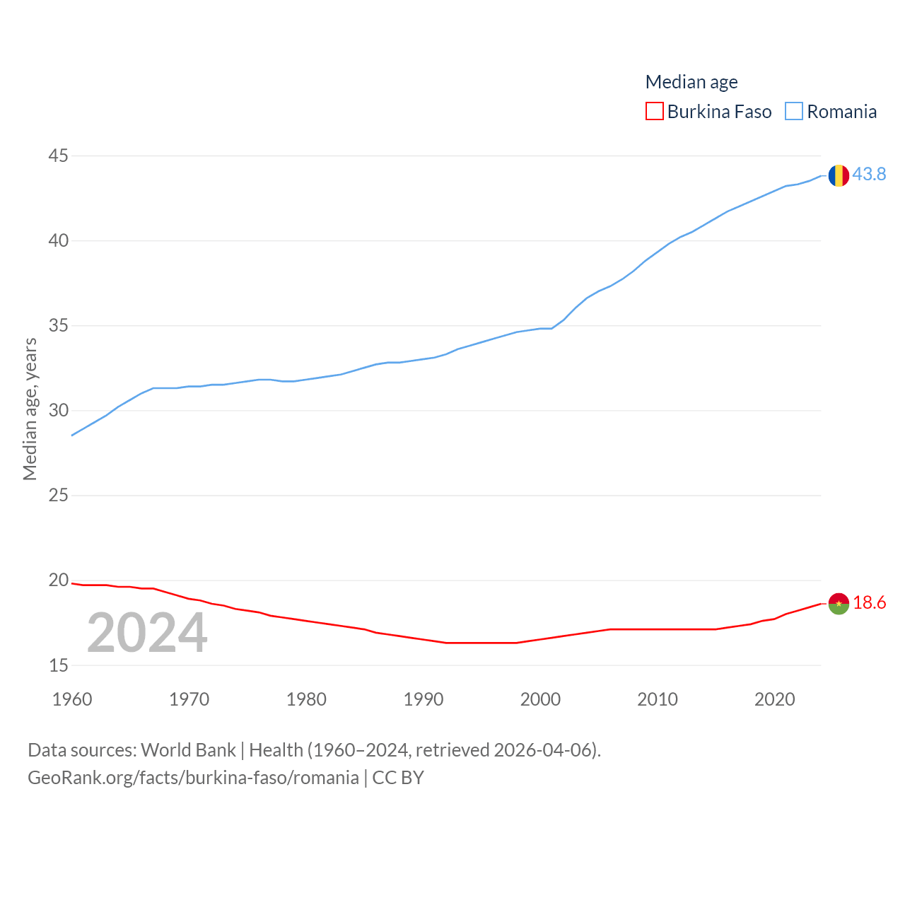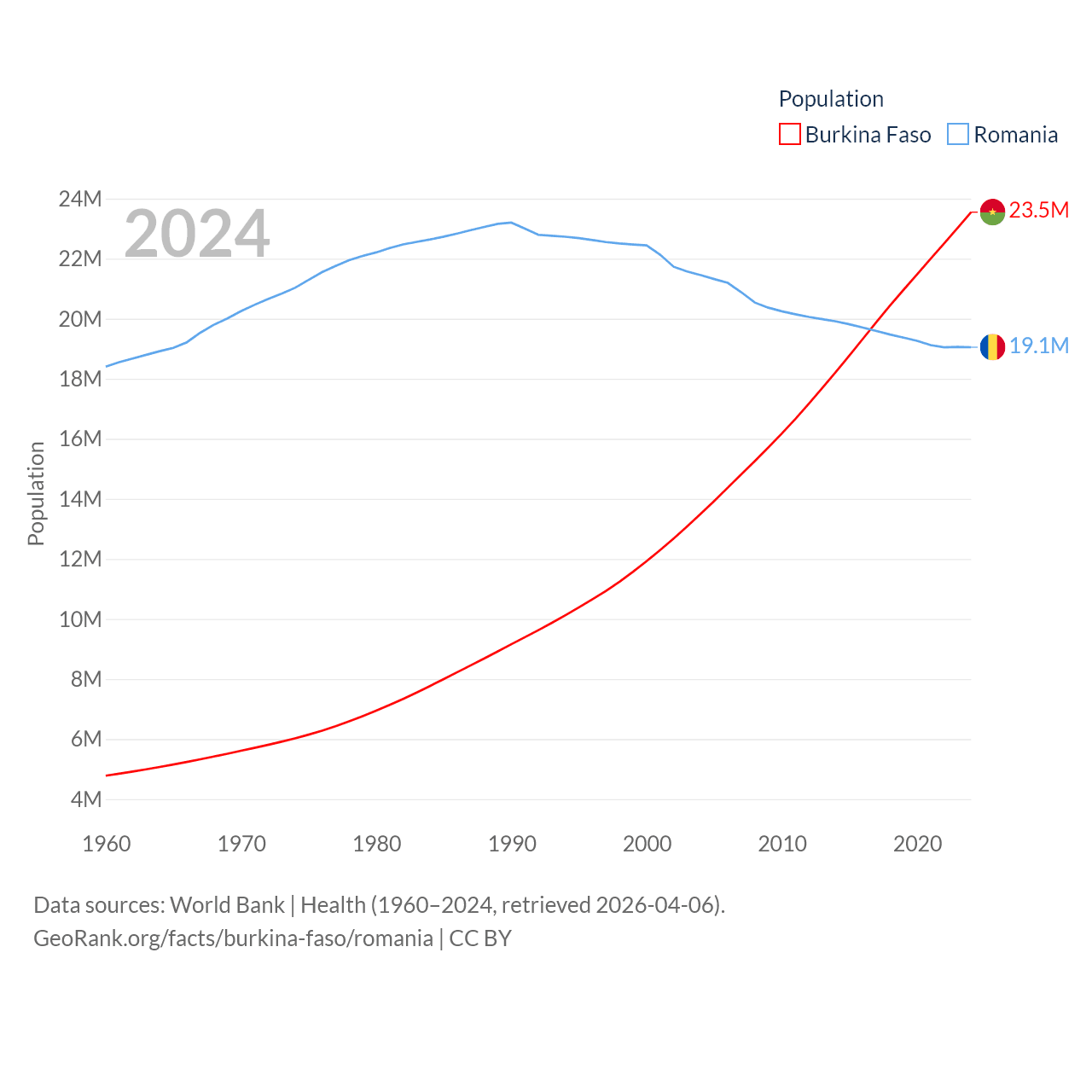 Burkina Faso has a population of 23.5M (ranked 59/197), compared with 19.1M in Romania (ranked 67/197). Burkina Faso's land area is 105,638 sq mi versus 88,834 sq mi for Romania (ranked 73rd vs. 80th).