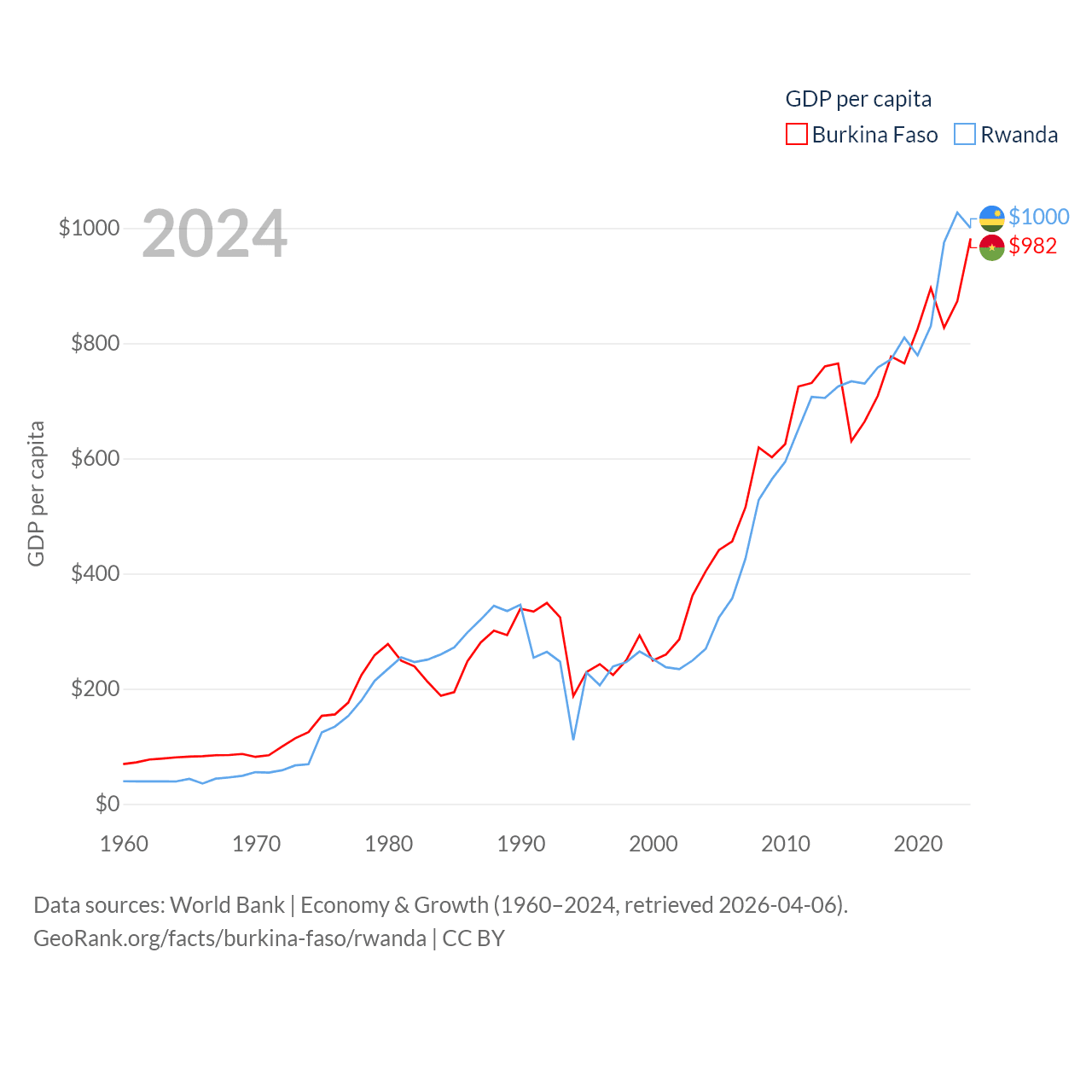 By GDP, Burkina Faso ranks 122/197 ($23.1B) and Rwanda ranks 144/197 ($14.3B). By GDP per capita, Burkina Faso ranks 180/197 ($982), while Rwanda ranks 178/197 ($1,000).