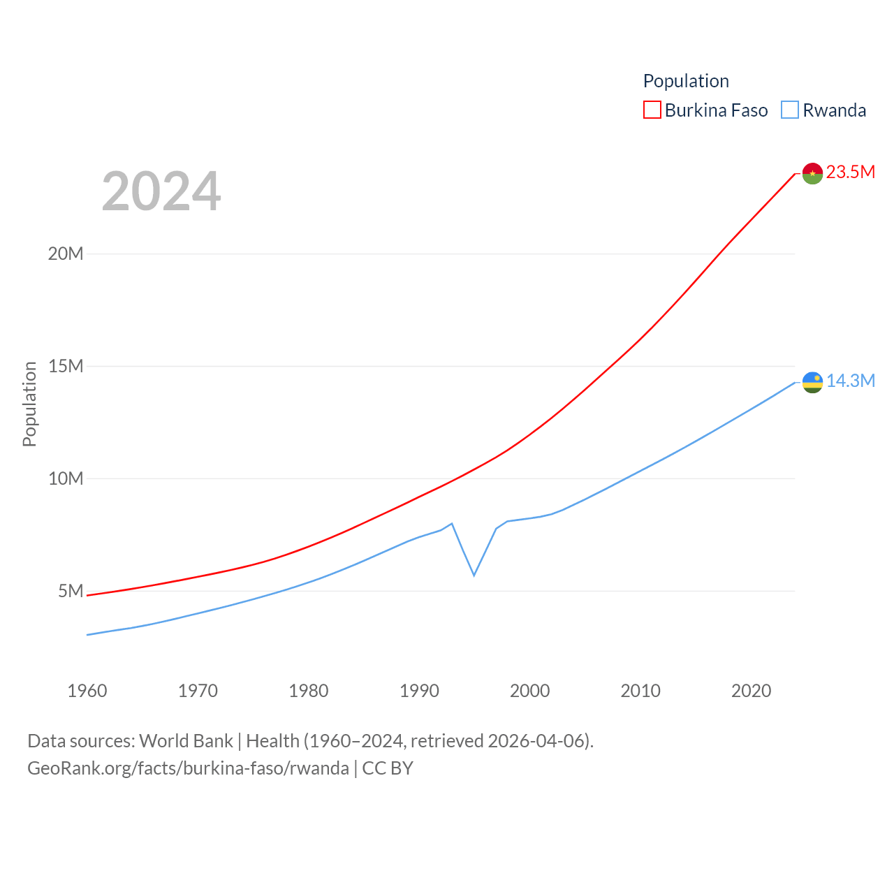 Burkina Faso has a population of 23.5M (ranked 59/197), compared with 14.3M in Rwanda (ranked 77/197). Burkina Faso's land area is 105,638 sq mi versus 9,525 sq mi for Rwanda (ranked 73rd vs. 146th).