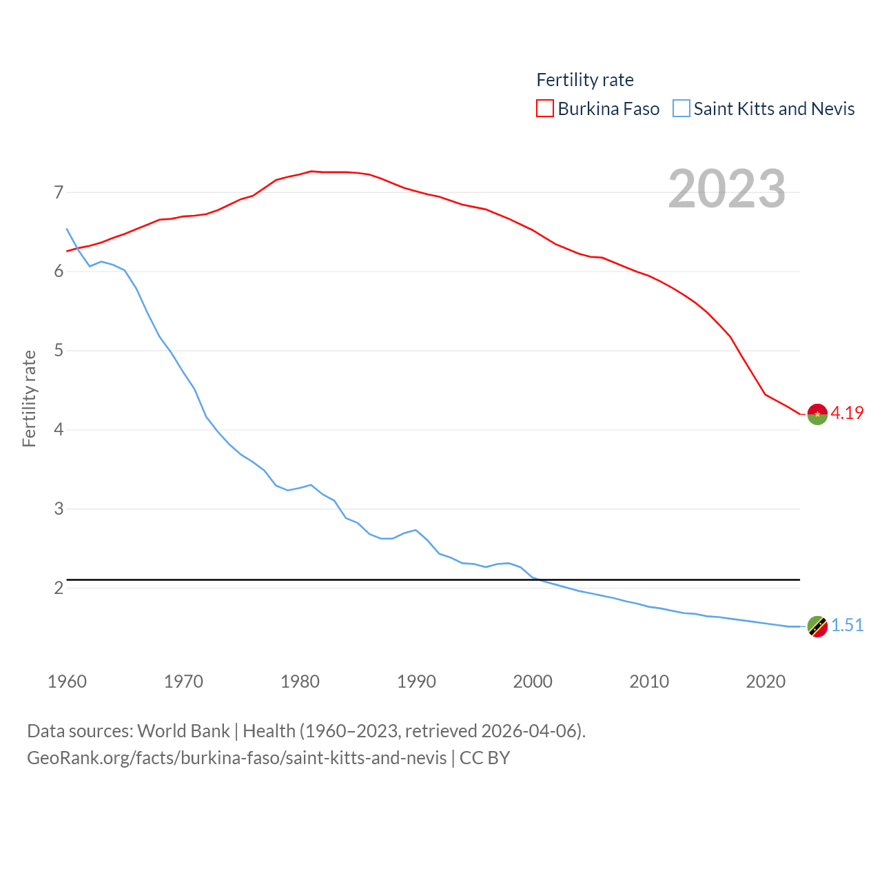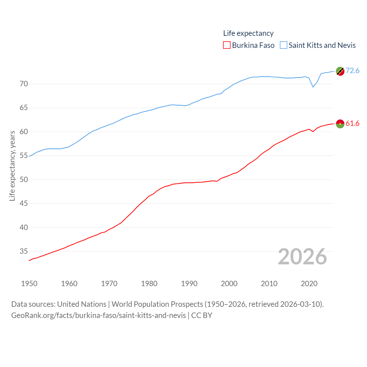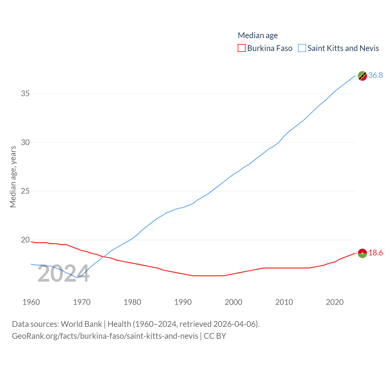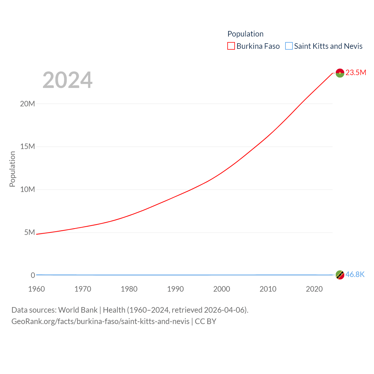 Burkina Faso has a population of 23.5M (ranked 59/197), compared with 46.8K in Saint Kitts and Nevis (ranked 189/197). Burkina Faso's land area is 105,638 sq mi versus 100.4 sq mi for Saint Kitts and Nevis (ranked 73rd vs. 189th).
