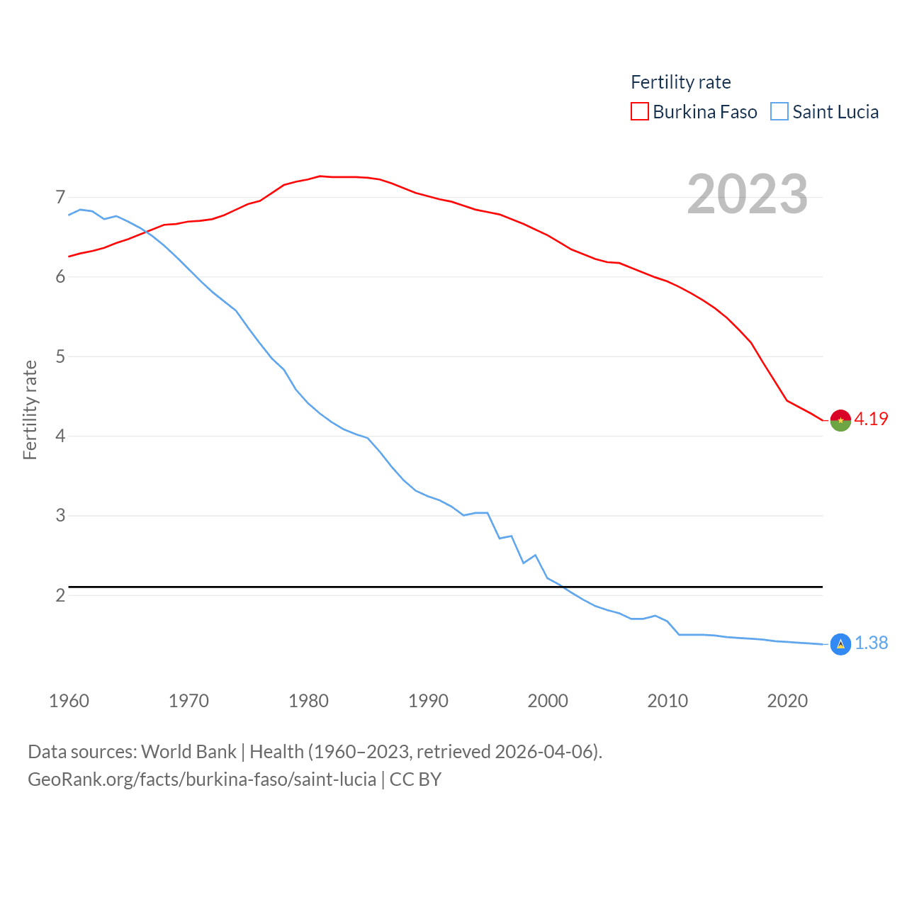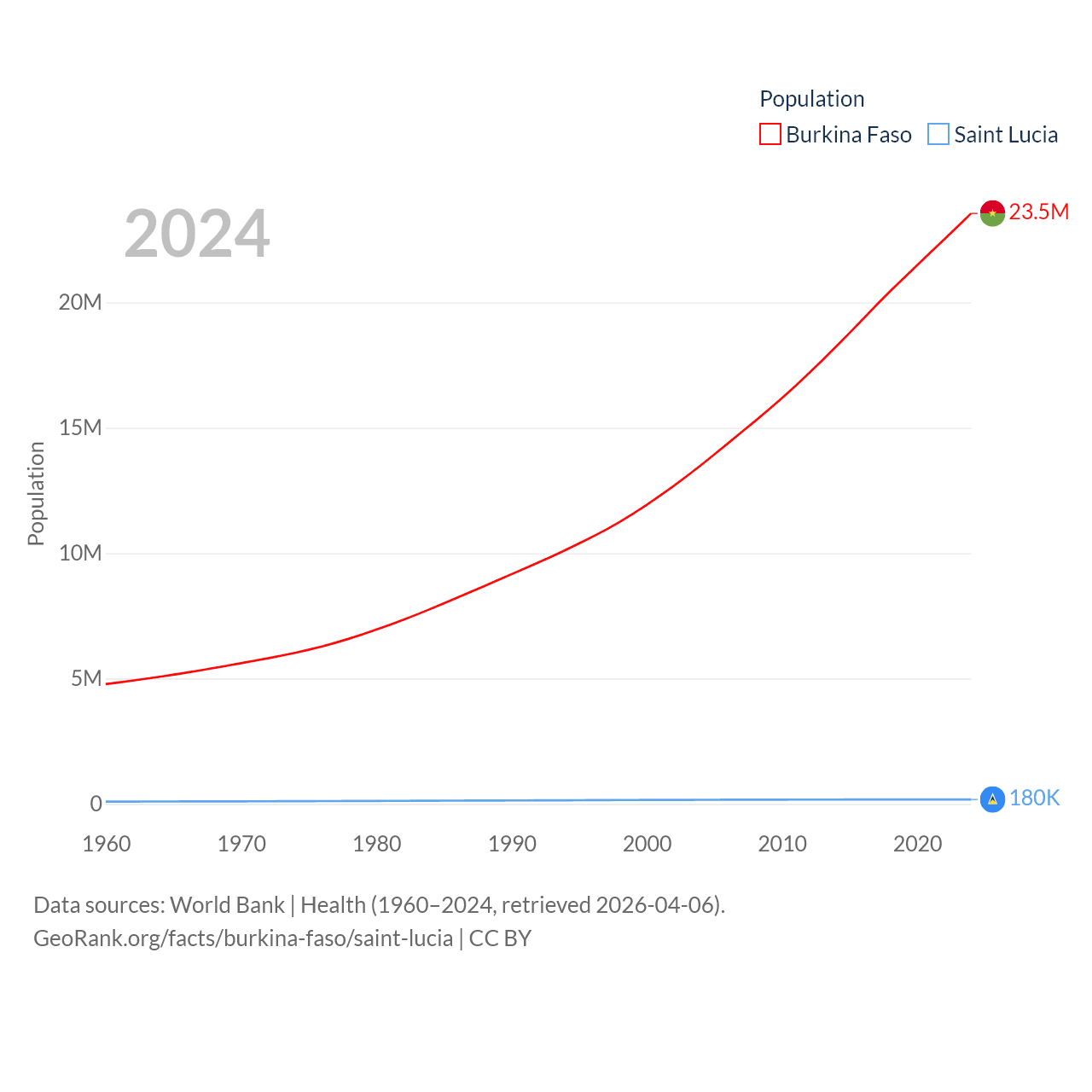 Burkina Faso has a population of 23.5M (ranked 59/197), compared with 180K in Saint Lucia (ranked 178/197). Burkina Faso's land area is 105,638 sq mi versus 235.5 sq mi for Saint Lucia (ranked 73rd vs. 178th).