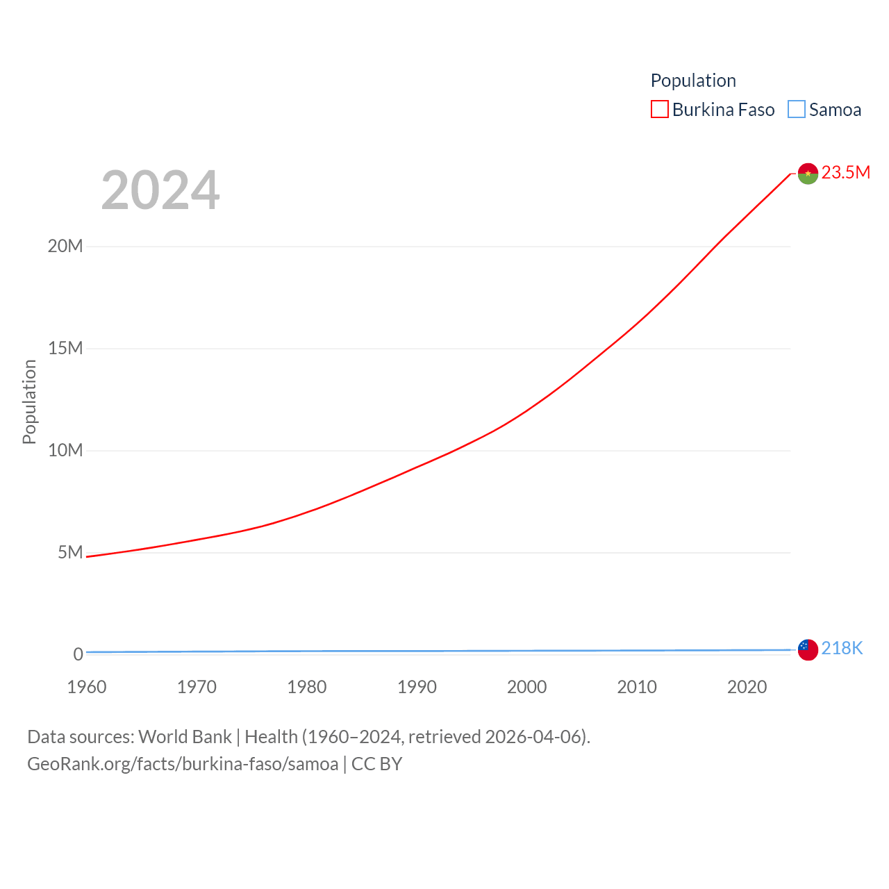 Burkina Faso has a population of 23.5M (ranked 59/197), compared with 218K in Samoa (ranked 177/197). Burkina Faso's land area is 105,638 sq mi versus 1,073 sq mi for Samoa (ranked 73rd vs. 168th).