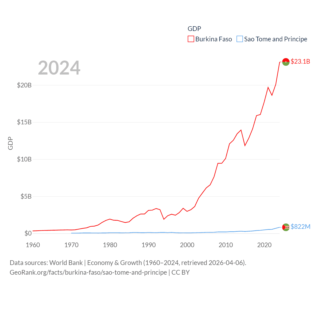 By GDP, Burkina Faso ranks 122/197 ($23.1B) and Sao Tome and Principe ranks 189/197 ($822M). By GDP per capita, Burkina Faso ranks 180/197 ($982), while Sao Tome and Principe ranks 134/197 ($3,491).