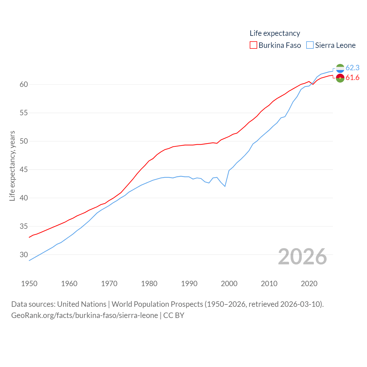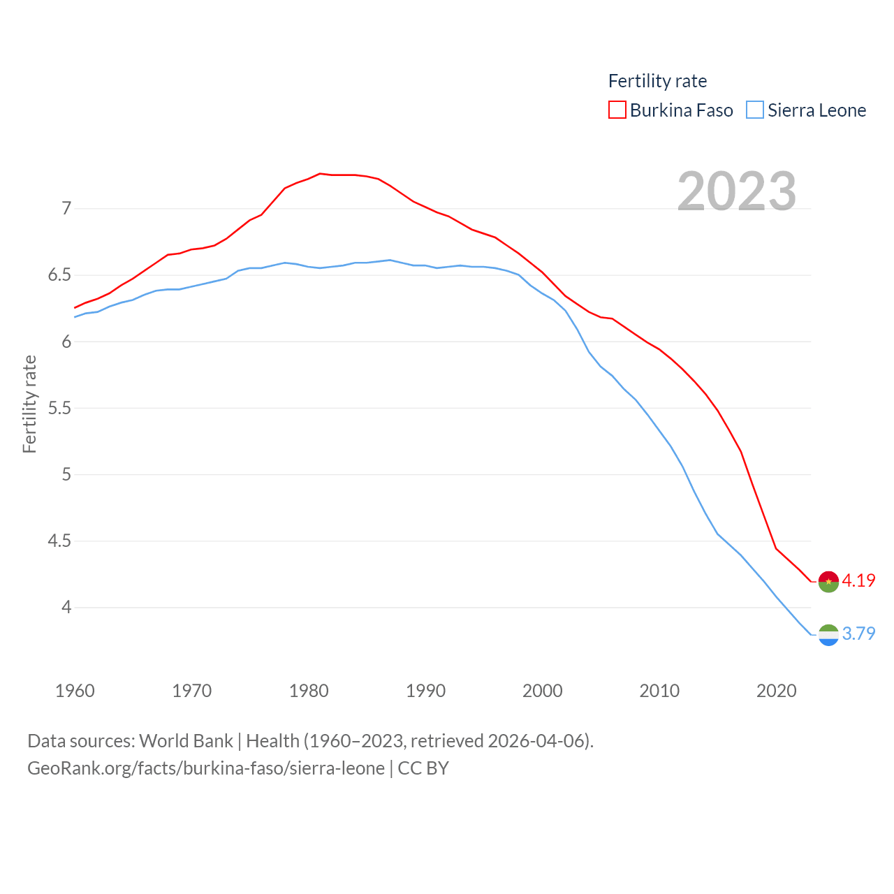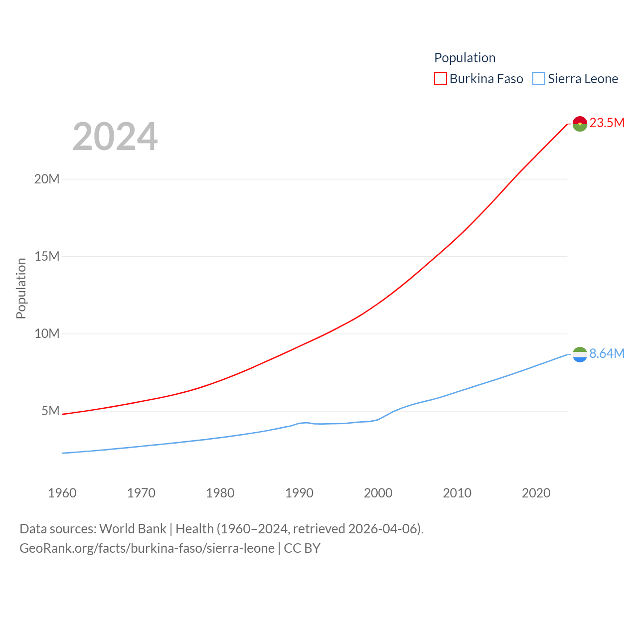 Burkina Faso has a population of 23.5M (ranked 59/197), compared with 8.64M in Sierra Leone (ranked 102/197). Burkina Faso's land area is 105,638 sq mi versus 27,869 sq mi for Sierra Leone (ranked 73rd vs. 116th).