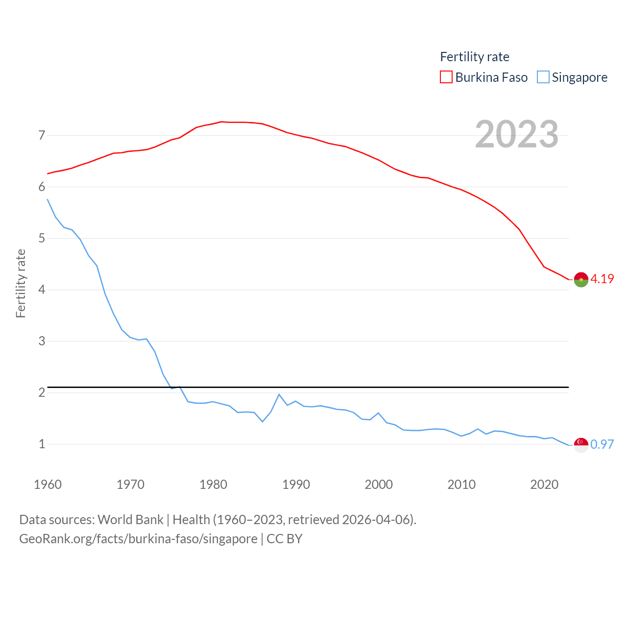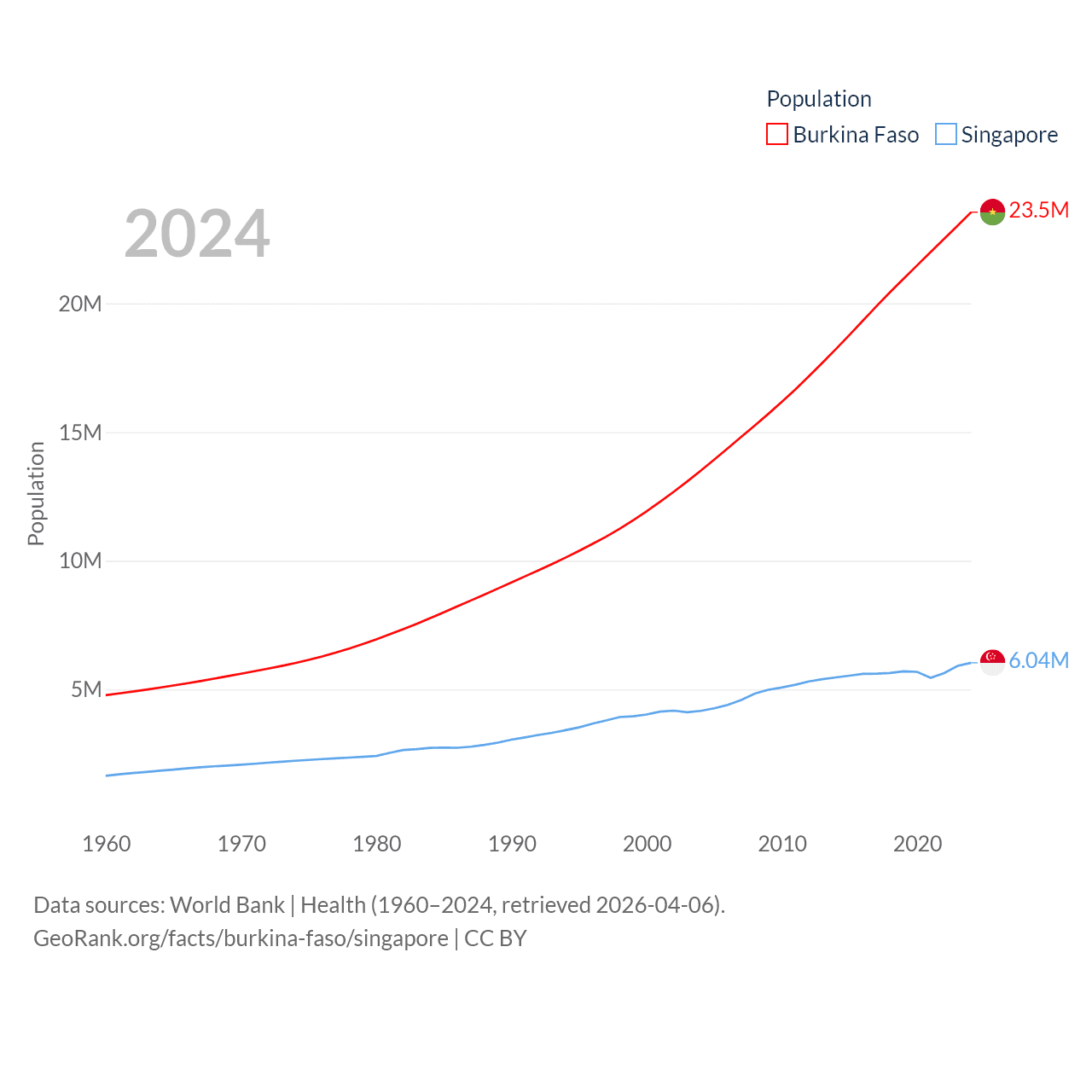 Burkina Faso has a population of 23.5M (ranked 59/197), compared with 6.04M in Singapore (ranked 113/197). Burkina Faso's land area is 105,638 sq mi versus 277.2 sq mi for Singapore (ranked 73rd vs. 177th).