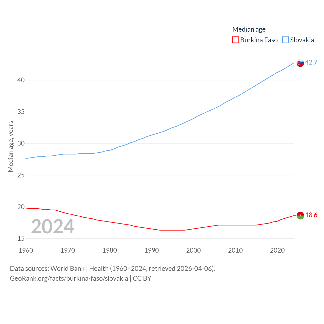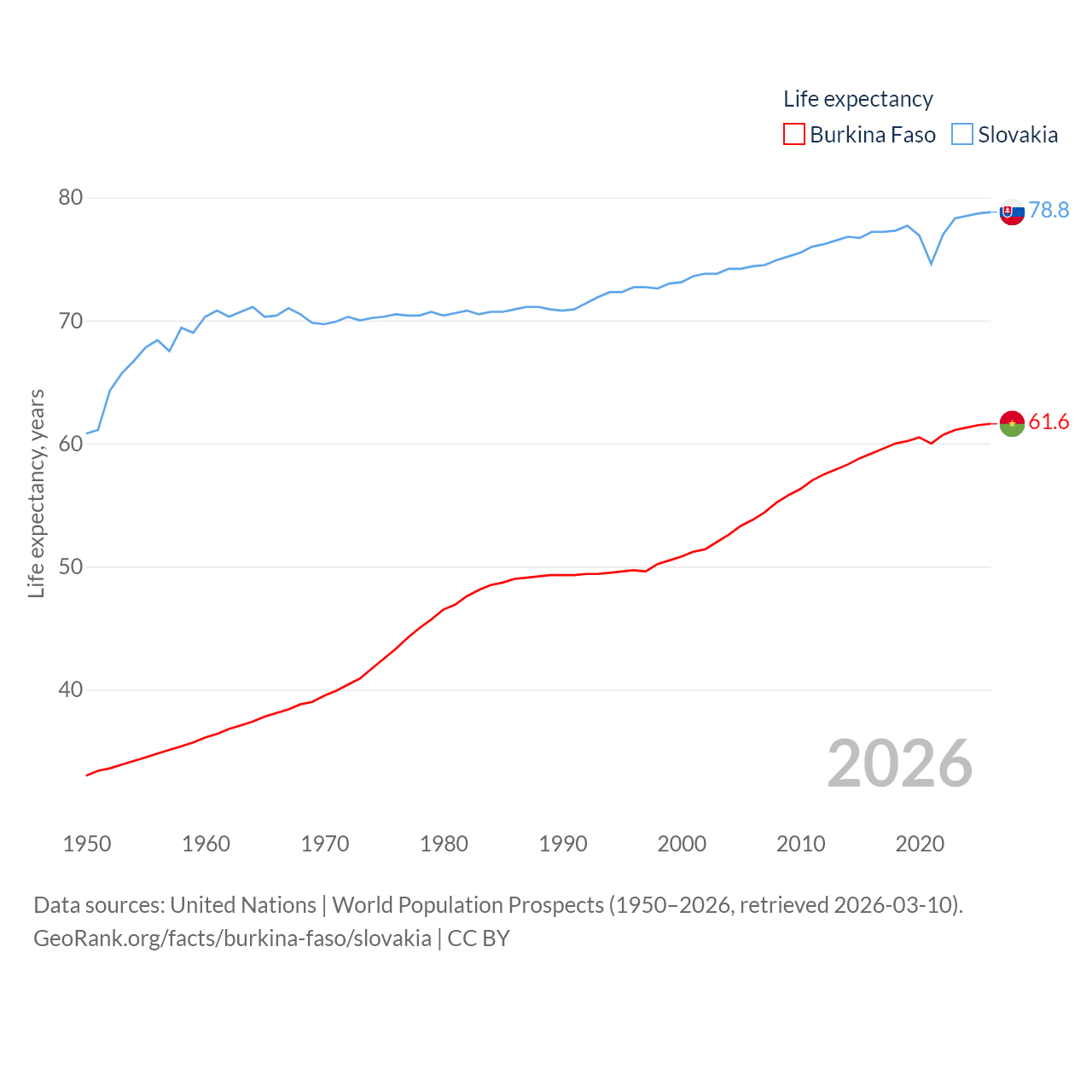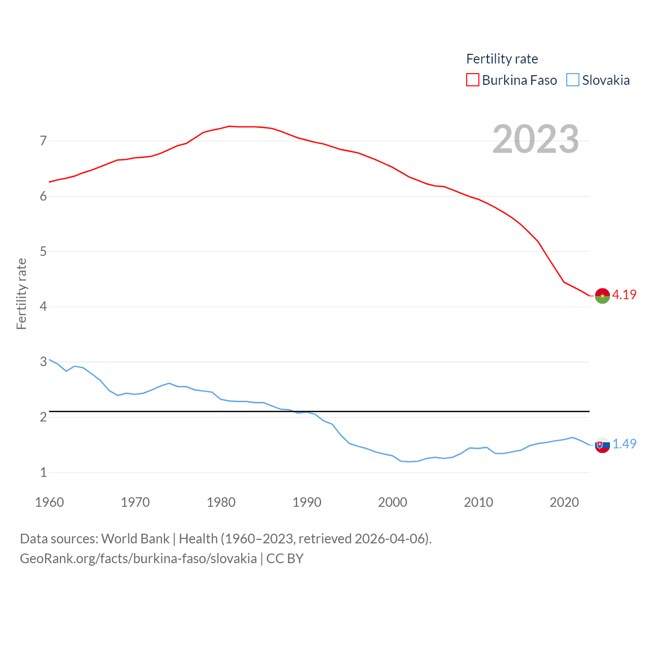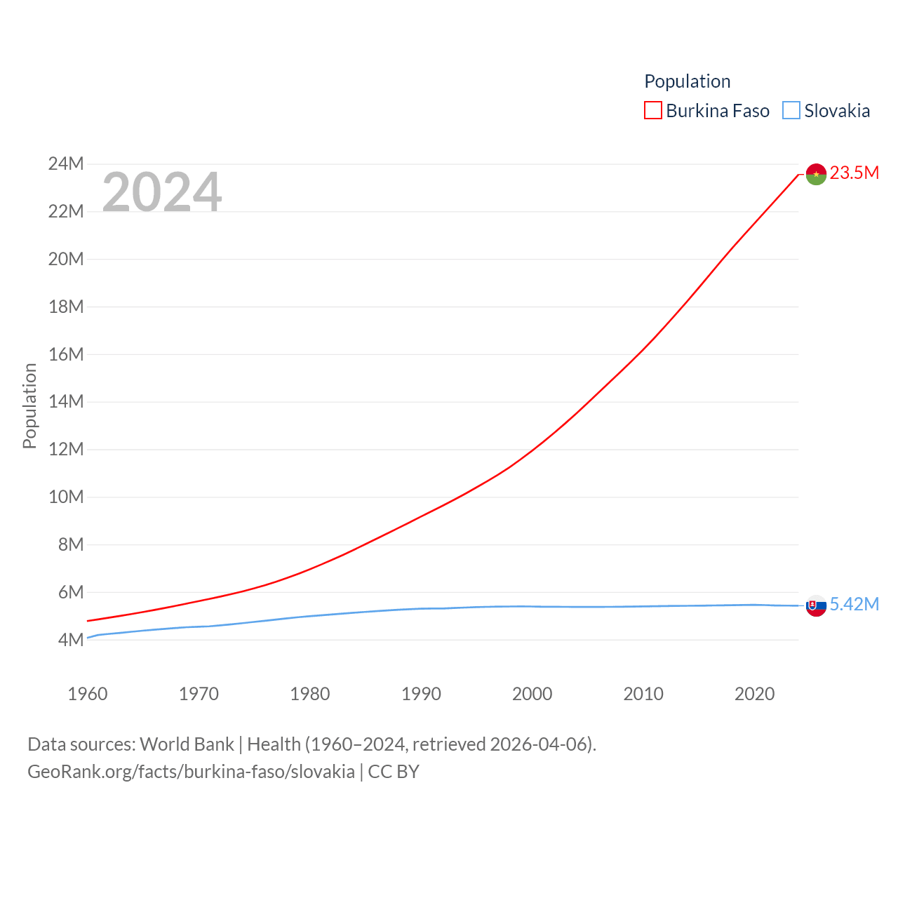 Burkina Faso has a population of 23.5M (ranked 59/197), compared with 5.42M in Slovakia (ranked 119/197). Burkina Faso's land area is 105,638 sq mi versus 18,564 sq mi for Slovakia (ranked 73rd vs. 128th).