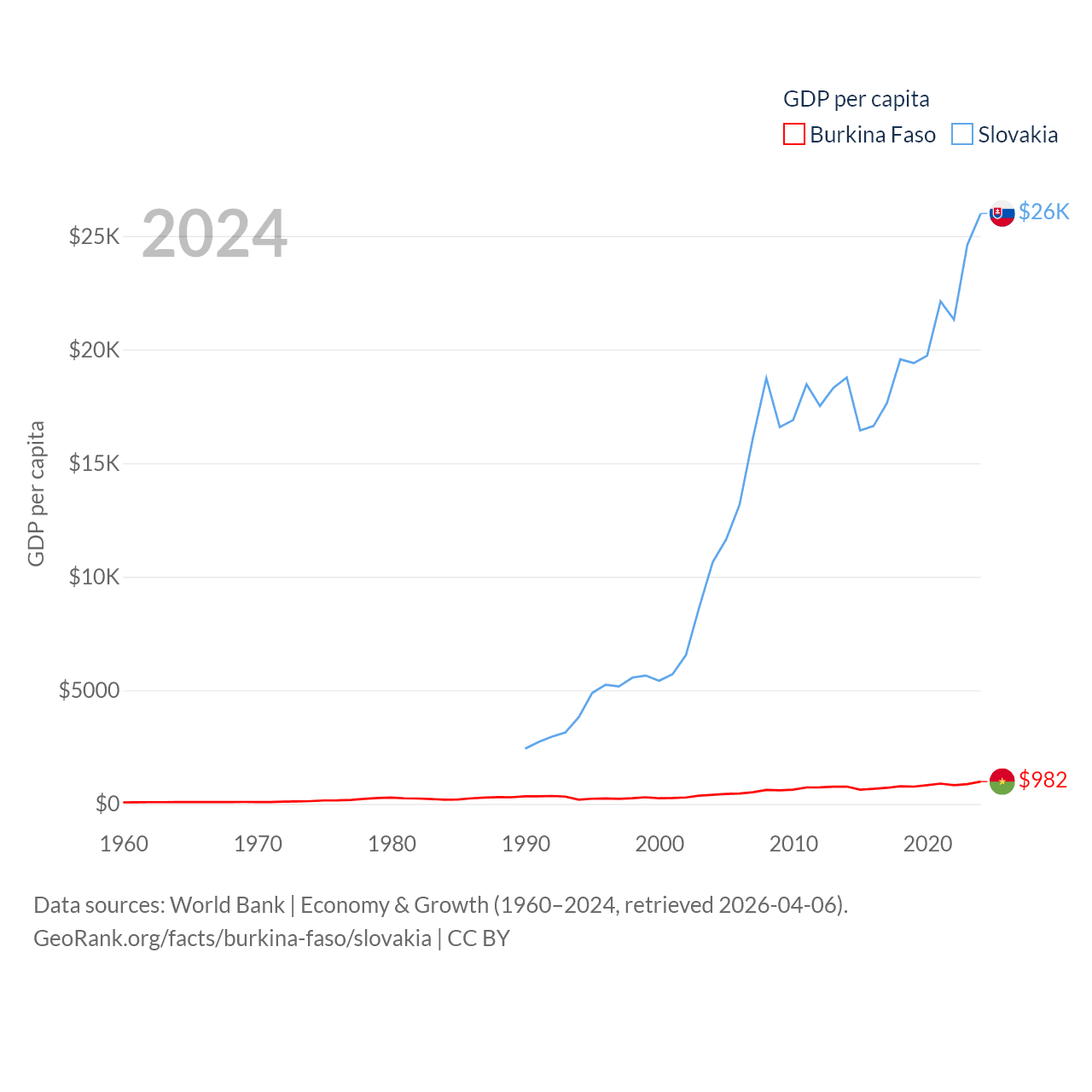 By GDP, Burkina Faso ranks 122/197 ($23.1B) and Slovakia ranks 61/197 ($141B). By GDP per capita, Burkina Faso ranks 180/197 ($982), while Slovakia ranks 47/197 ($25,993).