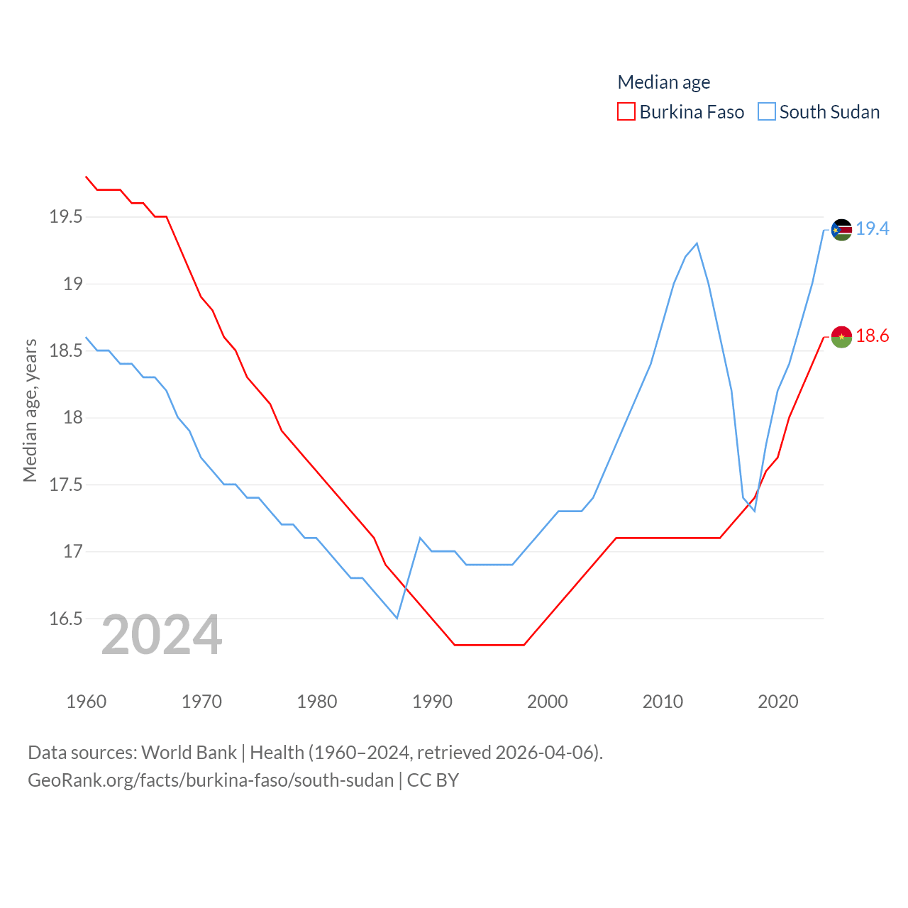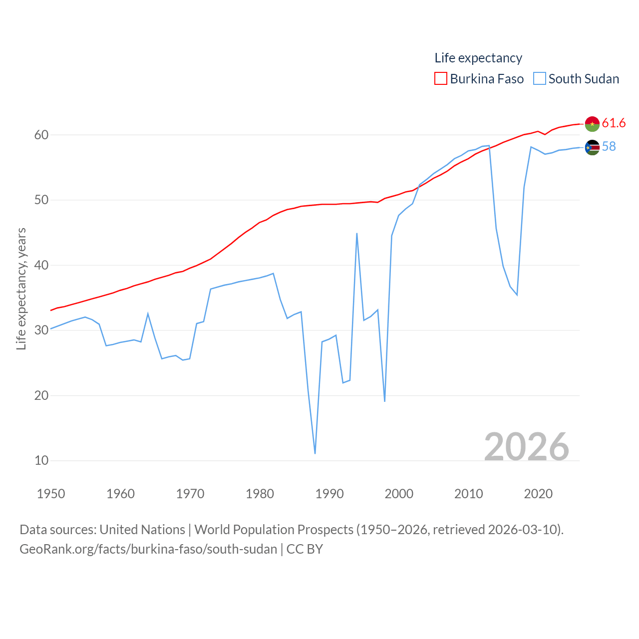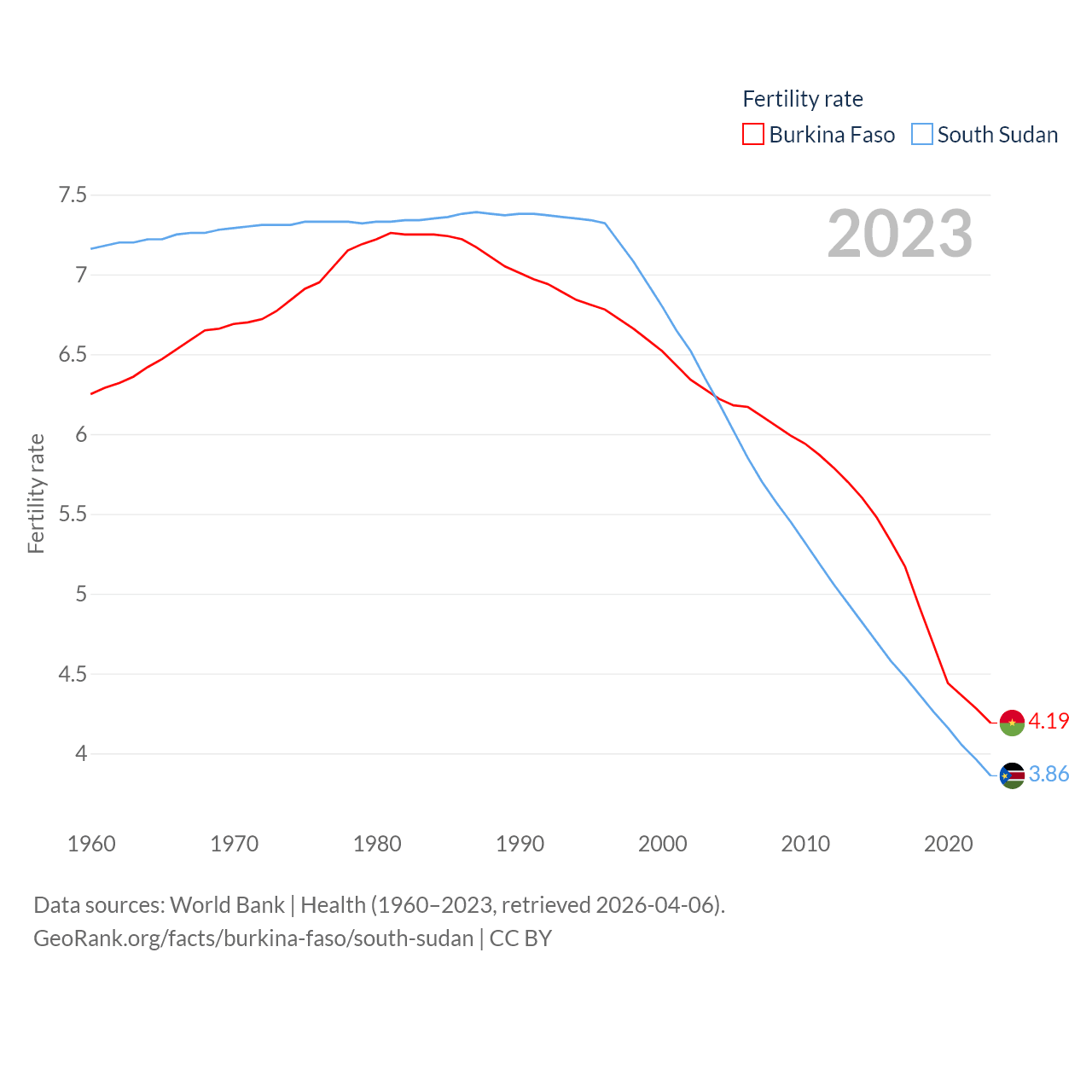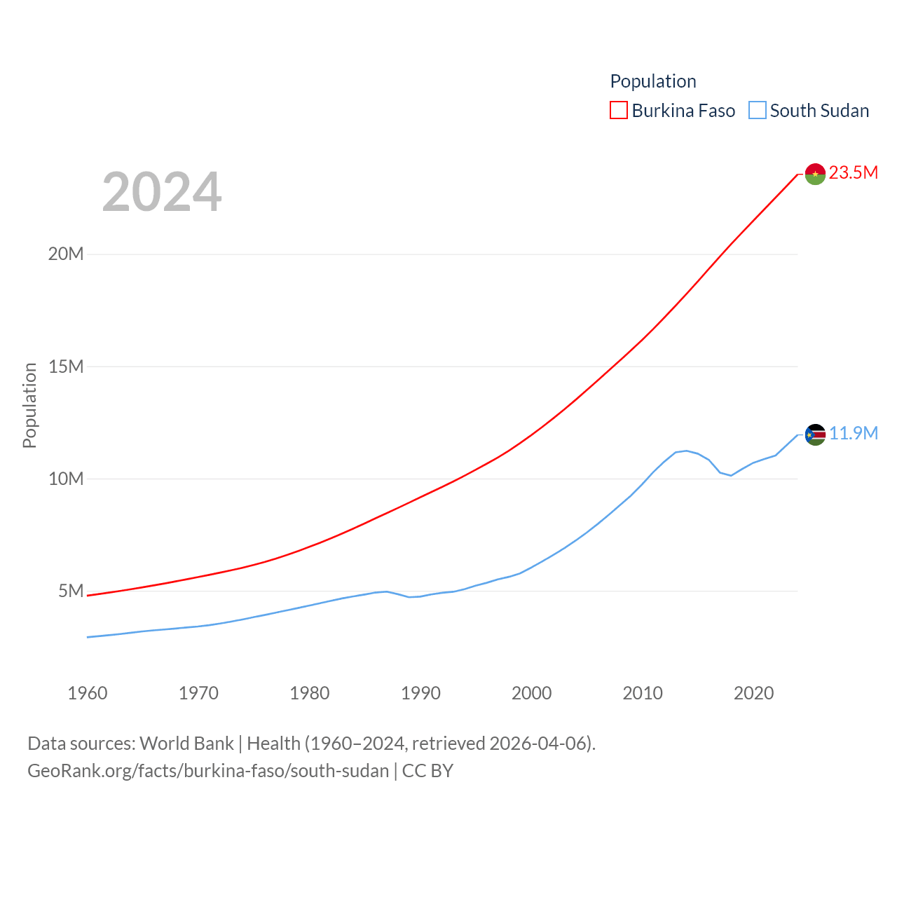 Burkina Faso has a population of 23.5M (ranked 59/197), compared with 11.9M in South Sudan (ranked 81/197). Burkina Faso's land area is 105,638 sq mi versus 243,990 sq mi for South Sudan (ranked 73rd vs. 41st).