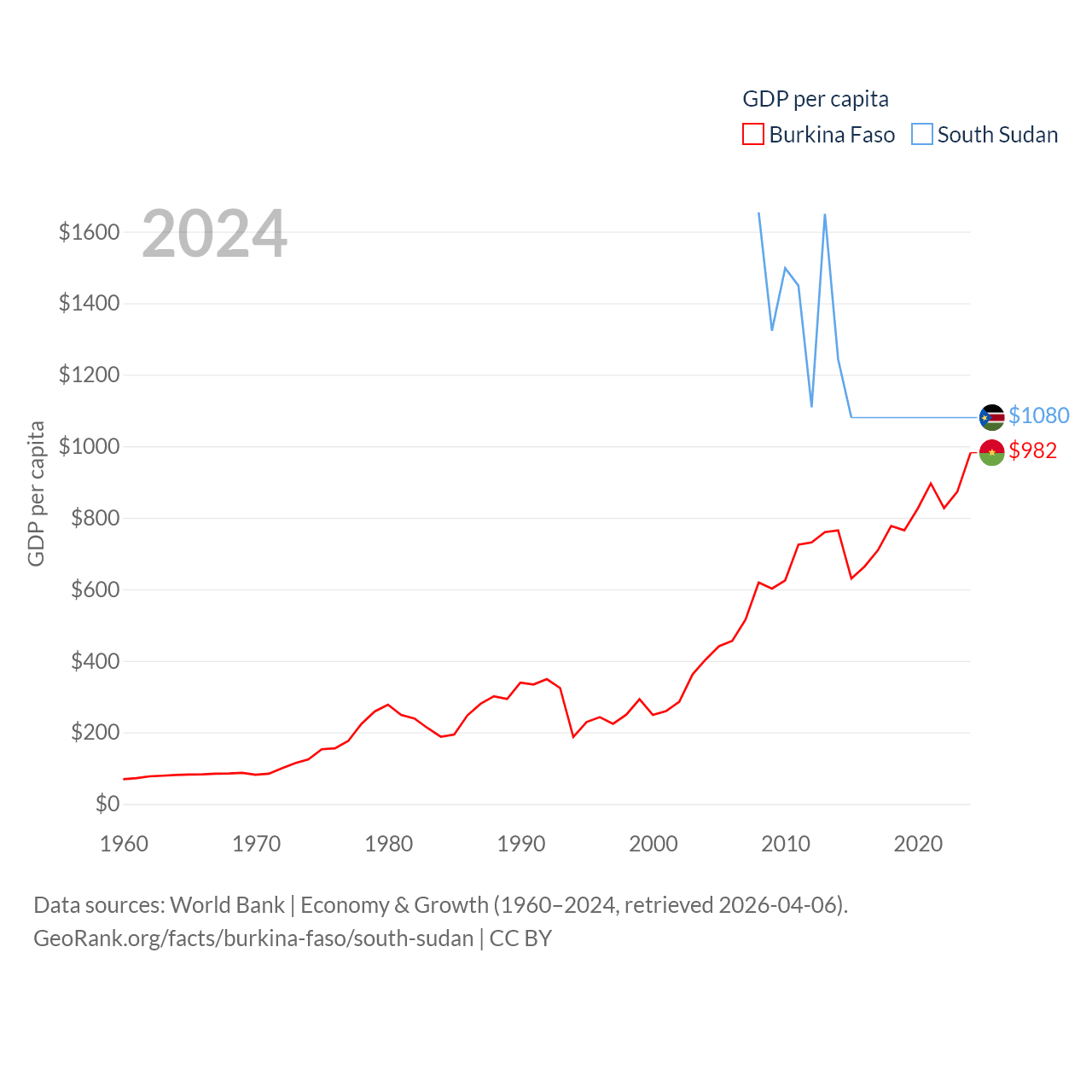 By GDP, Burkina Faso ranks 122/197 ($23.1B) and South Sudan ranks 149/197 ($12B). By GDP per capita, Burkina Faso ranks 180/197 ($982), while South Sudan ranks 175/197 ($1,080).