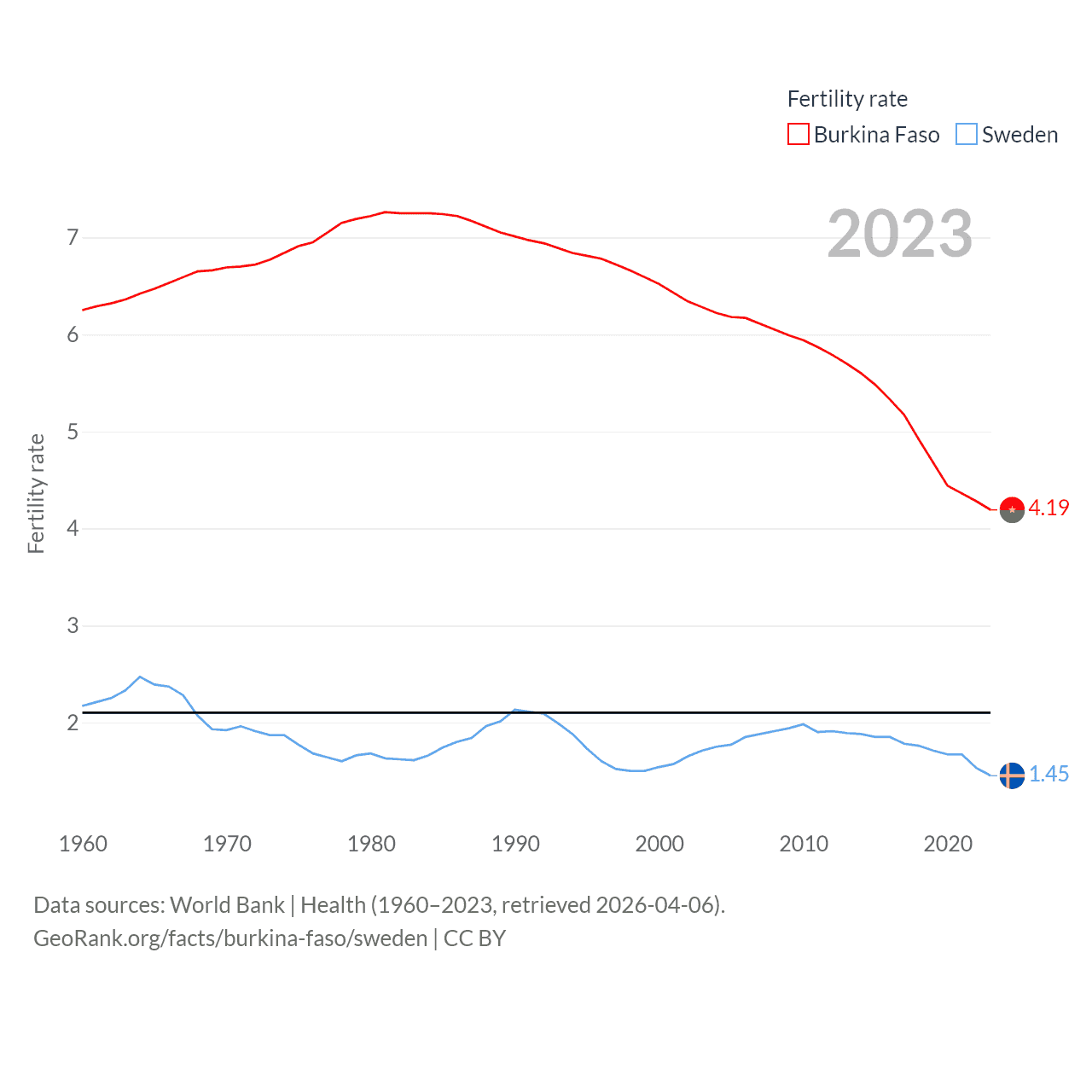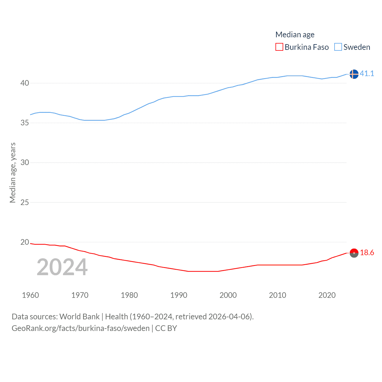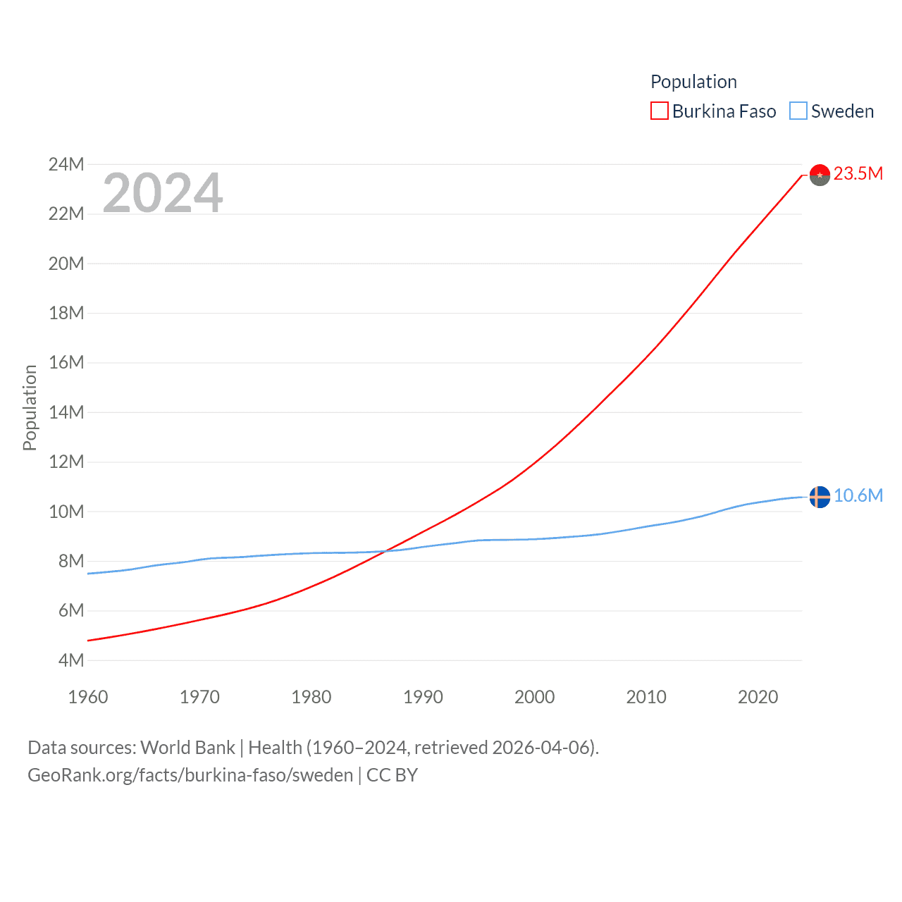 Burkina Faso has a population of 23.5M (ranked 59/197), compared with 10.6M in Sweden (ranked 93/197). Burkina Faso's land area is 105,638 sq mi versus 157,248 sq mi for Sweden (ranked 73rd vs. 58th).