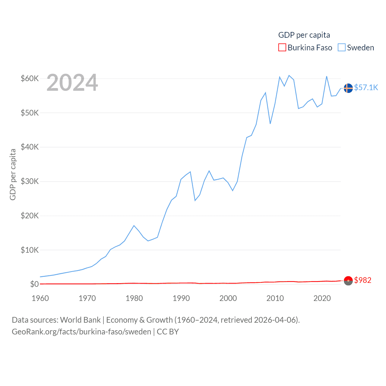 By GDP, Burkina Faso ranks 122/197 ($23.1B) and Sweden ranks 26/197 ($604B). By GDP per capita, Burkina Faso ranks 180/197 ($982), while Sweden ranks 17/197 ($57,117).