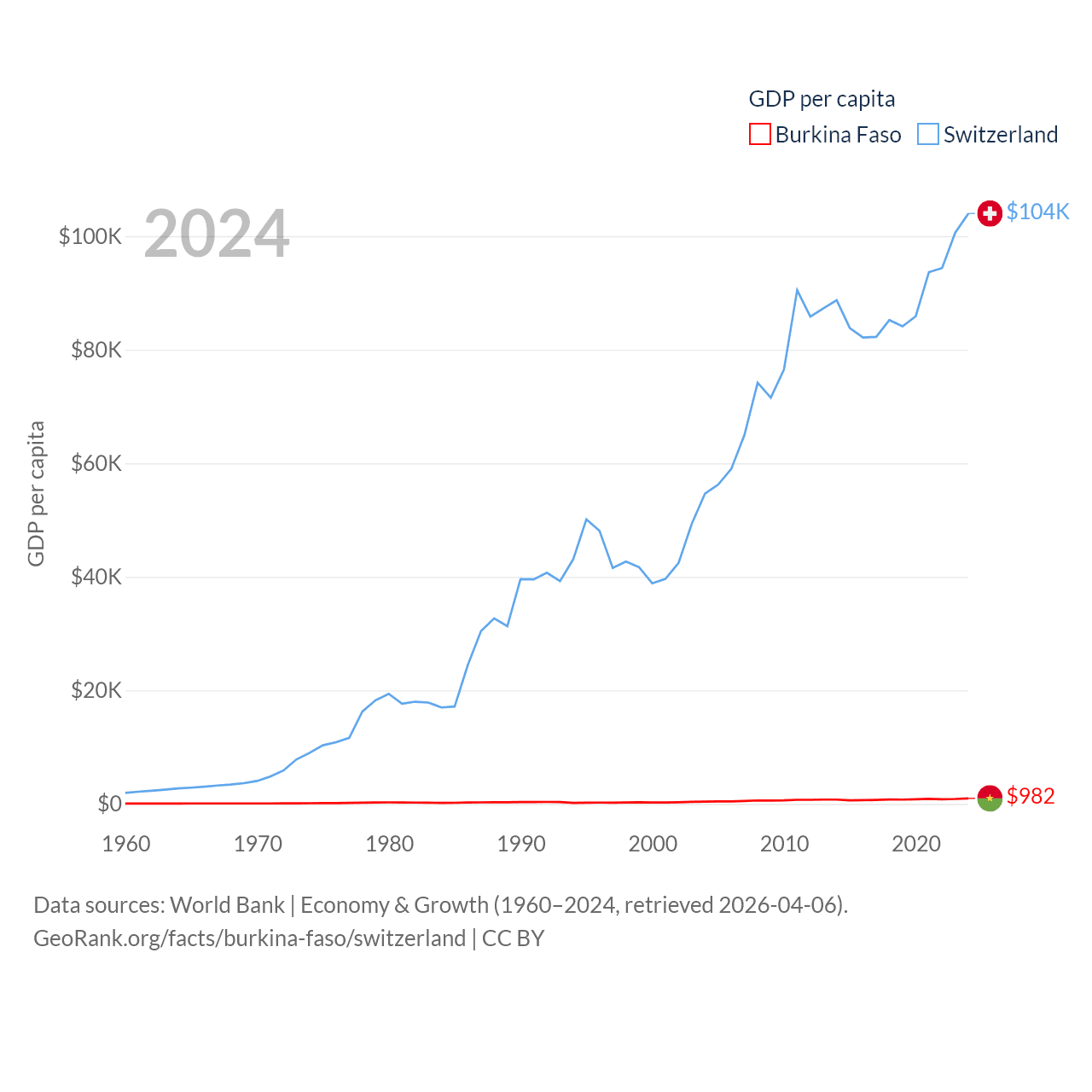 By GDP, Burkina Faso ranks 122/197 ($23.1B) and Switzerland ranks 20/197 ($937B). By GDP per capita, Burkina Faso ranks 180/197 ($982), while Switzerland ranks 5/197 ($103,998).