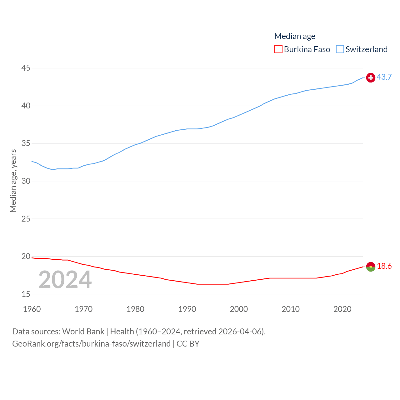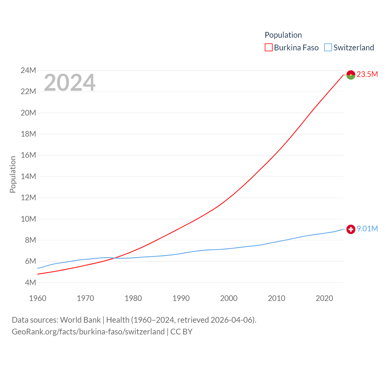 Burkina Faso has a population of 23.5M (ranked 59/197), compared with 9.01M in Switzerland (ranked 101/197). Burkina Faso's land area is 105,638 sq mi versus 15,255 sq mi for Switzerland (ranked 73rd vs. 131st).
