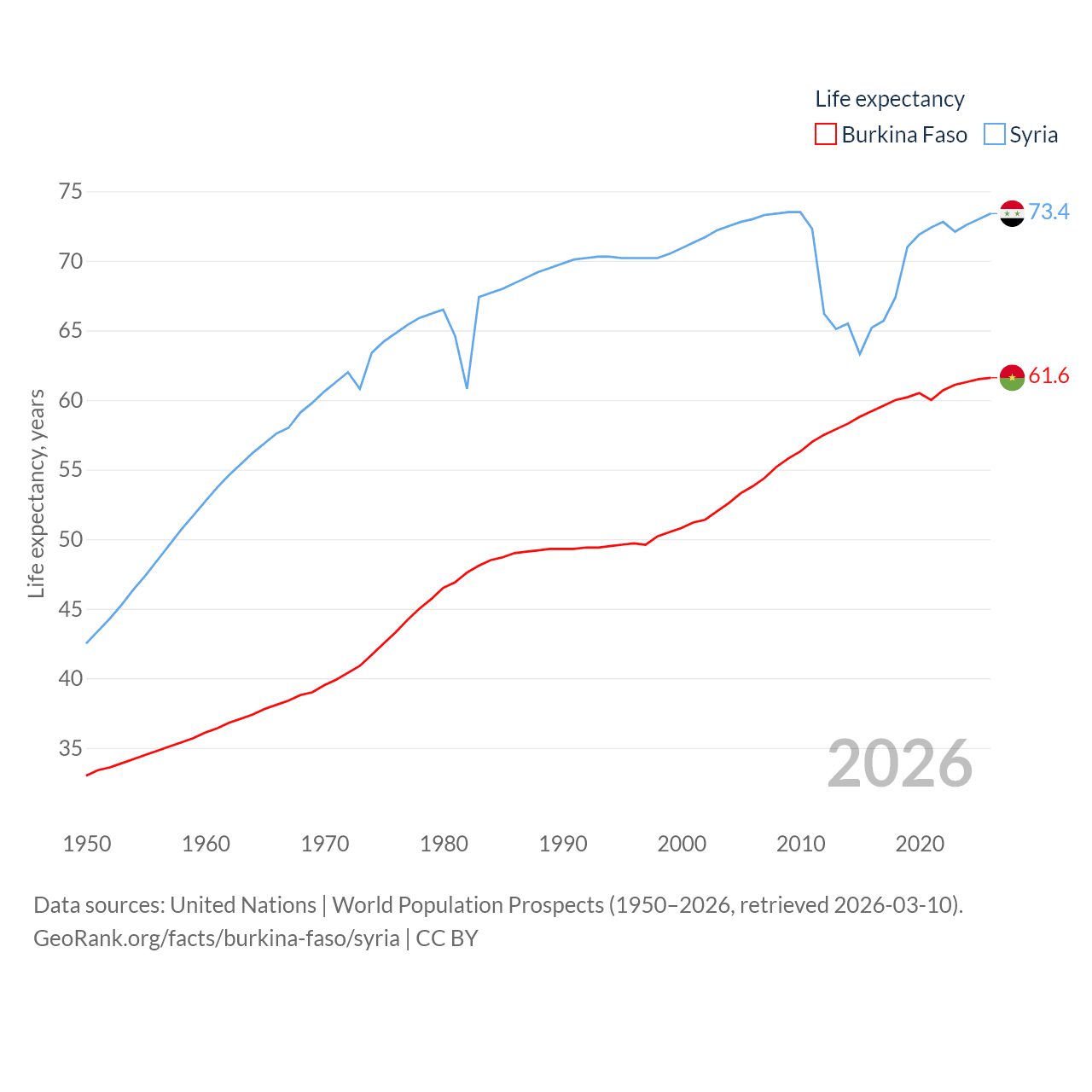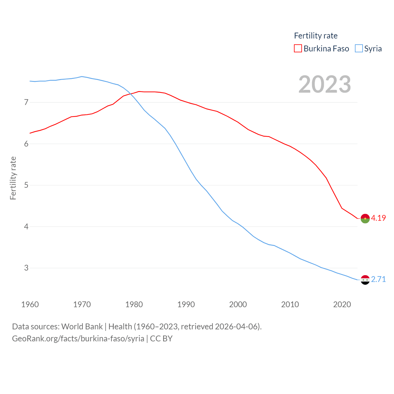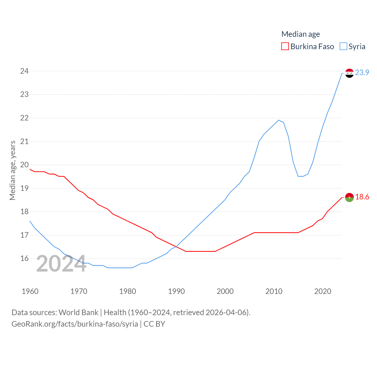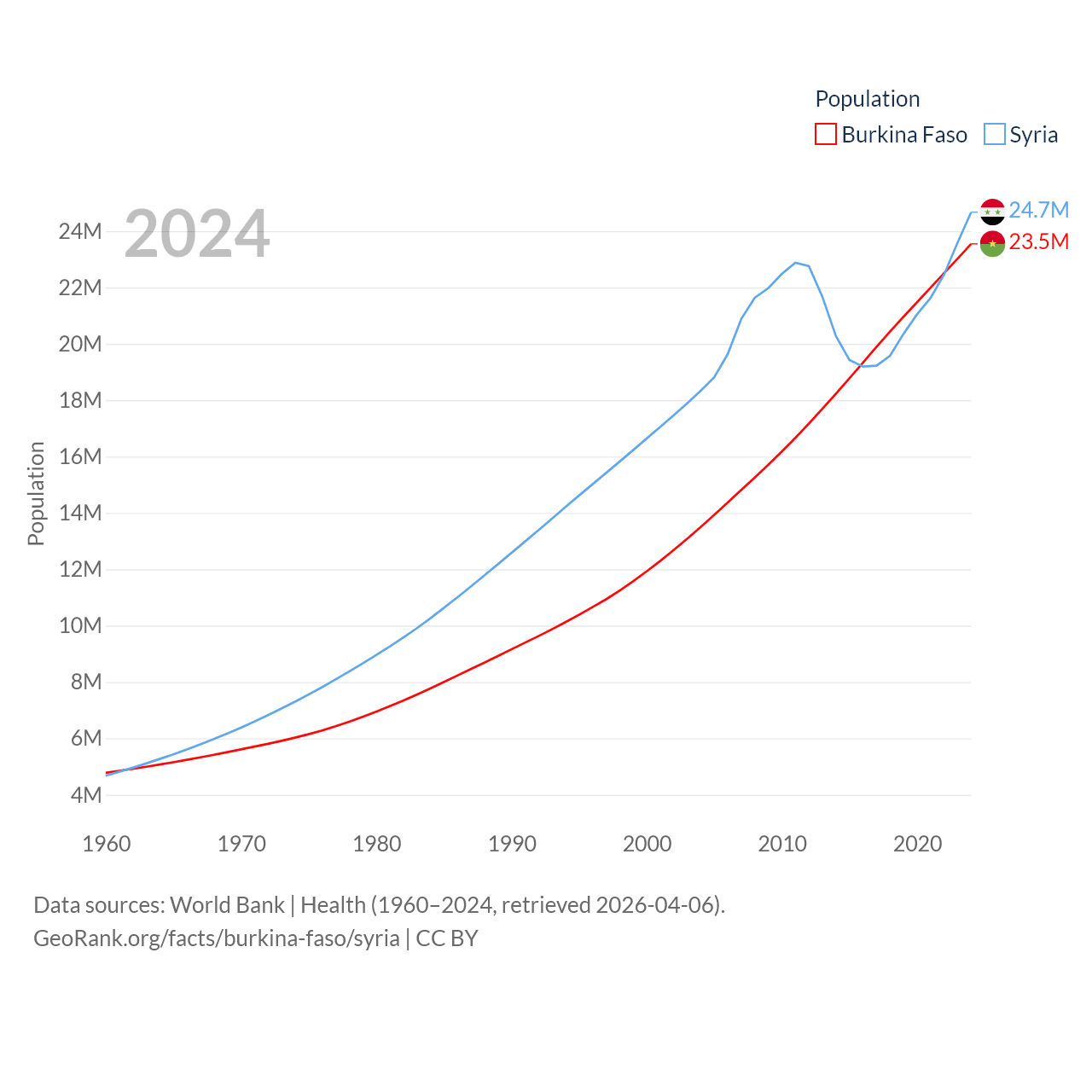 Burkina Faso has a population of 23.5M (ranked 59/197), compared with 24.7M in Syria (ranked 57/197). Burkina Faso's land area is 105,638 sq mi versus 70,900 sq mi for Syria (ranked 73rd vs. 87th).