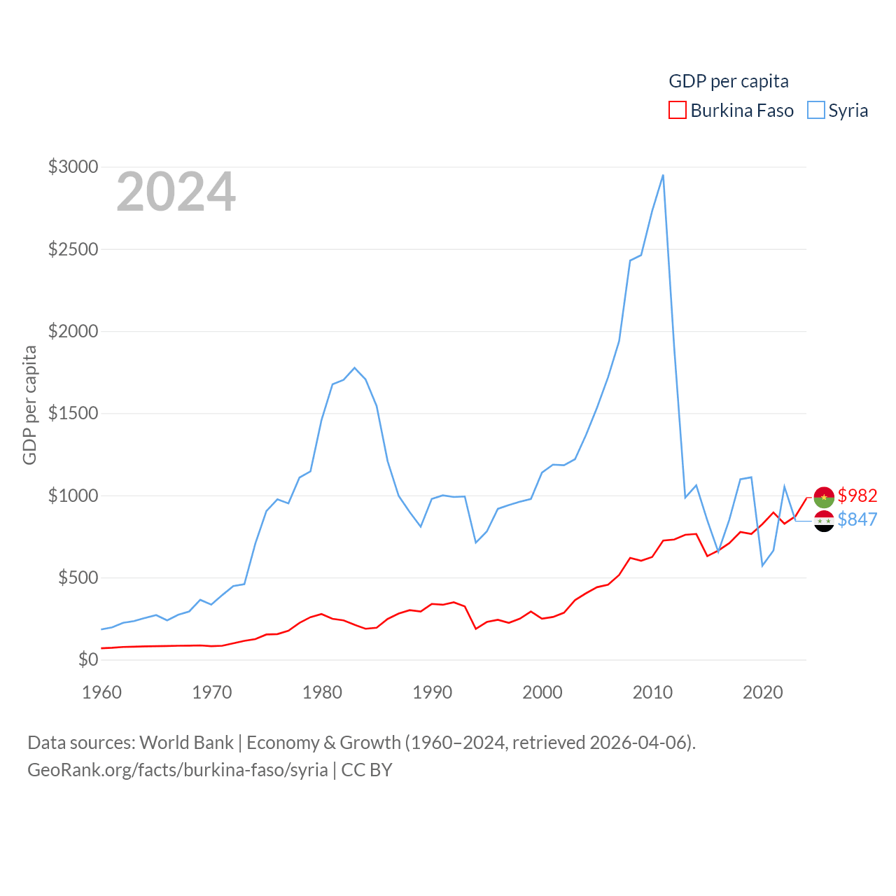 By GDP, Burkina Faso ranks 122/197 ($23.1B) and Syria ranks 129/197 ($20B). By GDP per capita, Burkina Faso ranks 180/197 ($982), while Syria ranks 185/197 ($847).
