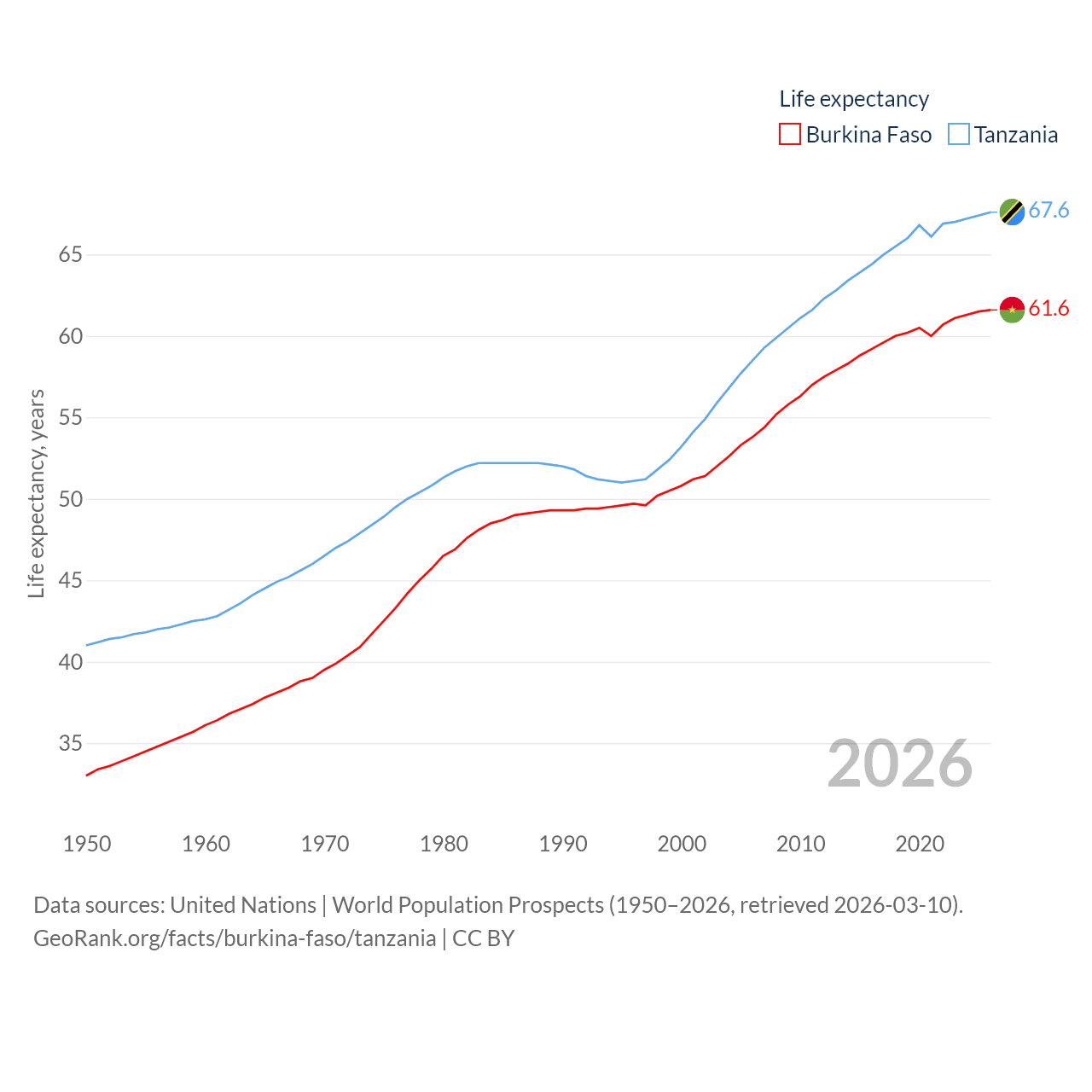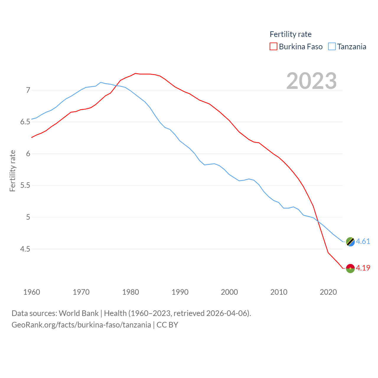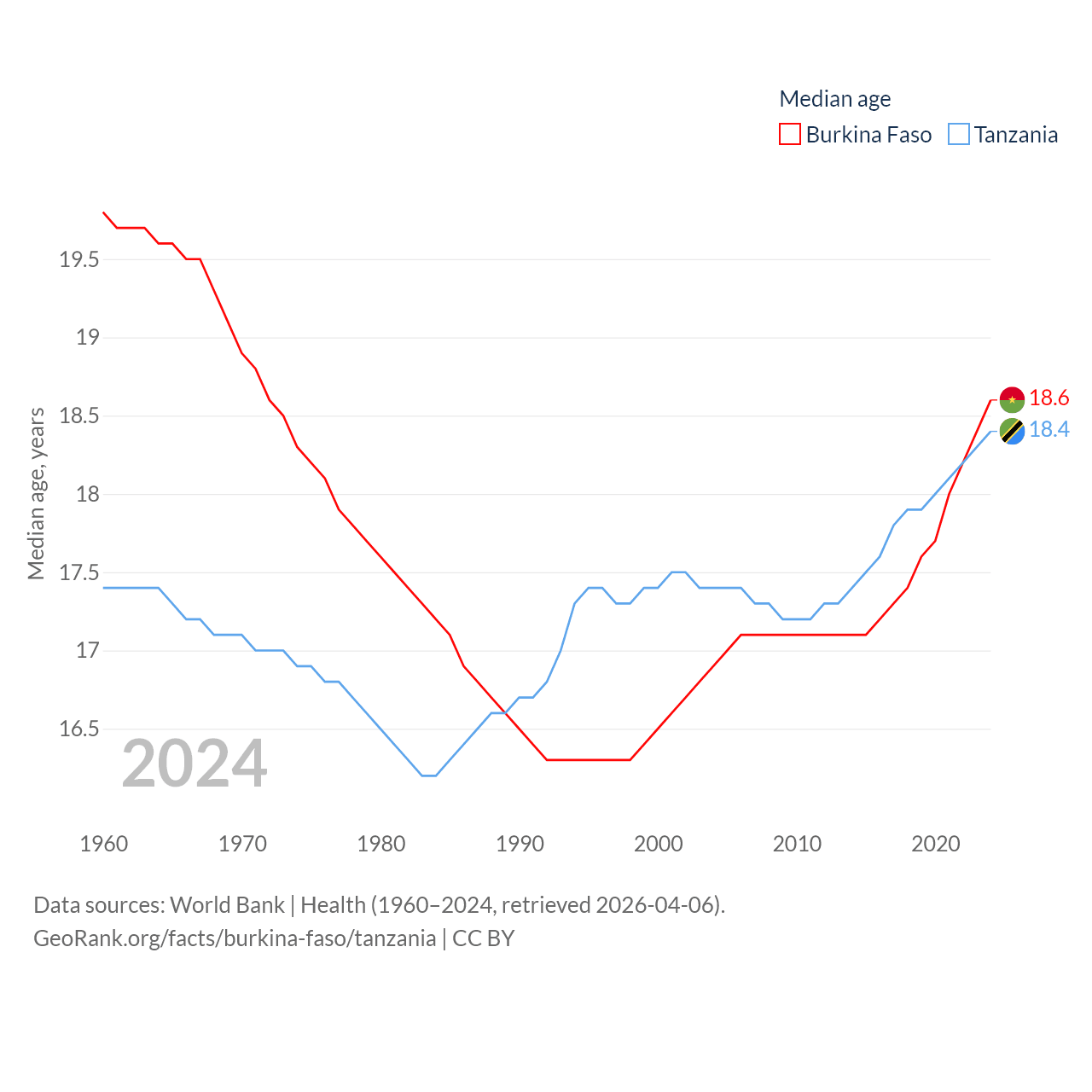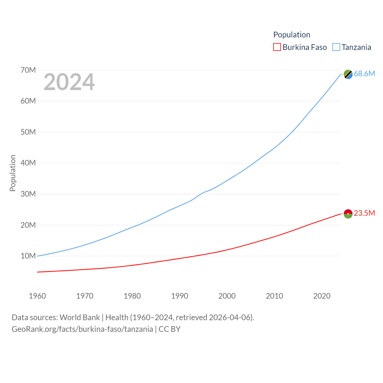 Burkina Faso has a population of 23.5M (ranked 59/197), compared with 68.6M in Tanzania (ranked 22/197). Burkina Faso's land area is 105,638 sq mi versus 342,009 sq mi for Tanzania (ranked 73rd vs. 31st).