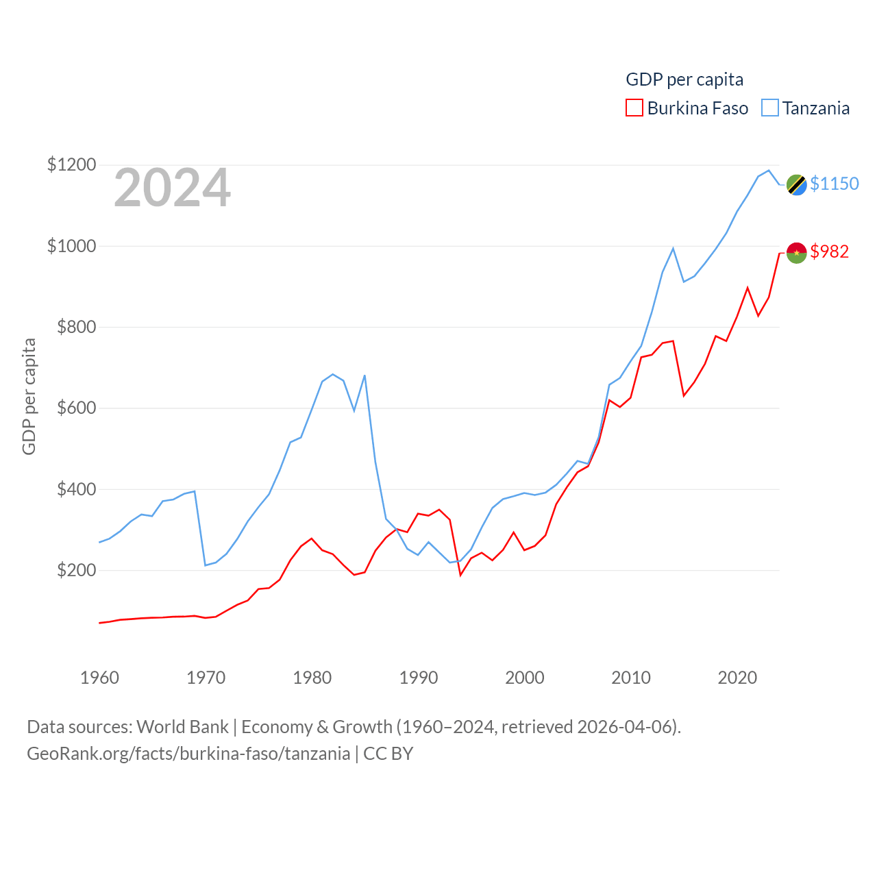 By GDP, Burkina Faso ranks 122/197 ($23.1B) and Tanzania ranks 82/197 ($78.8B). By GDP per capita, Burkina Faso ranks 180/197 ($982), while Tanzania ranks 170/197 ($1,150).