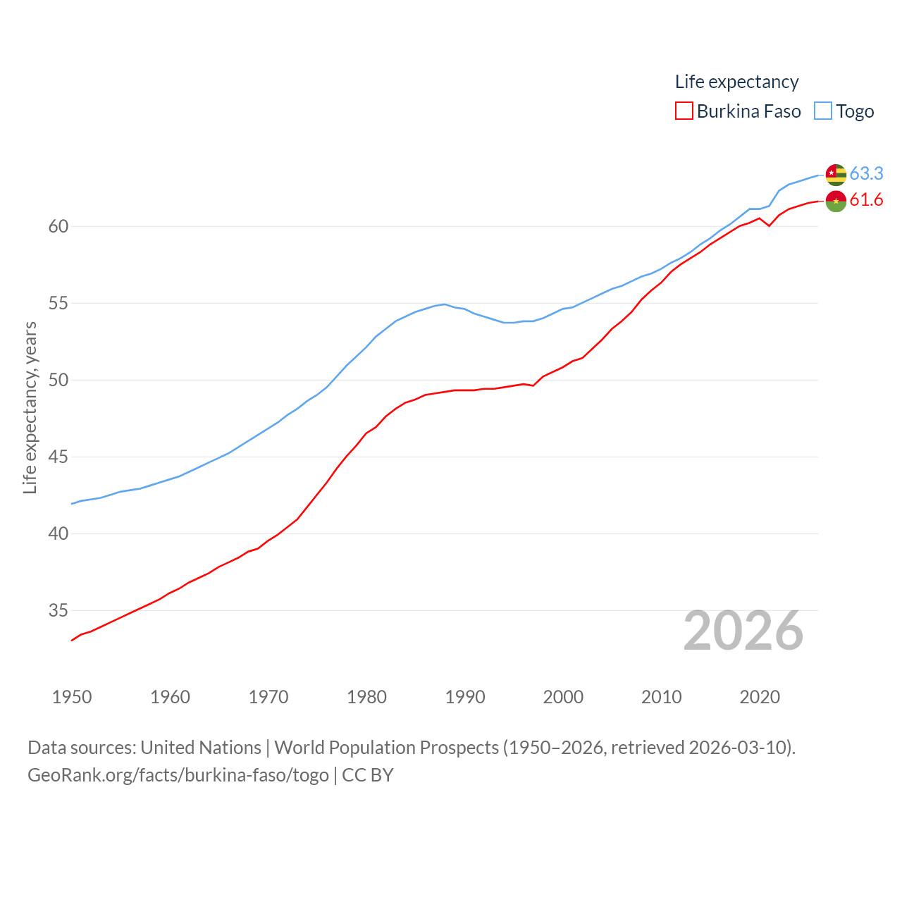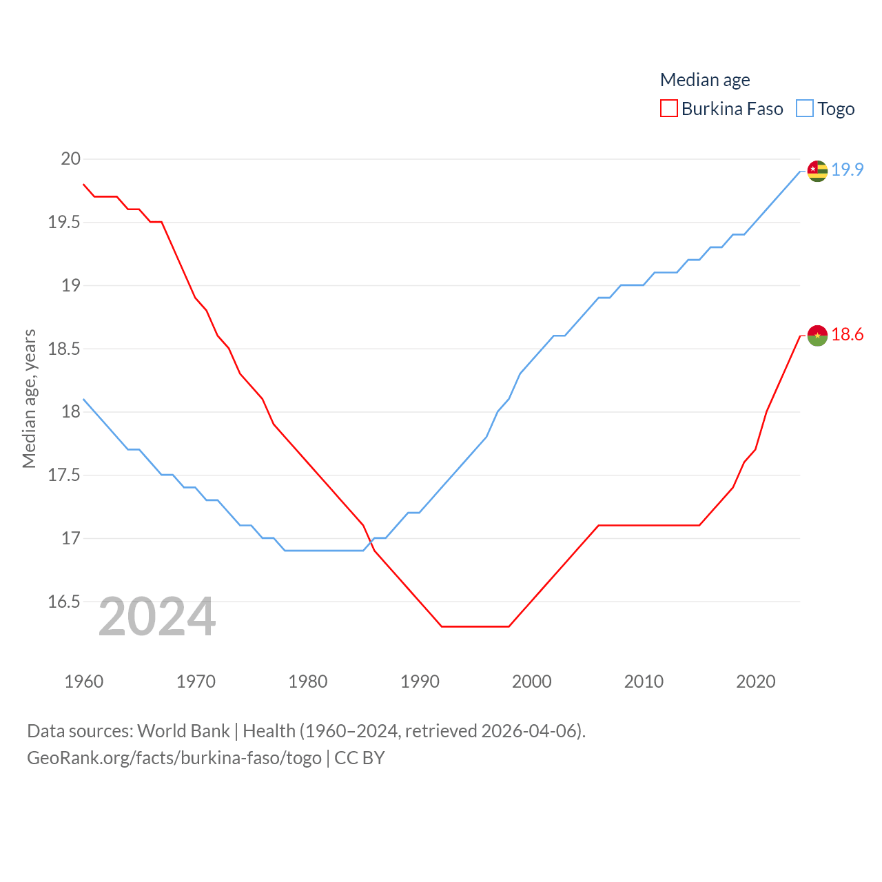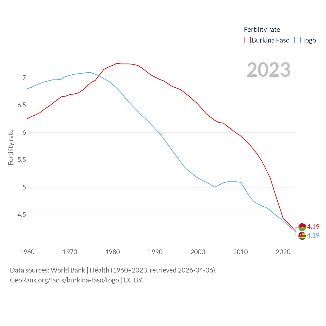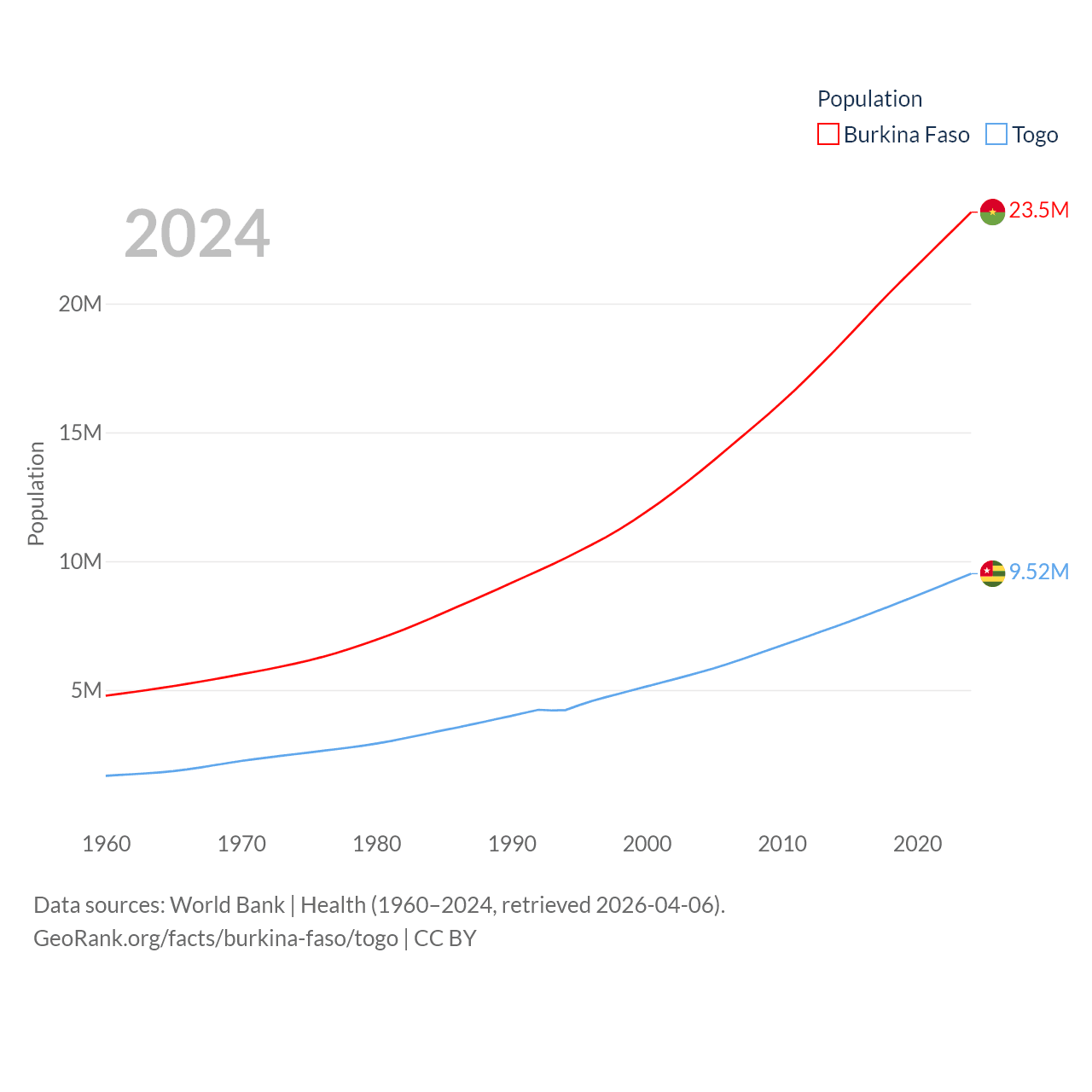 Burkina Faso has a population of 23.5M (ranked 59/197), compared with 9.52M in Togo (ranked 98/197). Burkina Faso's land area is 105,638 sq mi versus 21,000 sq mi for Togo (ranked 73rd vs. 124th).