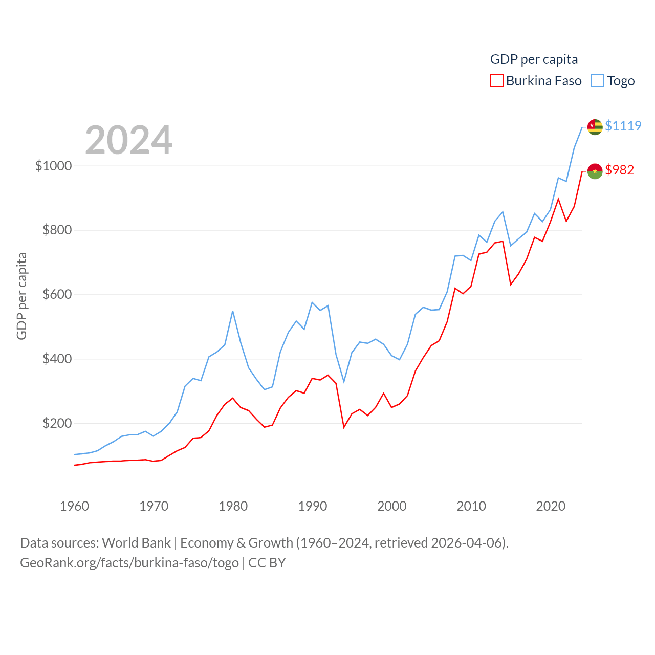 By GDP, Burkina Faso ranks 122/197 ($23.1B) and Togo ranks 154/197 ($10.7B). By GDP per capita, Burkina Faso ranks 180/197 ($982), while Togo ranks 172/197 ($1,119).