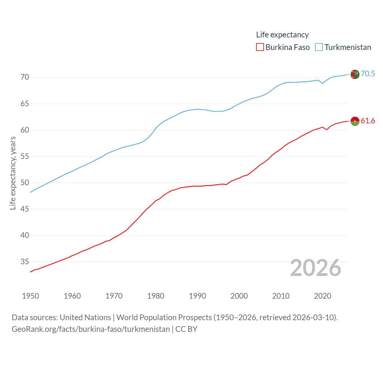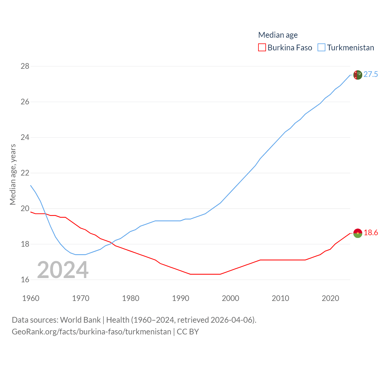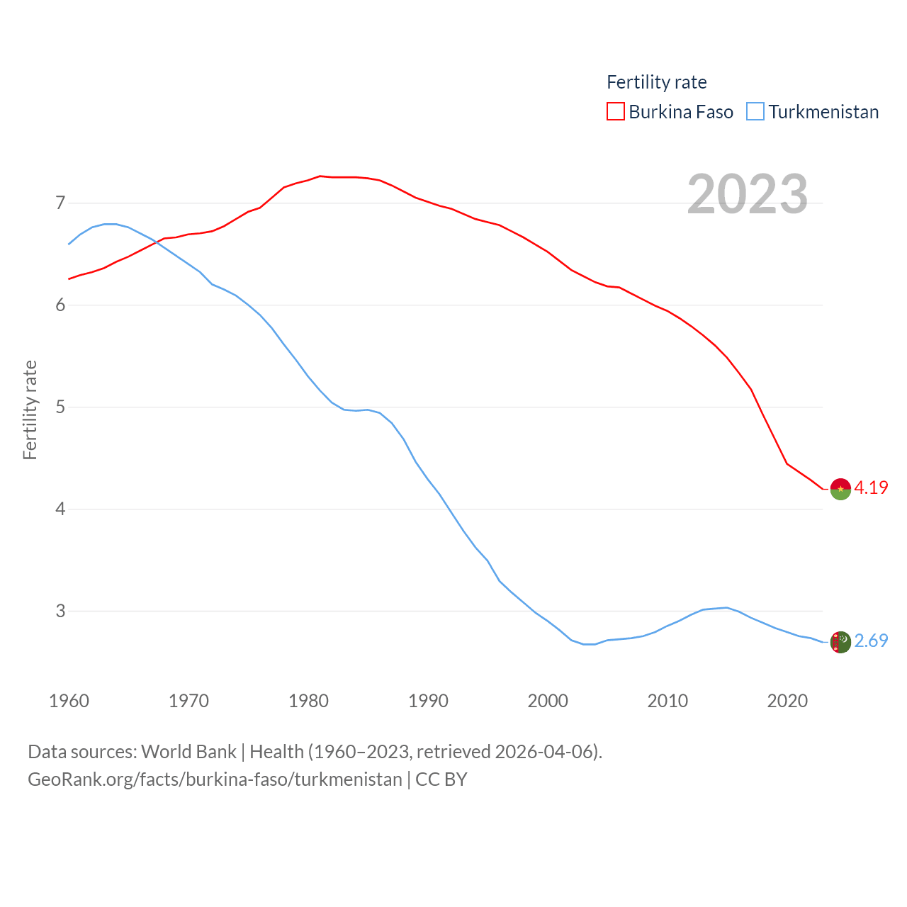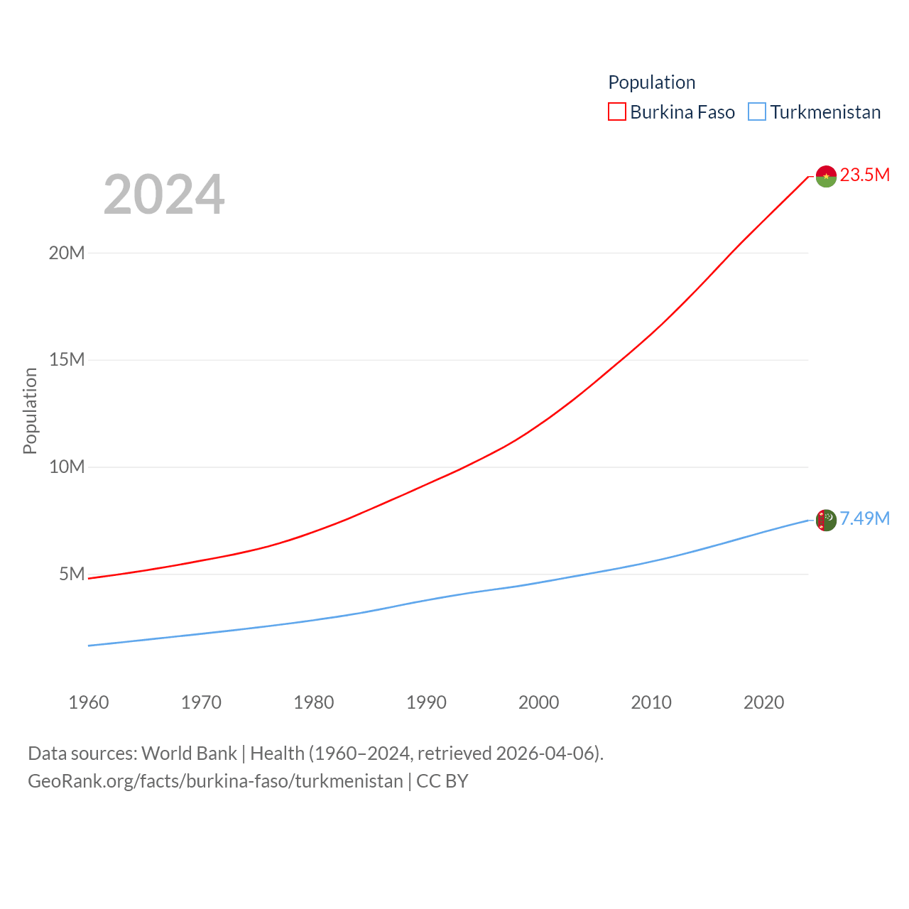 Burkina Faso has a population of 23.5M (ranked 59/197), compared with 7.49M in Turkmenistan (ranked 104/197). Burkina Faso's land area is 105,638 sq mi versus 181,441 sq mi for Turkmenistan (ranked 73rd vs. 53rd).