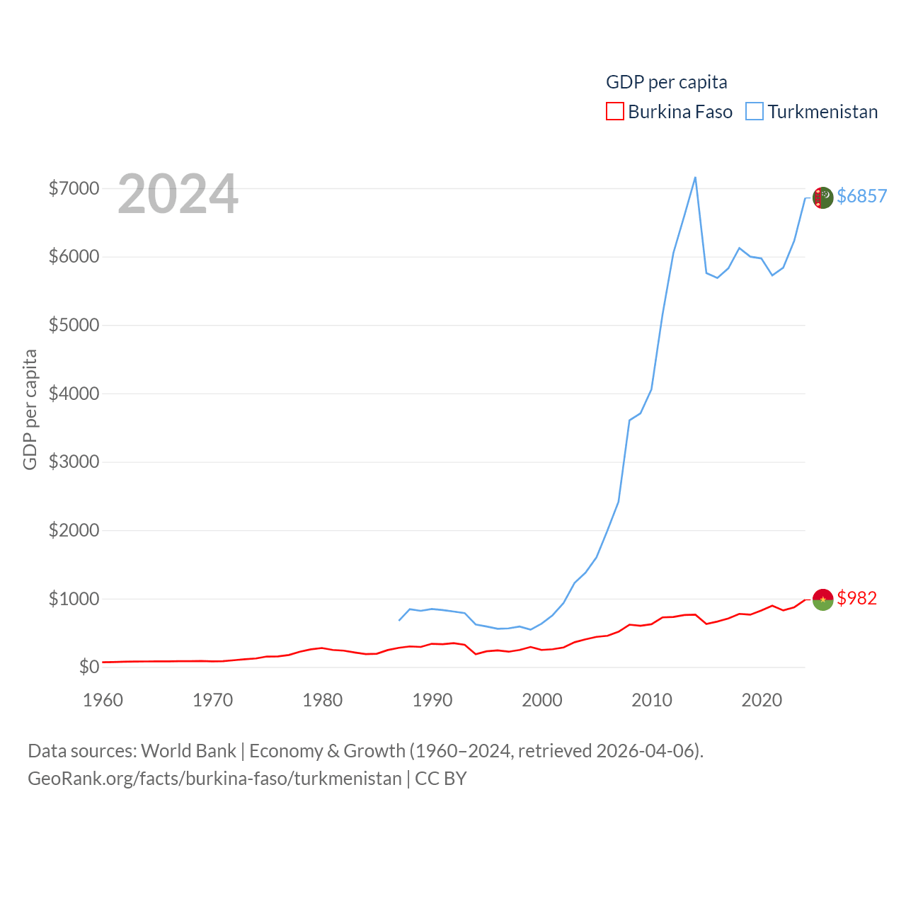 By GDP, Burkina Faso ranks 122/197 ($23.1B) and Turkmenistan ranks 92/197 ($51.4B). By GDP per capita, Burkina Faso ranks 180/197 ($982), while Turkmenistan ranks 104/197 ($6,857).