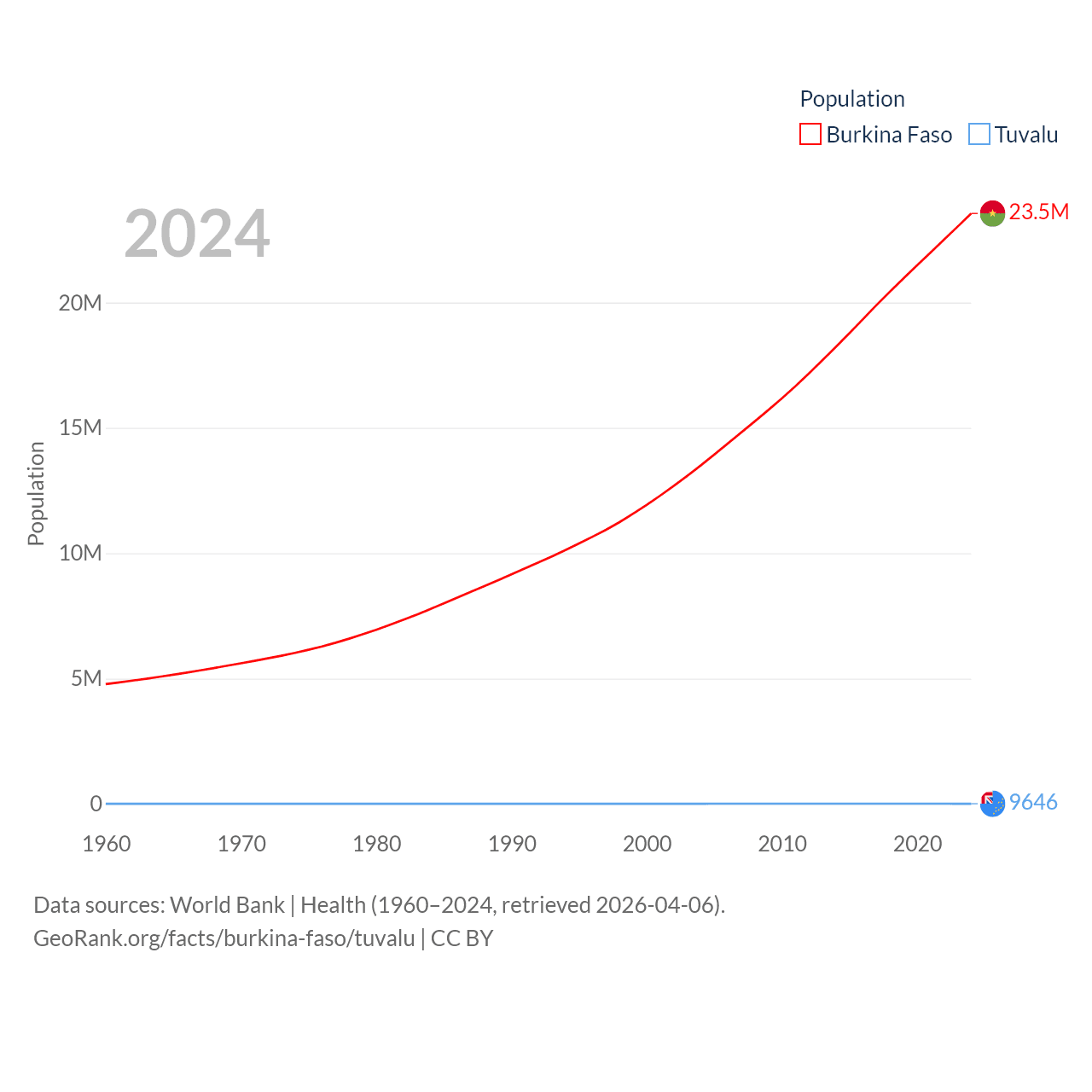 Burkina Faso has a population of 23.5M (ranked 59/197), compared with 9.65K in Tuvalu (ranked 196/197). Burkina Faso's land area is 105,638 sq mi versus 11.6 sq mi for Tuvalu (ranked 73rd vs. 194th).