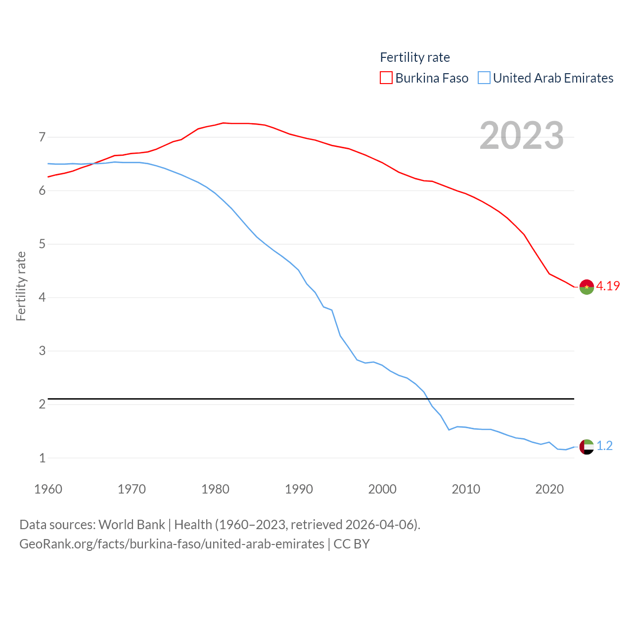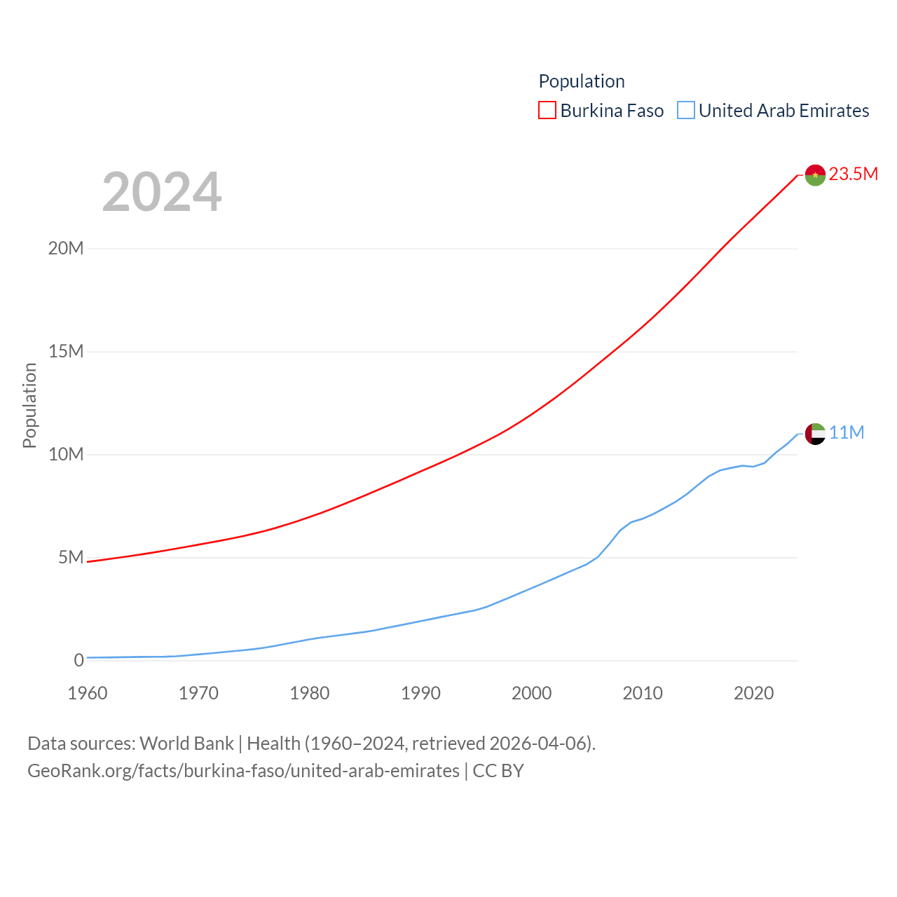 Burkina Faso has a population of 23.5M (ranked 59/197), compared with 11M in The United Arab Emirates (ranked 86/197). Burkina Faso's land area is 105,638 sq mi versus 27,421 sq mi for The United Arab Emirates (ranked 73rd vs. 117th).