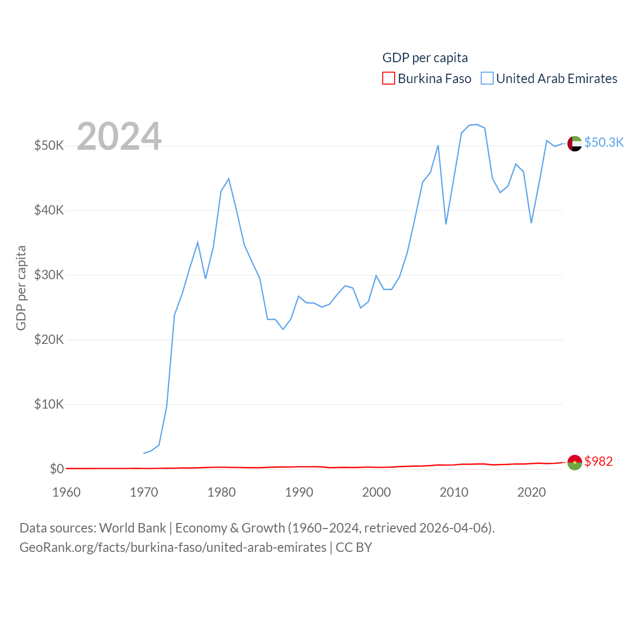 By GDP, Burkina Faso ranks 122/197 ($23.1B) and The United Arab Emirates ranks 27/197 ($552B). By GDP per capita, Burkina Faso ranks 180/197 ($982), while The United Arab Emirates ranks 24/197 ($50,274).