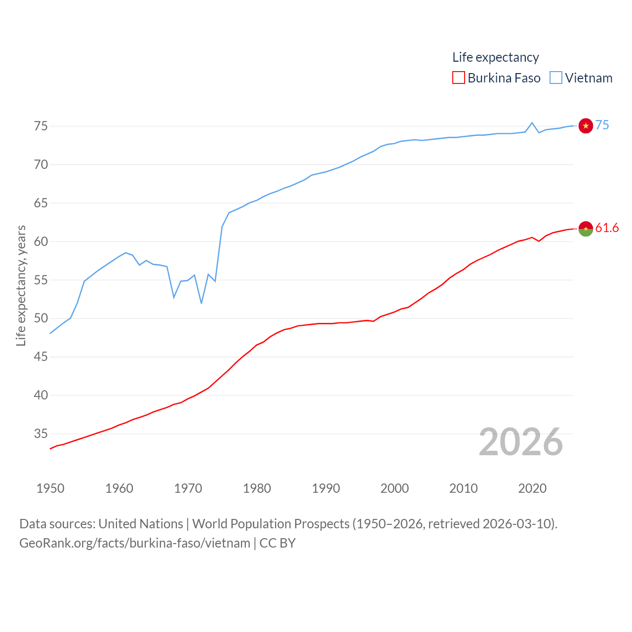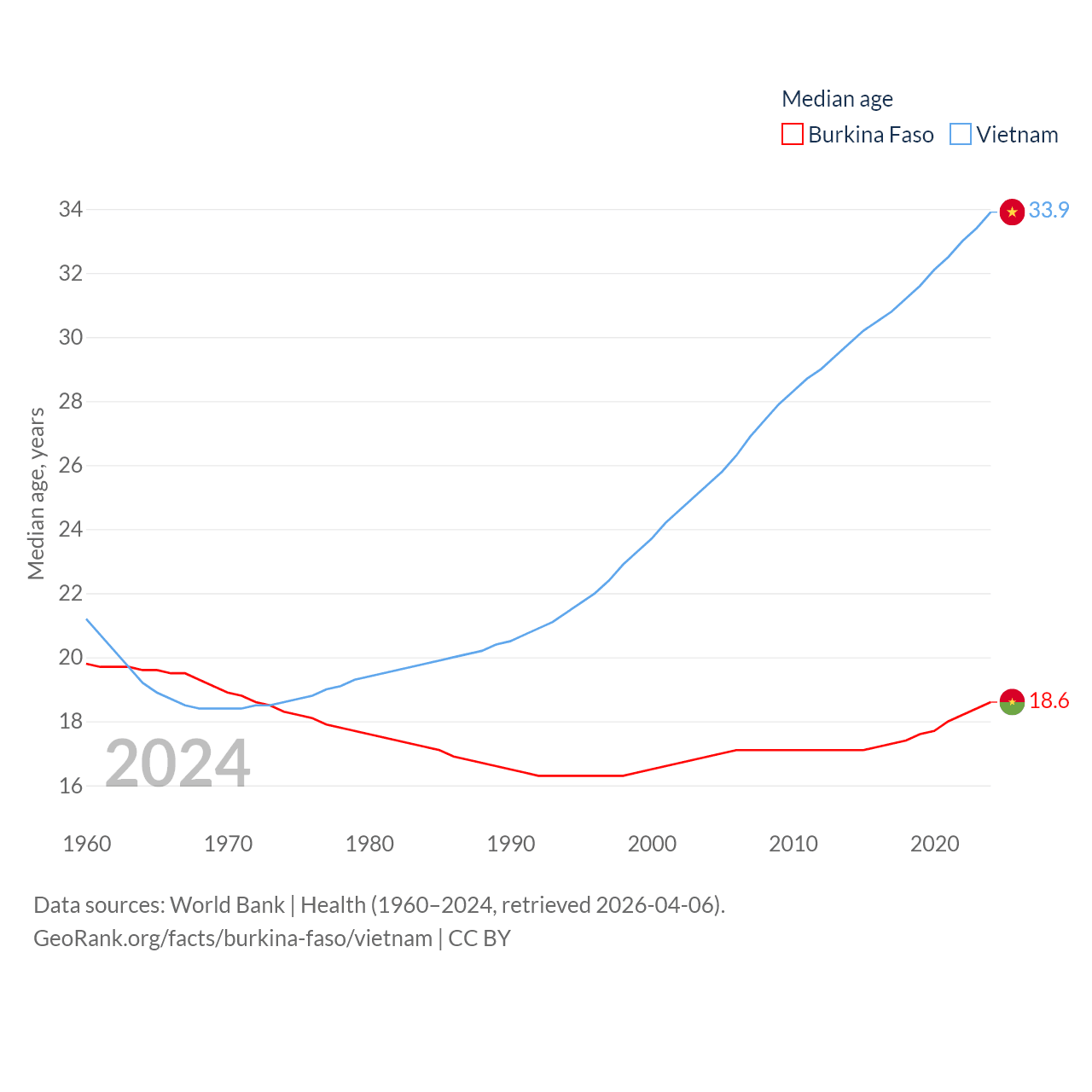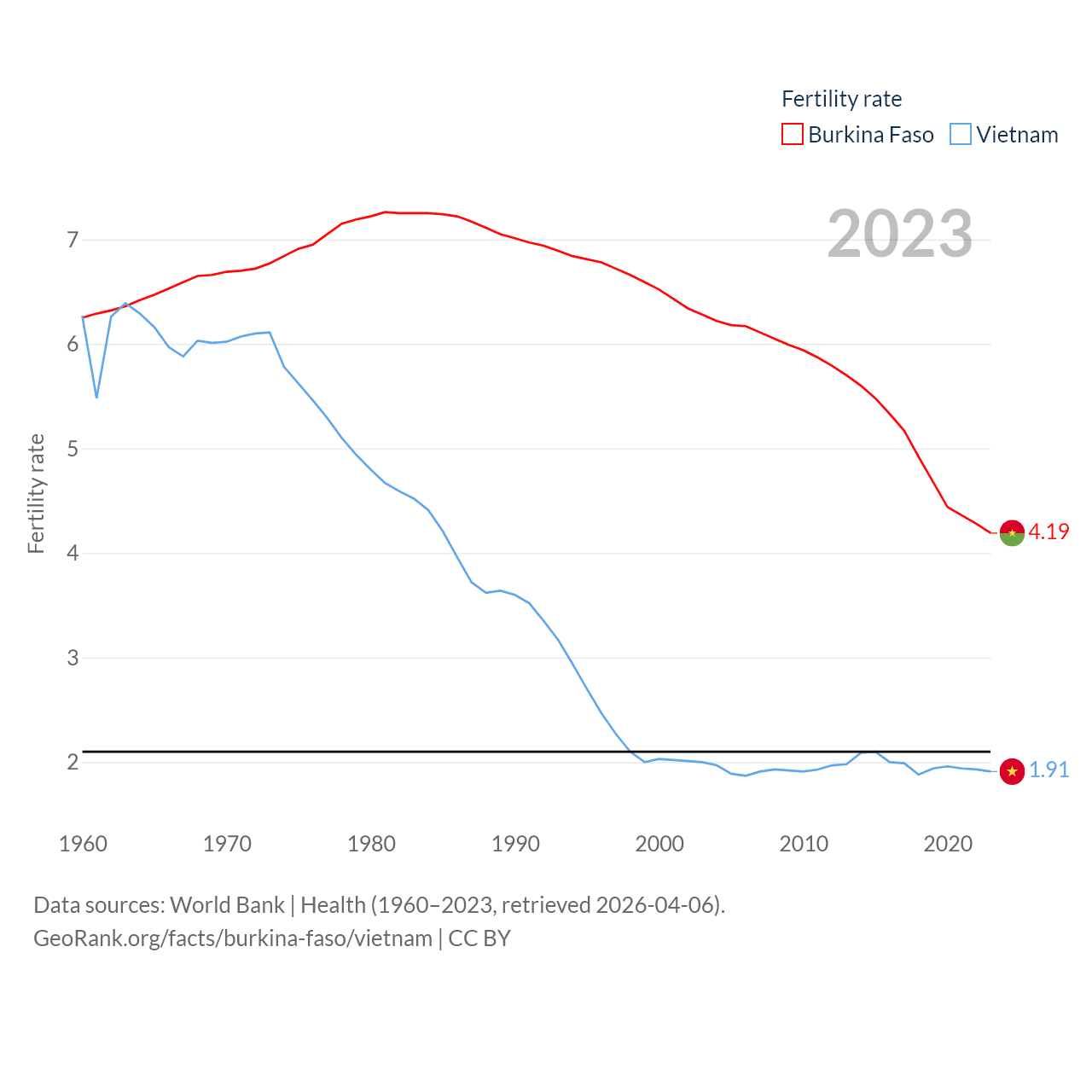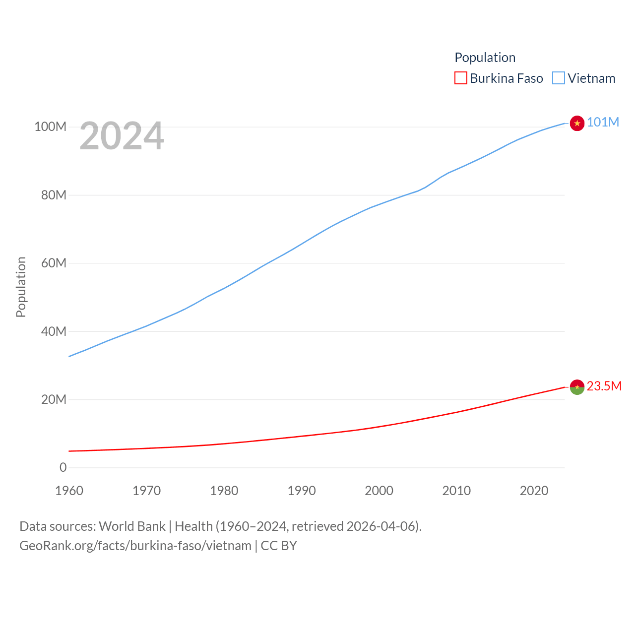 Burkina Faso has a population of 23.5M (ranked 59/197), compared with 101M in Vietnam (ranked 16/197). Burkina Faso's land area is 105,638 sq mi versus 121,016 sq mi for Vietnam (ranked 73rd vs. 67th).