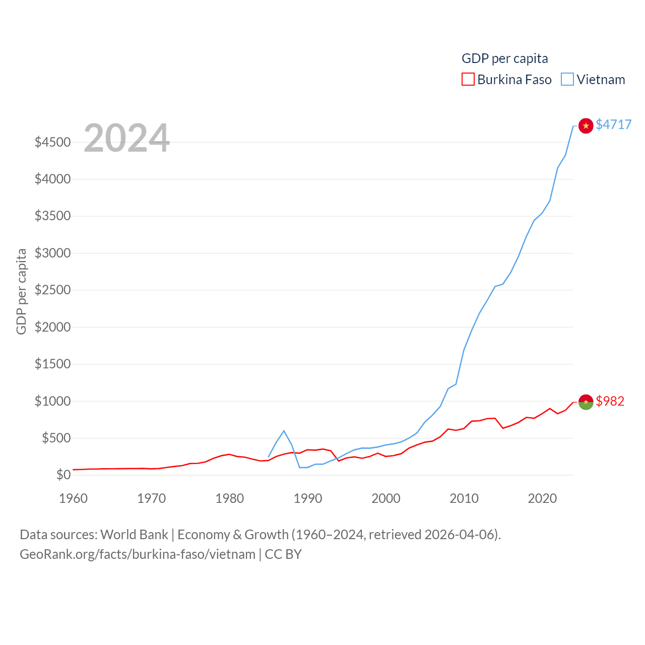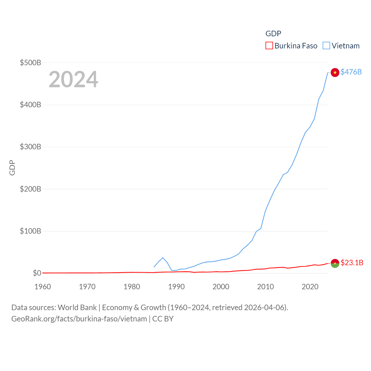 By GDP, Burkina Faso ranks 122/197 ($23.1B) and Vietnam ranks 33/197 ($476B). By GDP per capita, Burkina Faso ranks 180/197 ($982), while Vietnam ranks 122/197 ($4,717).
