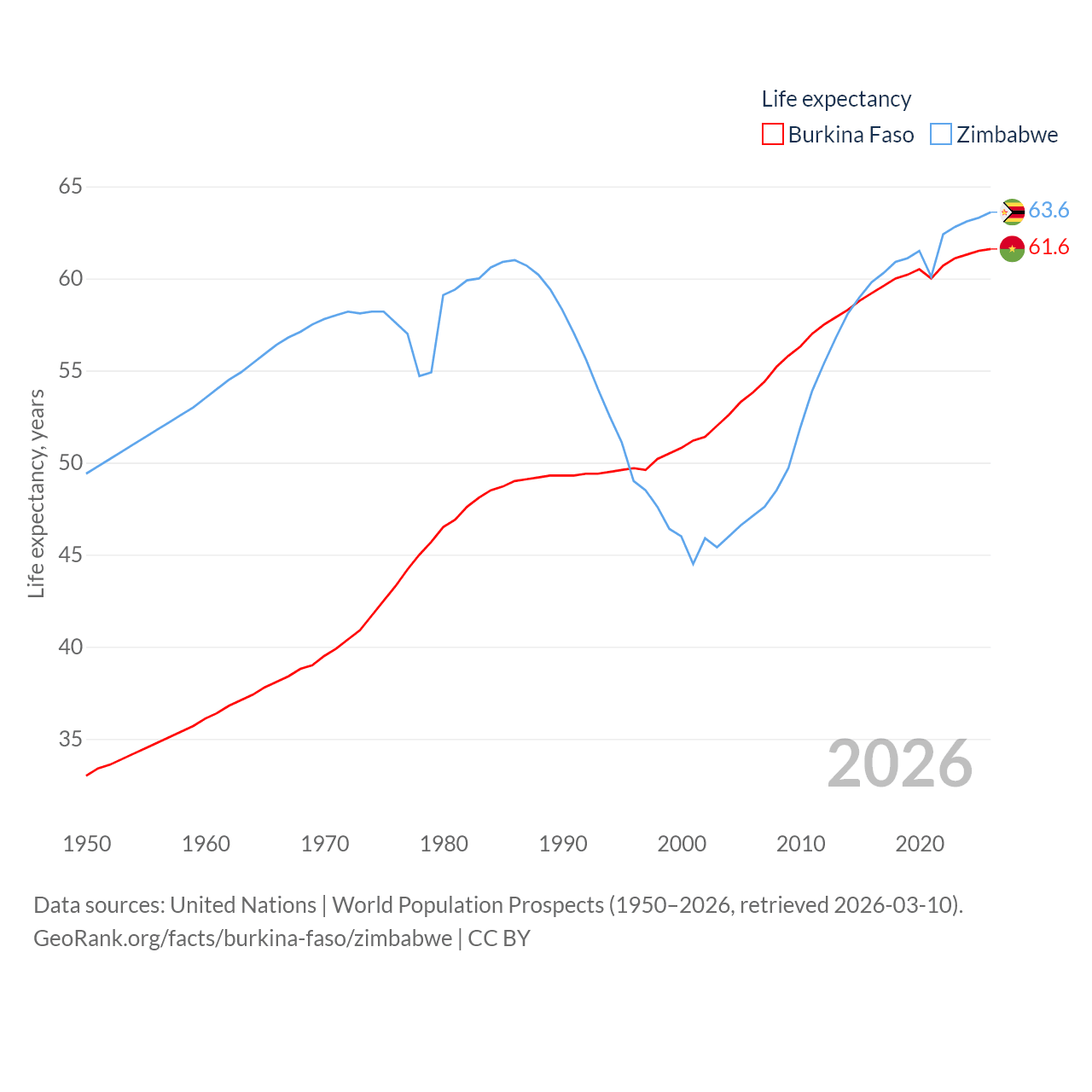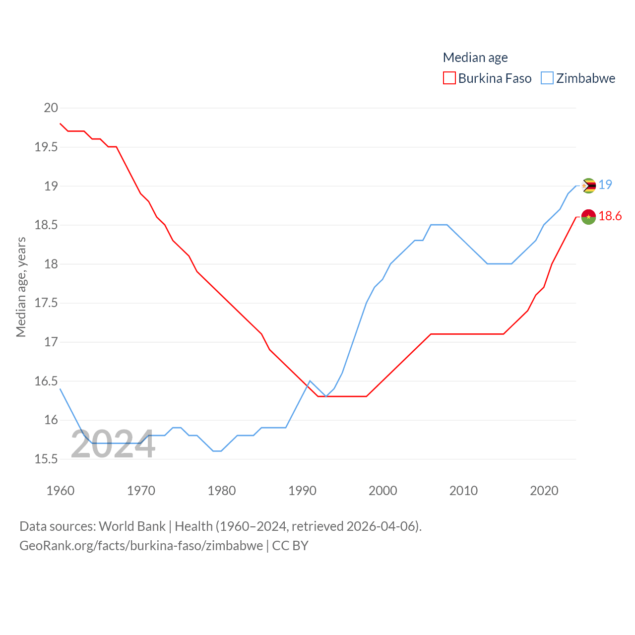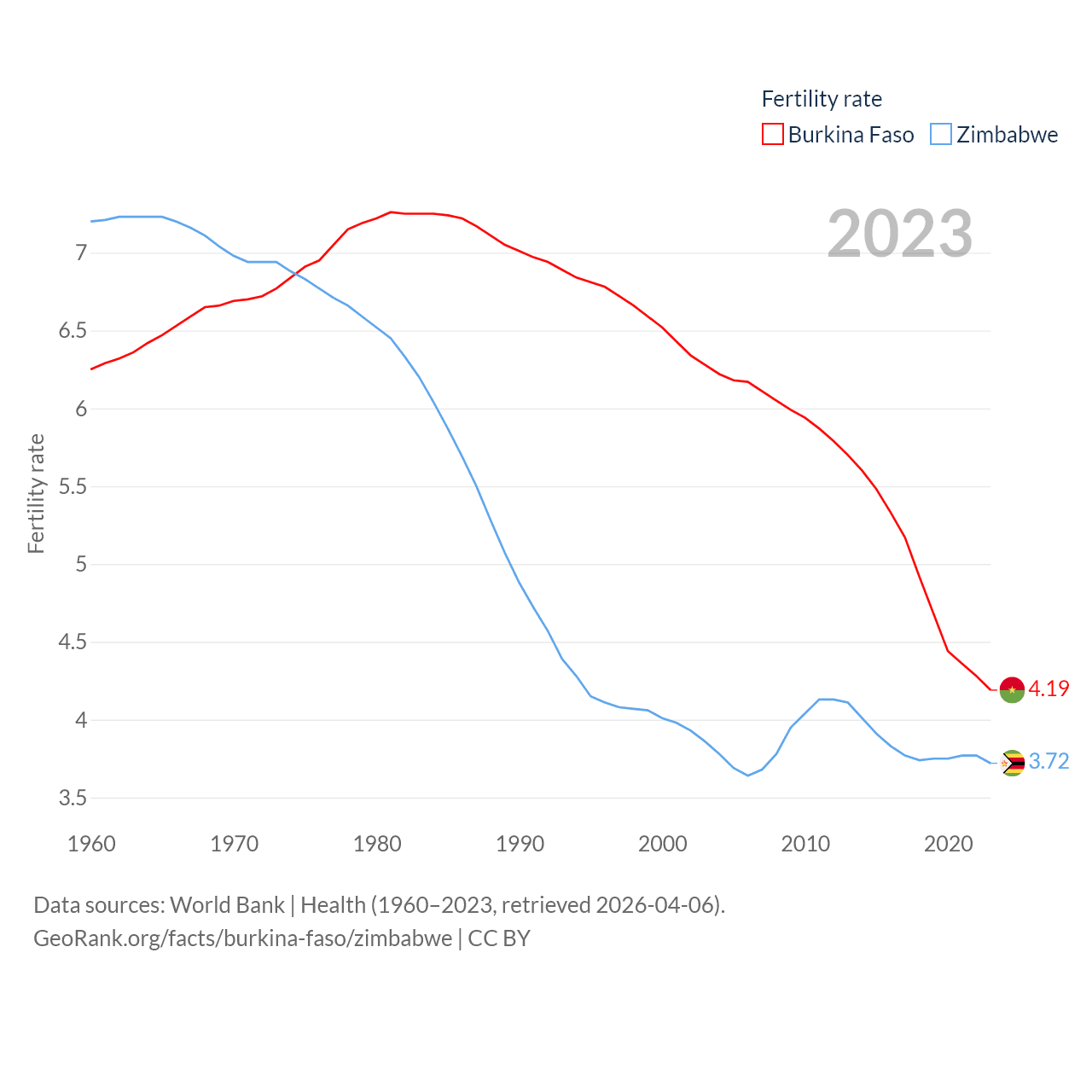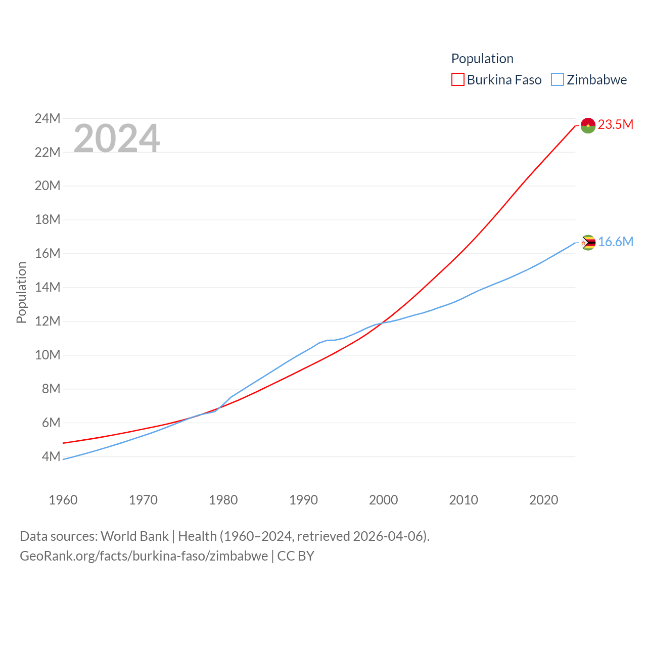 Burkina Faso has a population of 23.5M (ranked 59/197), compared with 16.6M in Zimbabwe (ranked 74/197). Burkina Faso's land area is 105,638 sq mi versus 149,364 sq mi for Zimbabwe (ranked 73rd vs. 60th).
