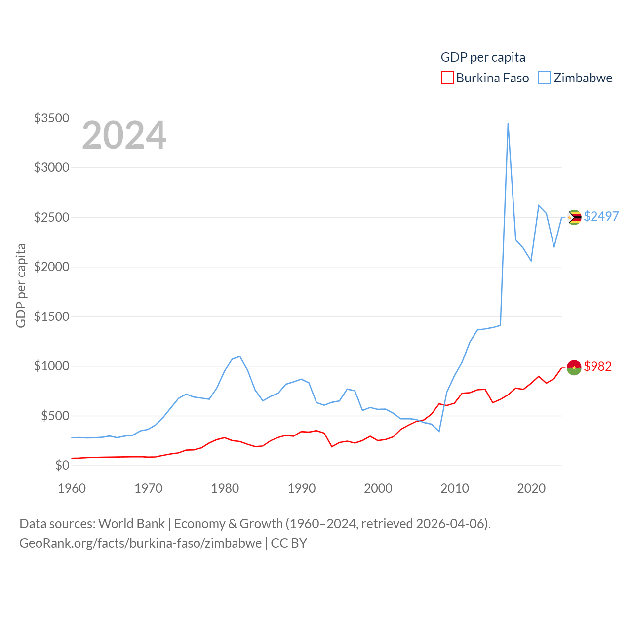 By GDP, Burkina Faso ranks 122/197 ($23.1B) and Zimbabwe ranks 102/197 ($41.5B). By GDP per capita, Burkina Faso ranks 180/197 ($982), while Zimbabwe ranks 148/197 ($2,497).