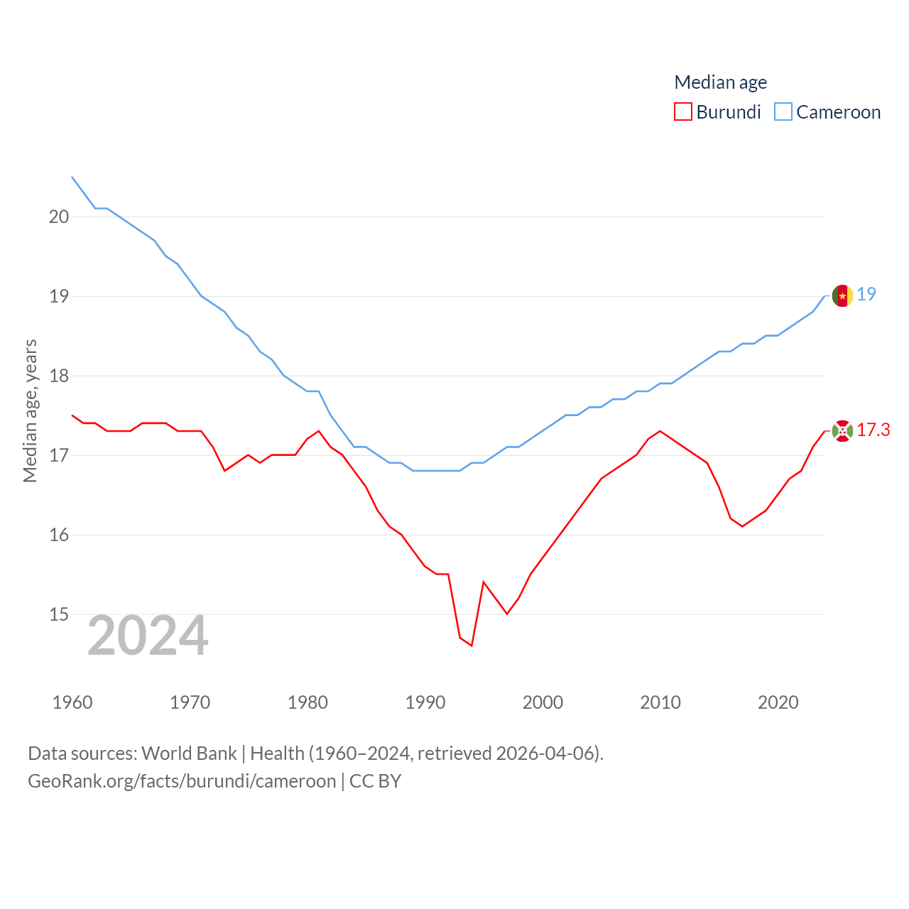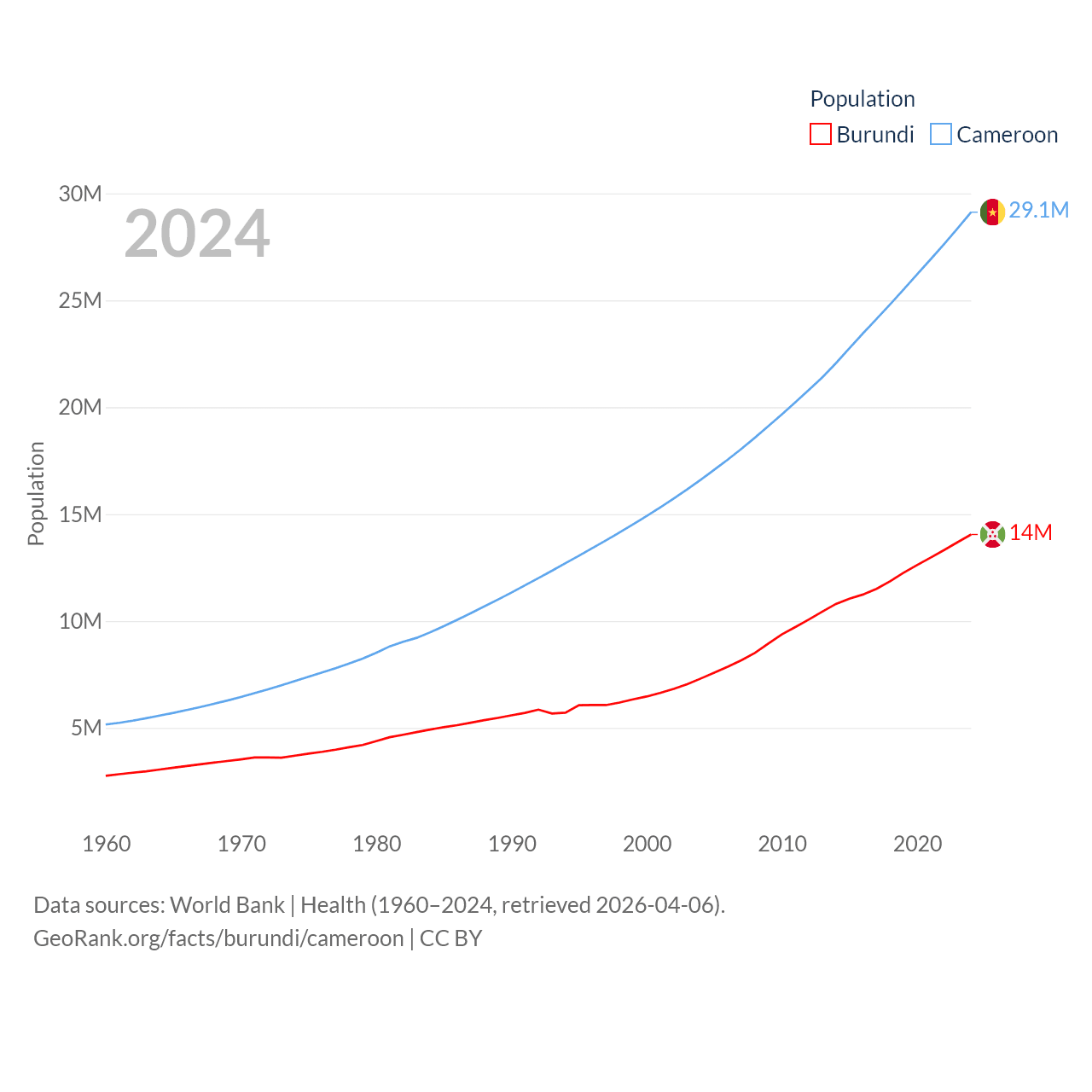 Burundi has a population of 14M (ranked 78/197), compared with 29.1M in Cameroon (ranked 52/197). Burundi's land area is 9,915 sq mi versus 182,514 sq mi for Cameroon (ranked 144th vs. 52nd).
