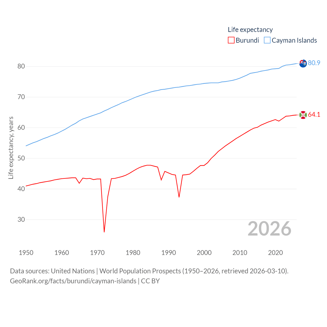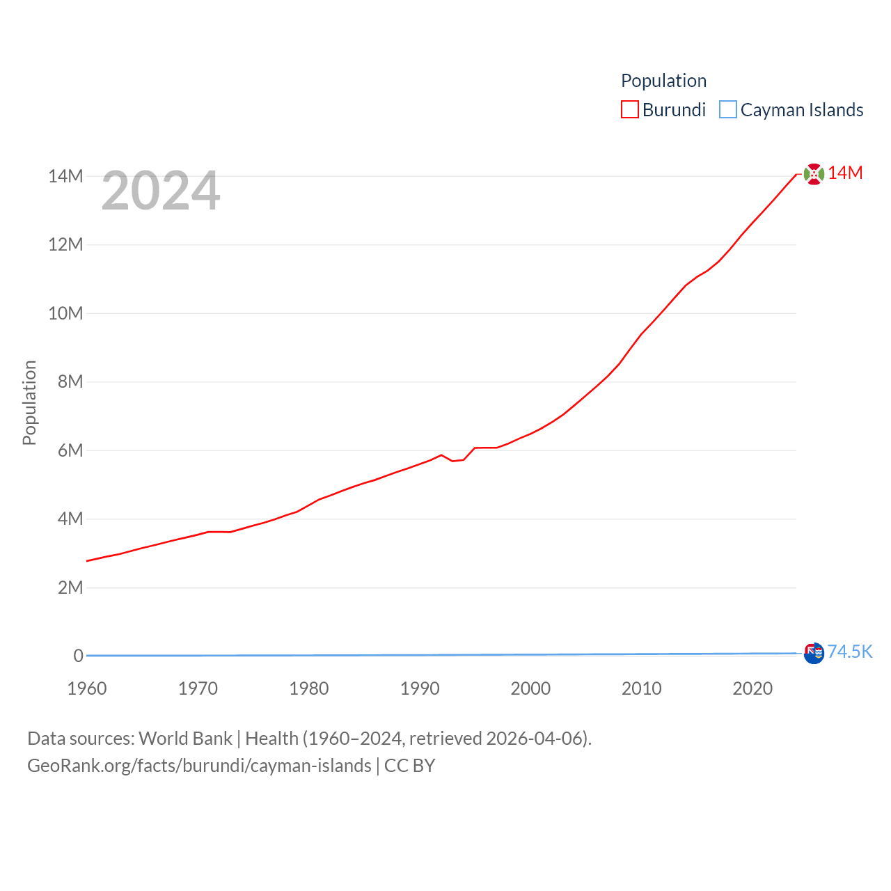 Burundi has a population of 14M (ranked 78/197), compared with 74.5K in The Cayman Islands (ranked 187/197). Burundi's land area is 9,915 sq mi versus 92.7 sq mi for The Cayman Islands (ranked 144th vs. 190th).