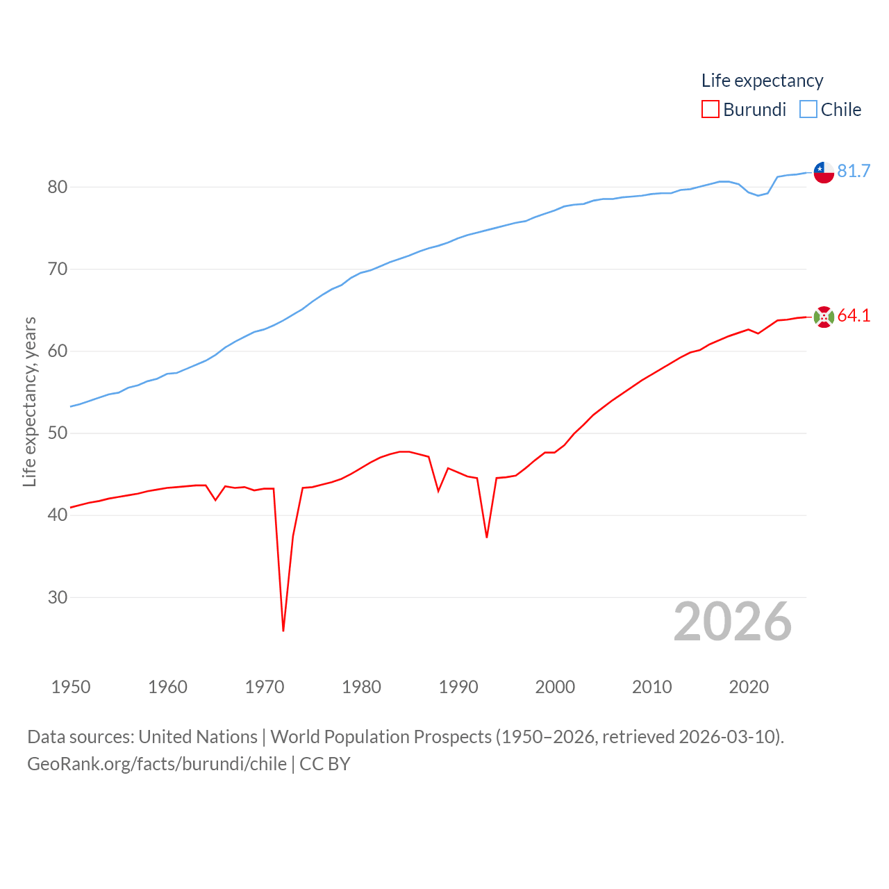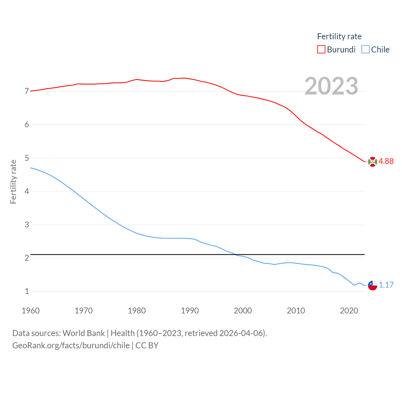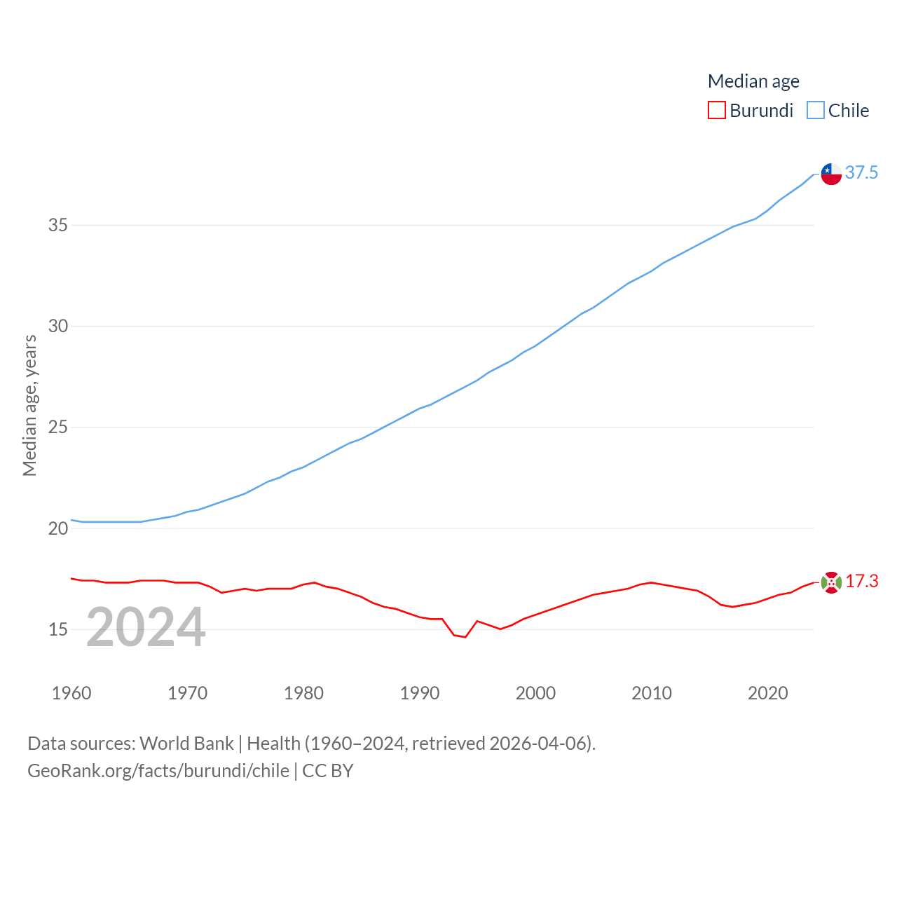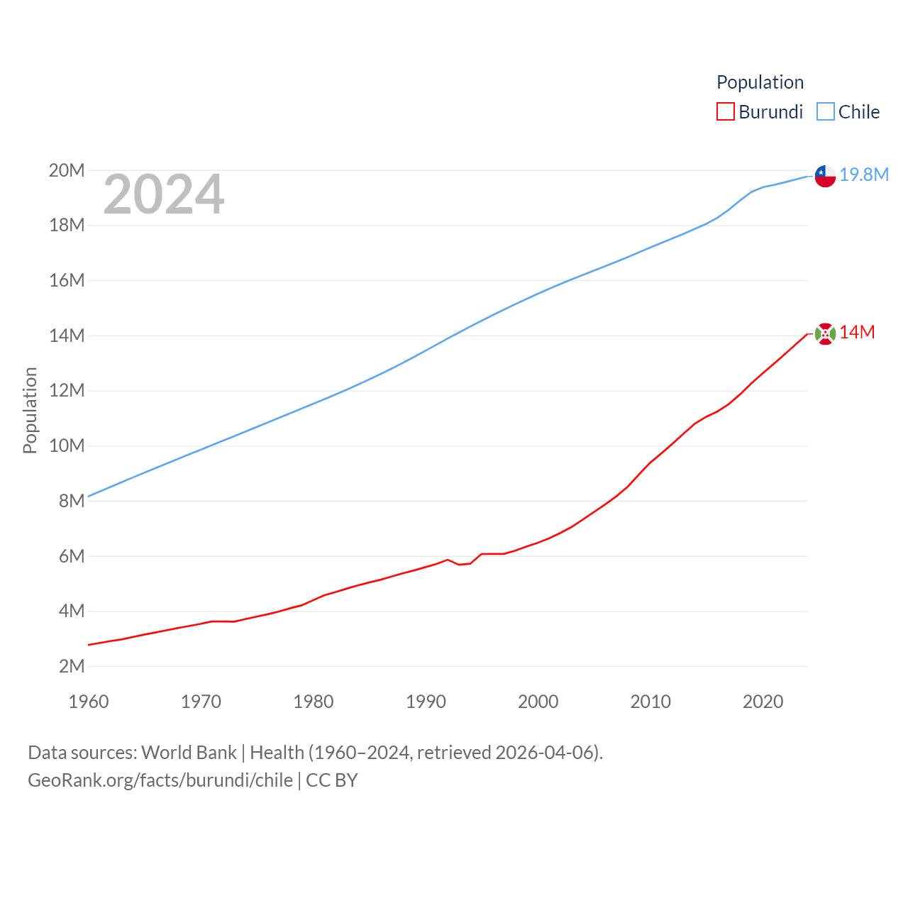 Burundi has a population of 14M (ranked 78/197), compared with 19.8M in Chile (ranked 66/197). Burundi's land area is 9,915 sq mi versus 286,809 sq mi for Chile (ranked 144th vs. 38th).