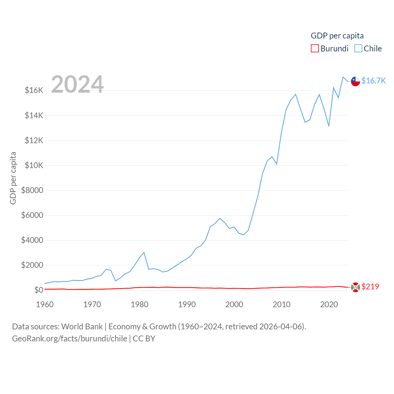 By GDP, Burundi ranks 169/197 ($3.08B) and Chile ranks 45/197 ($330B). By GDP per capita, Burundi ranks 197/197 ($219.4), while Chile ranks 65/197 ($16,710).