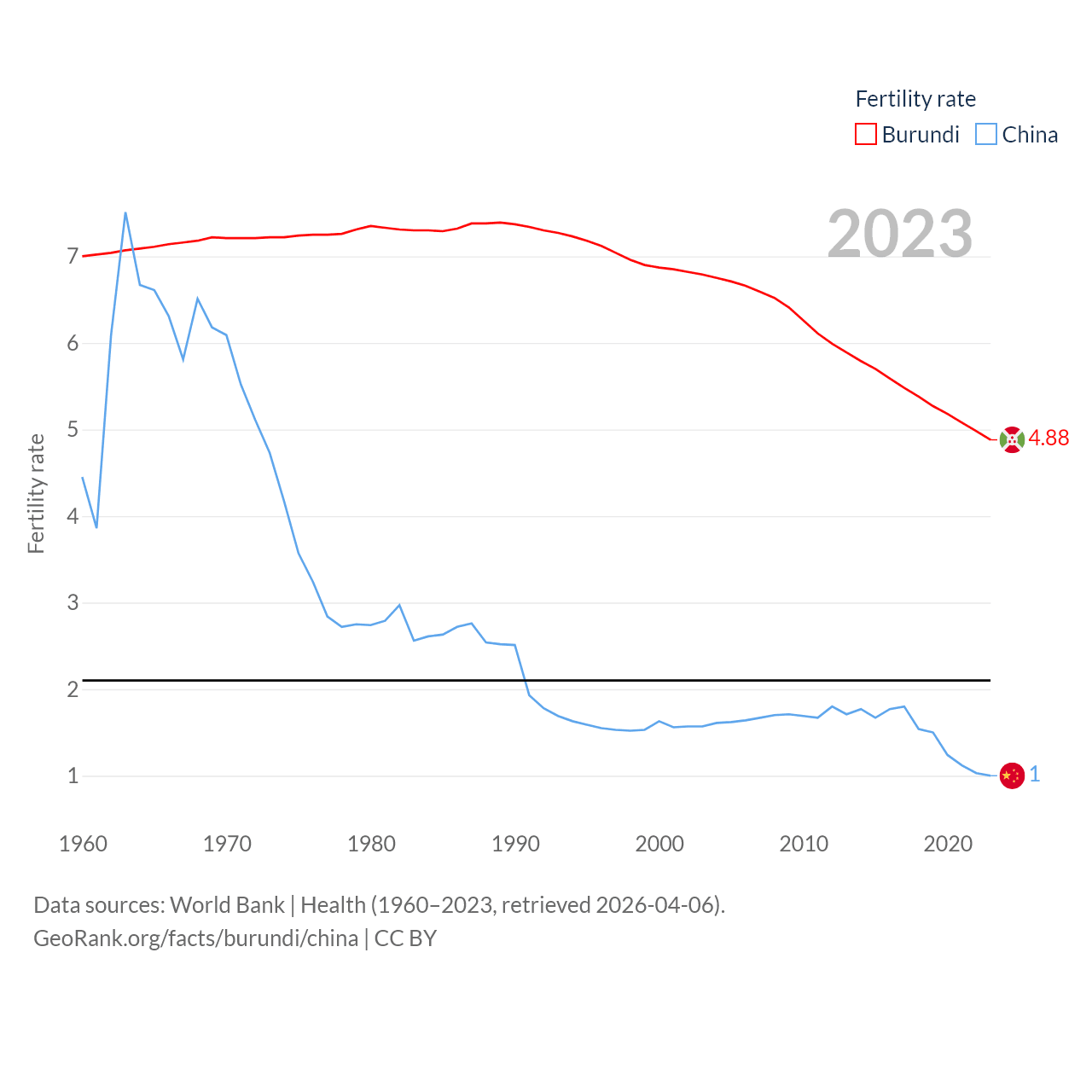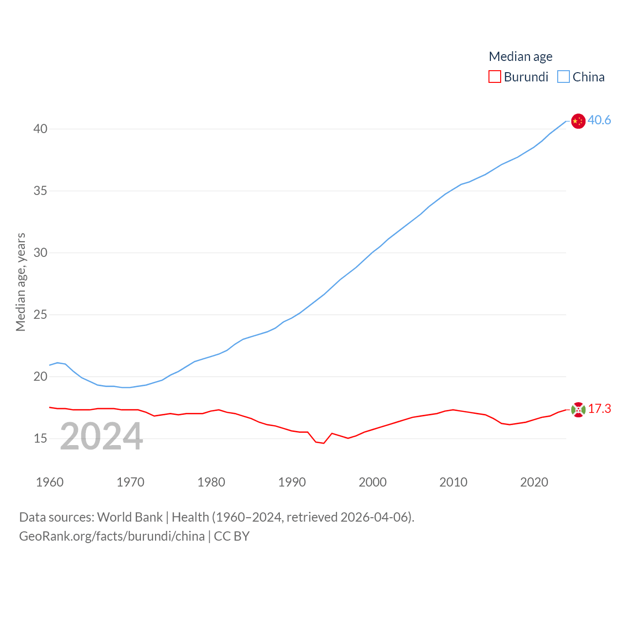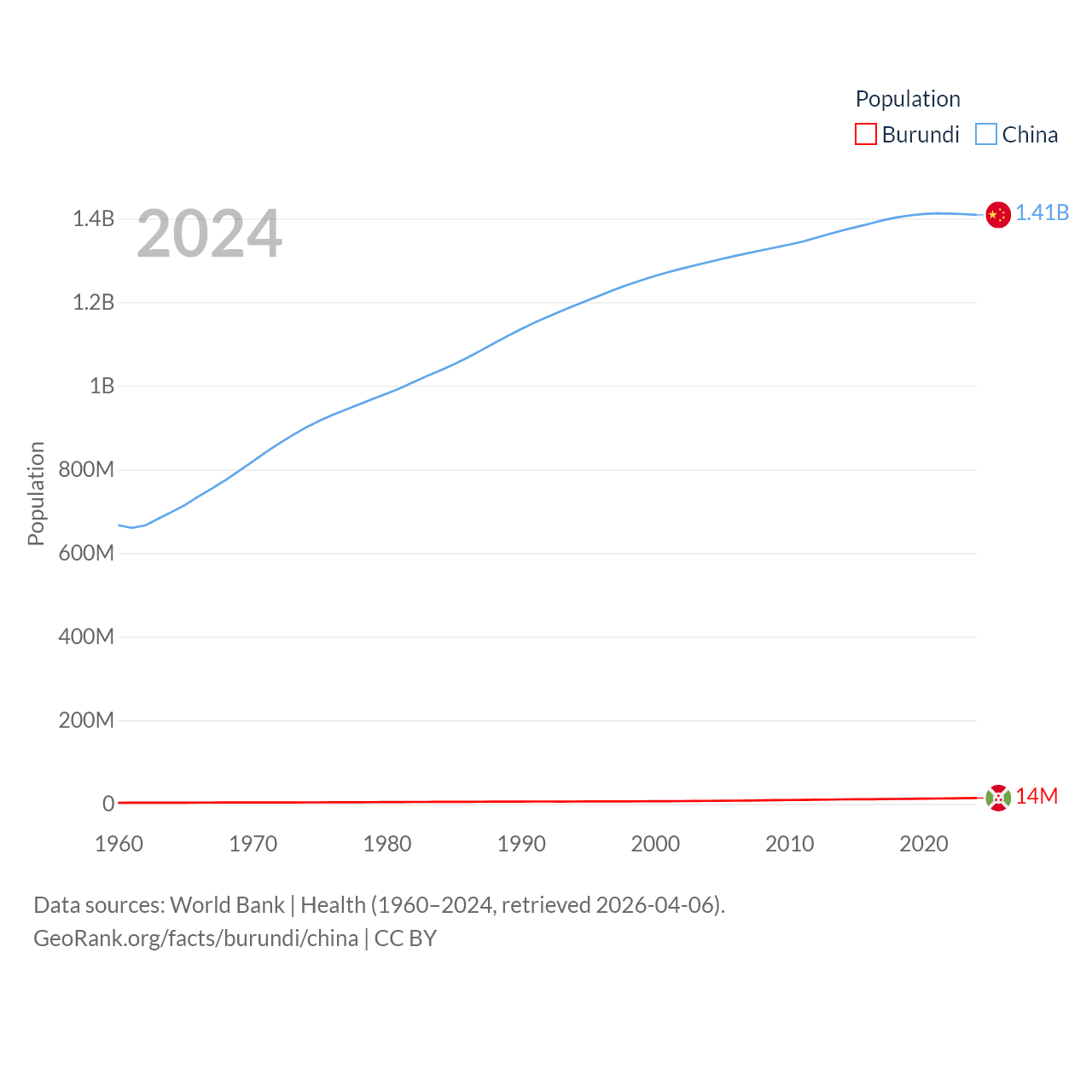 Burundi has a population of 14M (ranked 78/197), compared with 1.41B in China (ranked 2/197). Burundi's land area is 9,915 sq mi versus 3,624,808 sq mi for China (ranked 144th vs. 2nd).