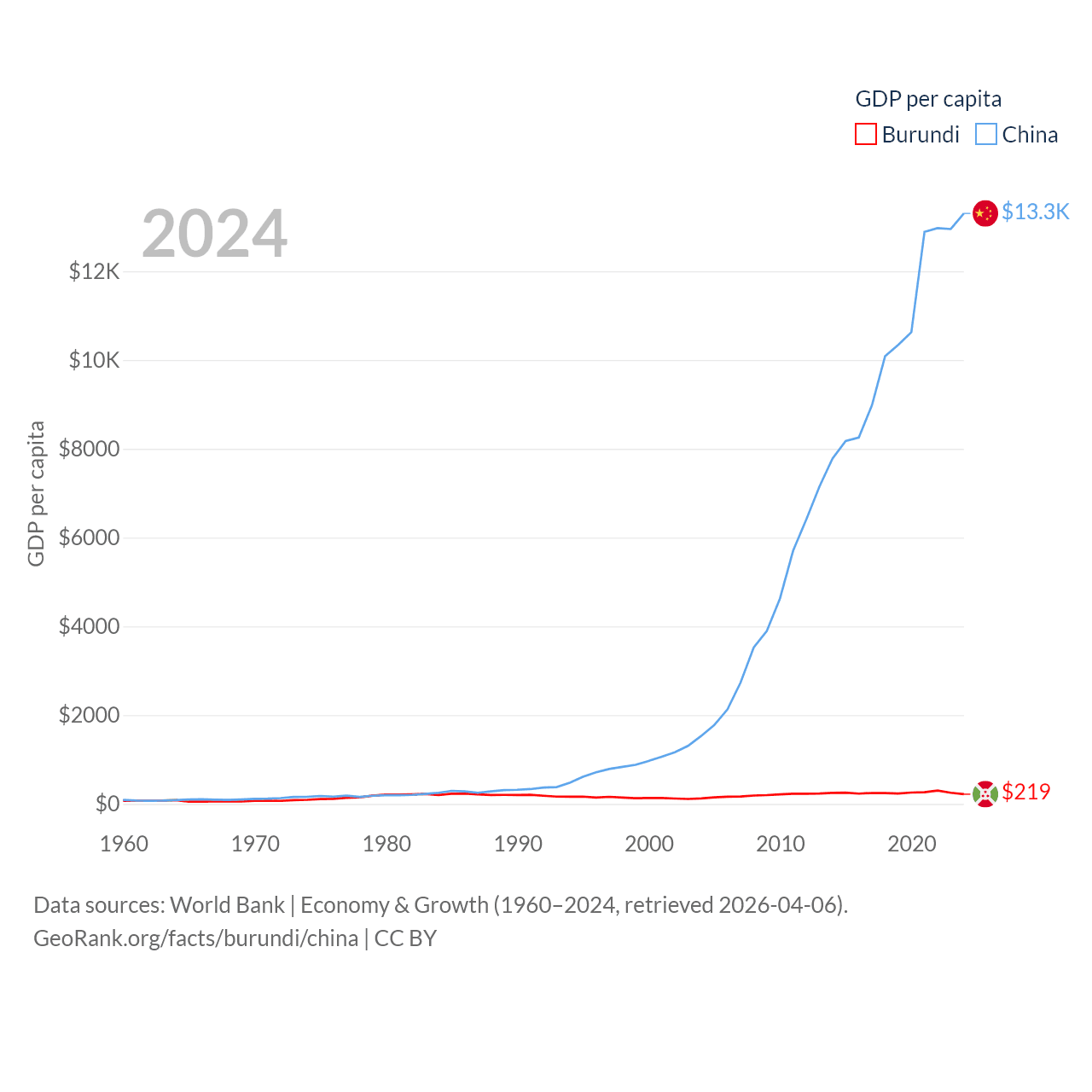 By GDP, Burundi ranks 169/197 ($3.08B) and China ranks 2/197 ($18.7T). By GDP per capita, Burundi ranks 197/197 ($219.4), while China ranks 76/197 ($13,303).