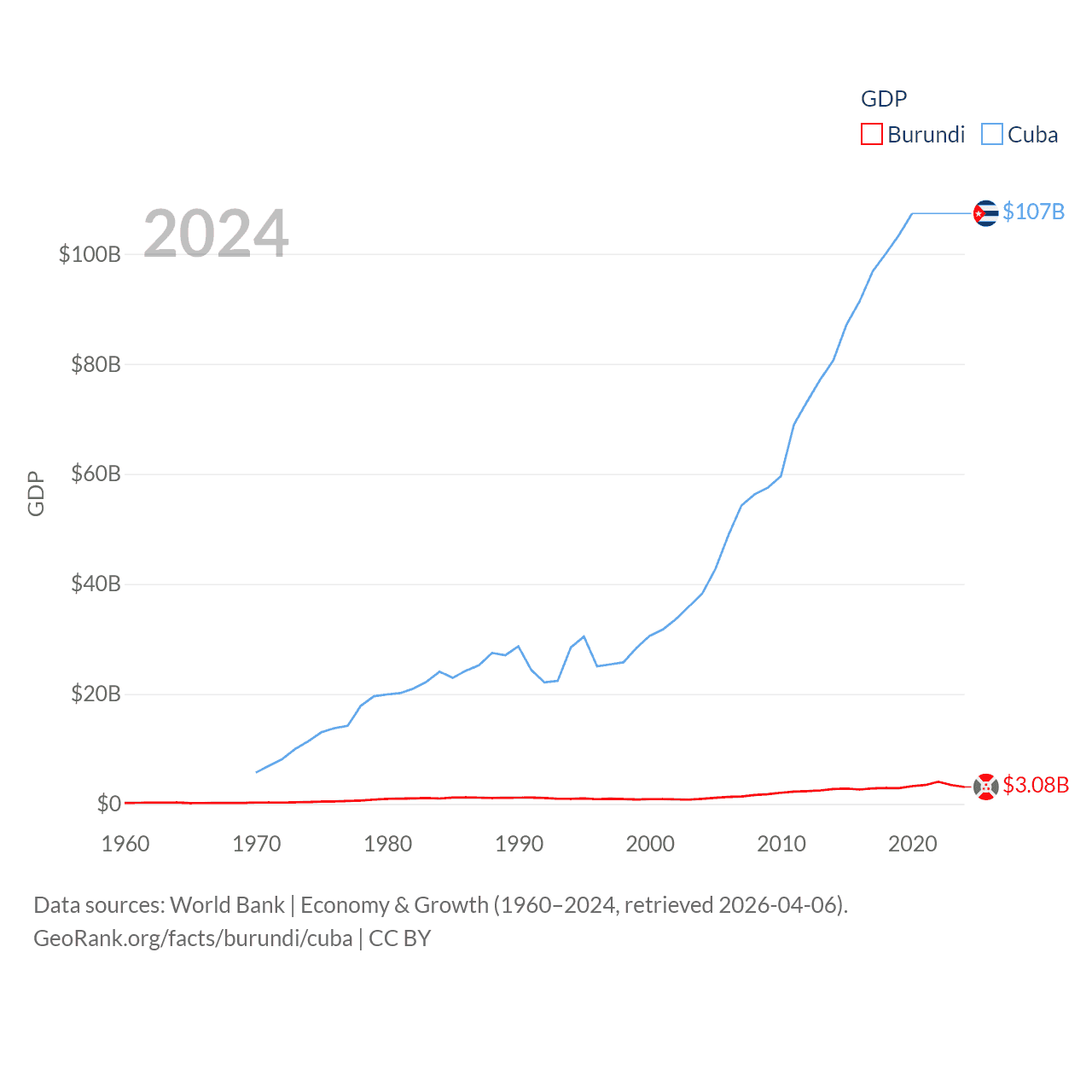 By GDP, Burundi ranks 169/197 ($3.08B) and Cuba ranks 69/197 ($107B). By GDP per capita, Burundi ranks 197/197 ($219.4), while Cuba ranks 86/197 ($9,605).