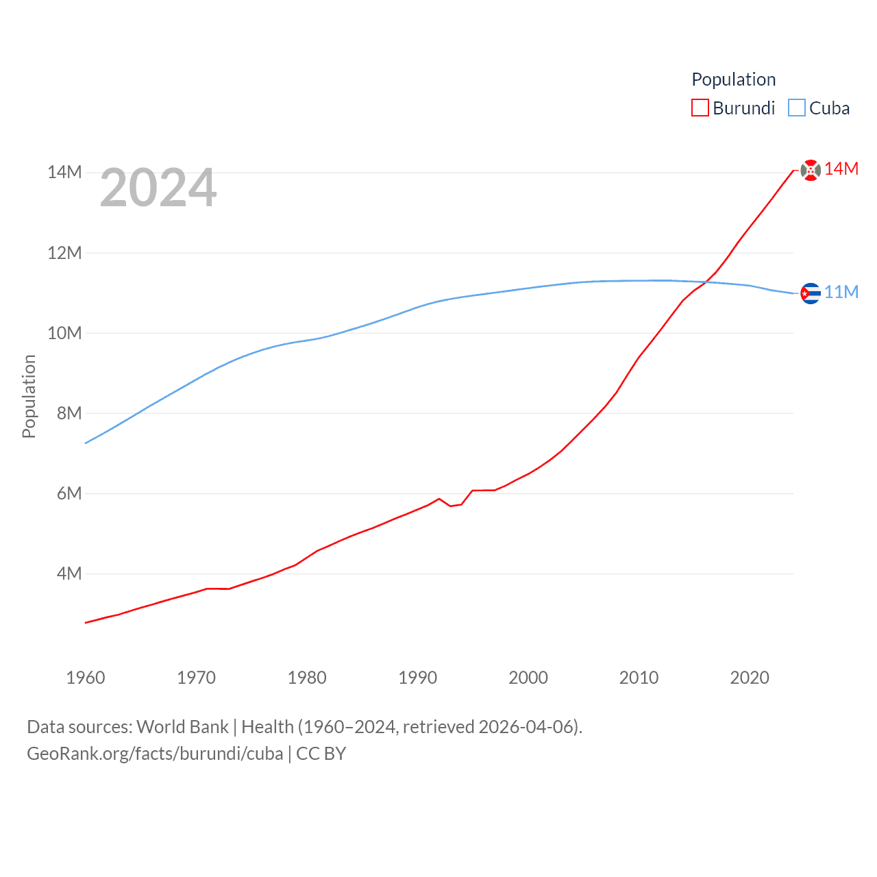 Burundi has a population of 14M (ranked 78/197), compared with 11M in Cuba (ranked 87/197). Burundi's land area is 9,915 sq mi versus 40,077 sq mi for Cuba (ranked 144th vs. 103rd).