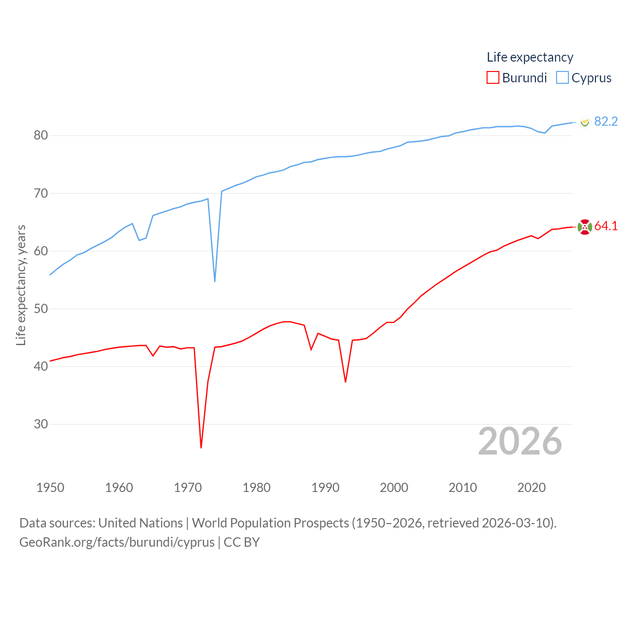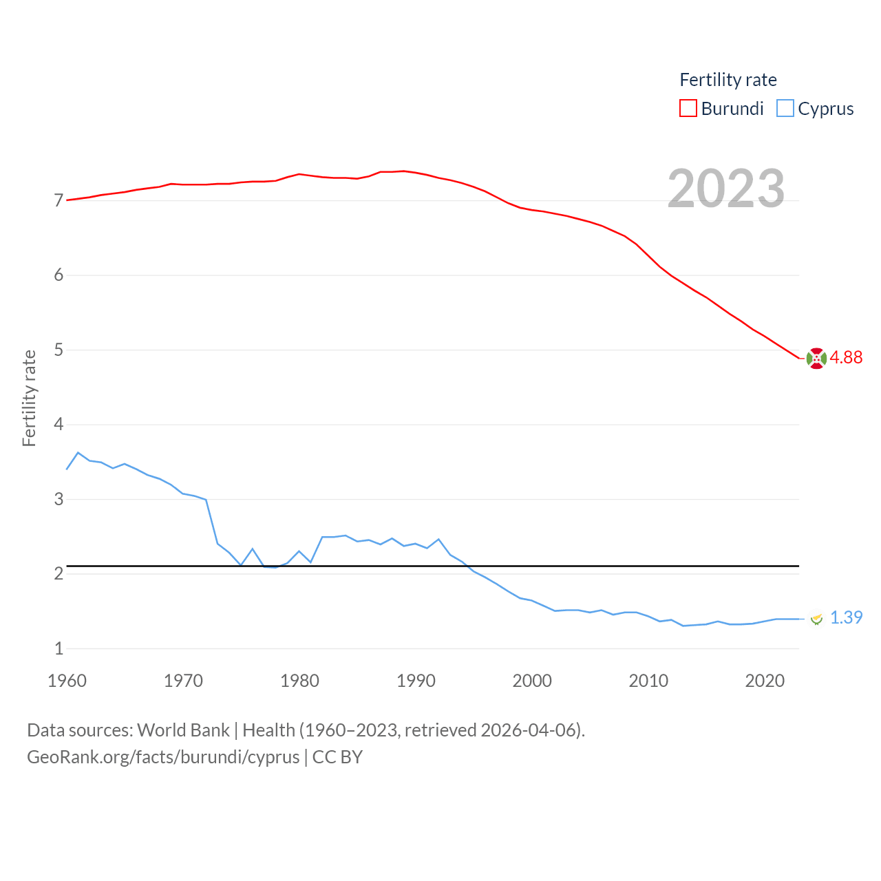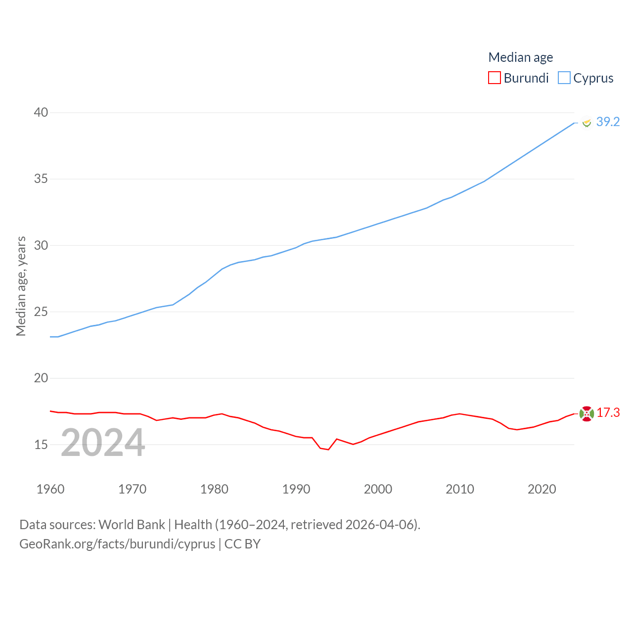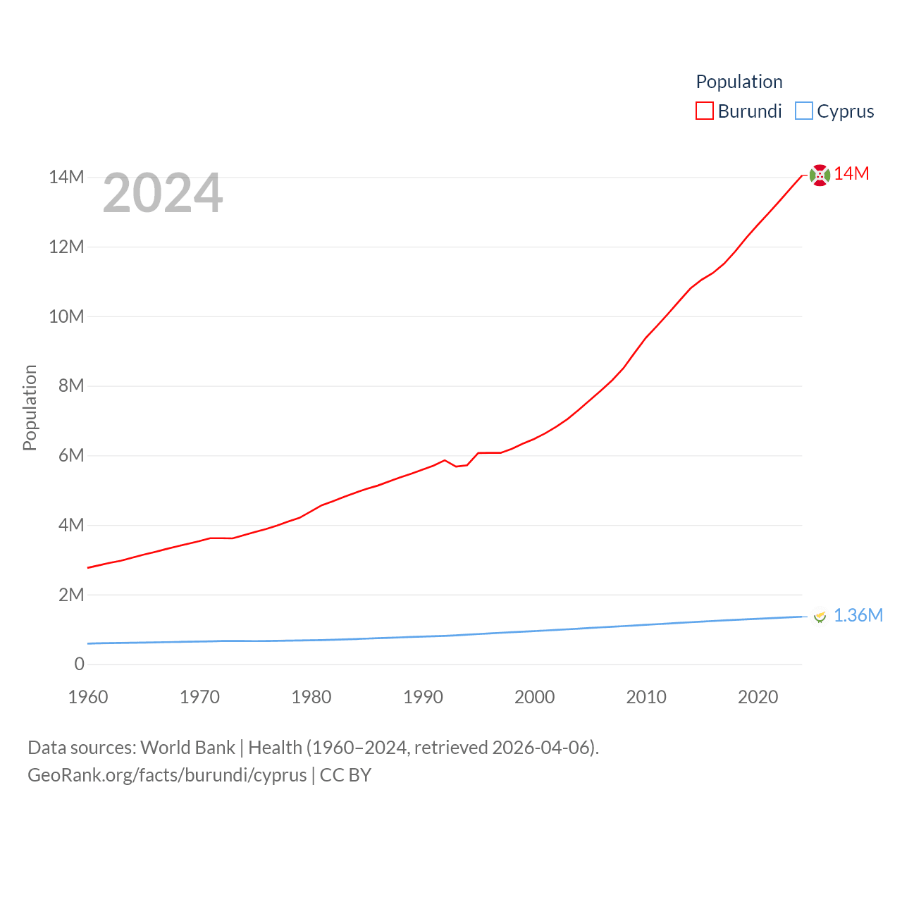 Burundi has a population of 14M (ranked 78/197), compared with 1.36M in Cyprus (ranked 155/197). Burundi's land area is 9,915 sq mi versus 3,568 sq mi for Cyprus (ranked 144th vs. 163rd).