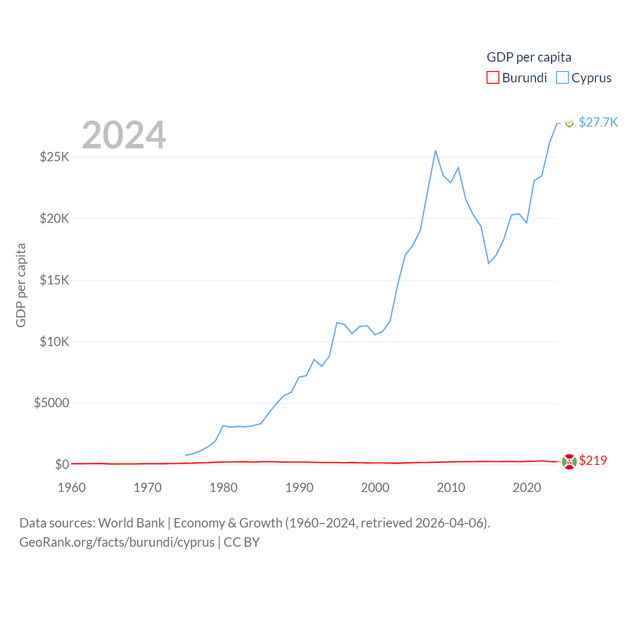 By GDP, Burundi ranks 169/197 ($3.08B) and Cyprus ranks 103/197 ($37.6B). By GDP per capita, Burundi ranks 197/197 ($219.4), while Cyprus ranks 45/197 ($27,707).
