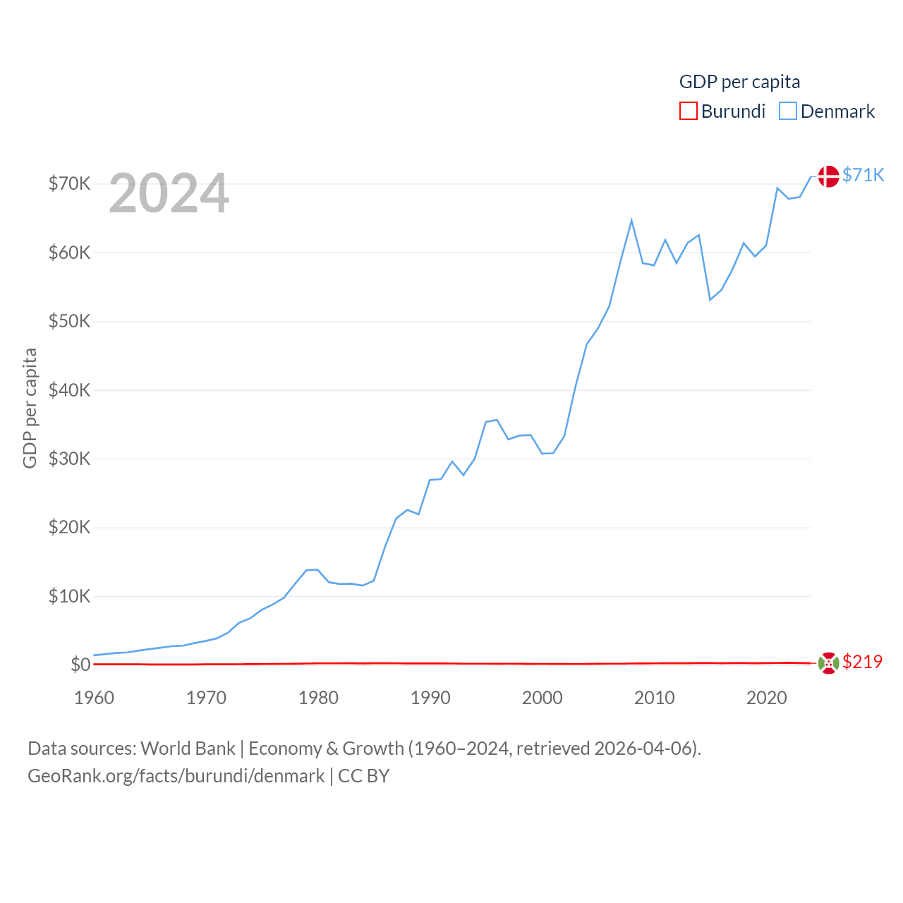 By GDP, Burundi ranks 169/197 ($3.08B) and Denmark ranks 37/197 ($425B). By GDP per capita, Burundi ranks 197/197 ($219.4), while Denmark ranks 12/197 ($71,026).