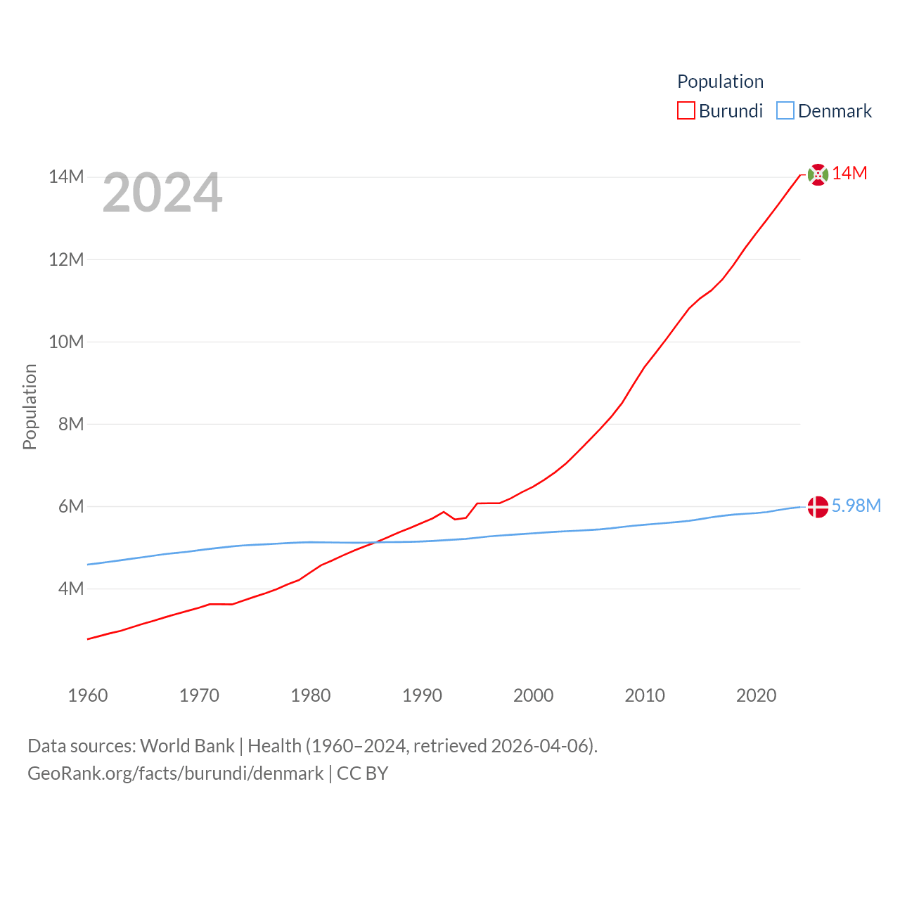 Burundi has a population of 14M (ranked 78/197), compared with 5.98M in Denmark (ranked 114/197). Burundi's land area is 9,915 sq mi versus 15,444 sq mi for Denmark (ranked 144th vs. 130th).