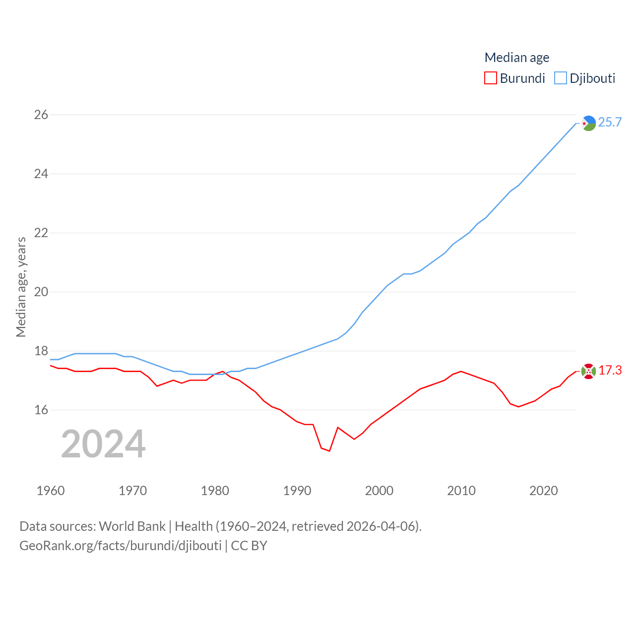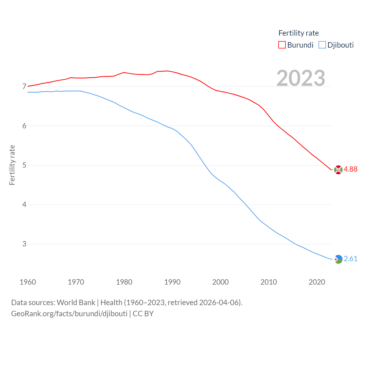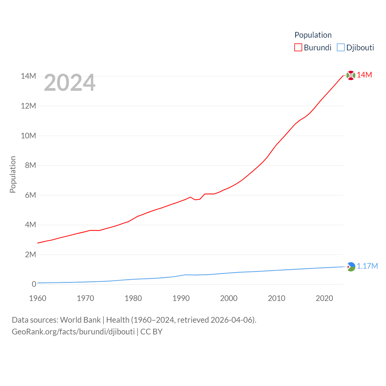 Burundi has a population of 14M (ranked 78/197), compared with 1.17M in Djibouti (ranked 158/197). Burundi's land area is 9,915 sq mi versus 8,950 sq mi for Djibouti (ranked 144th vs. 147th).