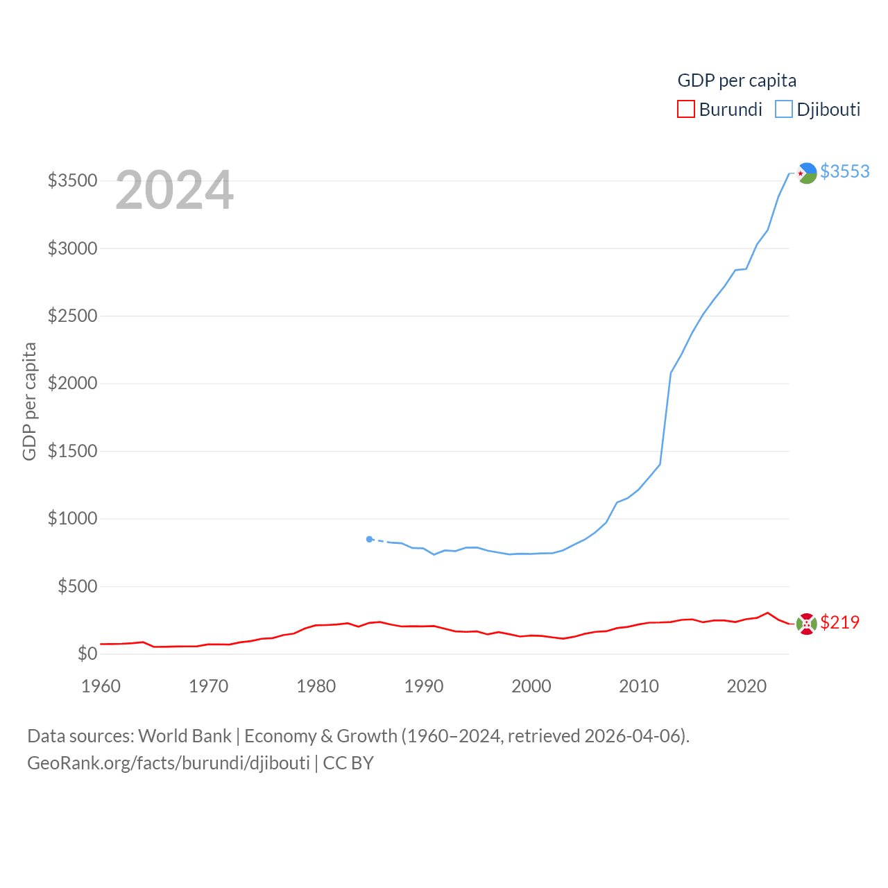 By GDP, Burundi ranks 169/197 ($3.08B) and Djibouti ranks 165/197 ($4.15B). By GDP per capita, Burundi ranks 197/197 ($219.4), while Djibouti ranks 133/197 ($3,553).